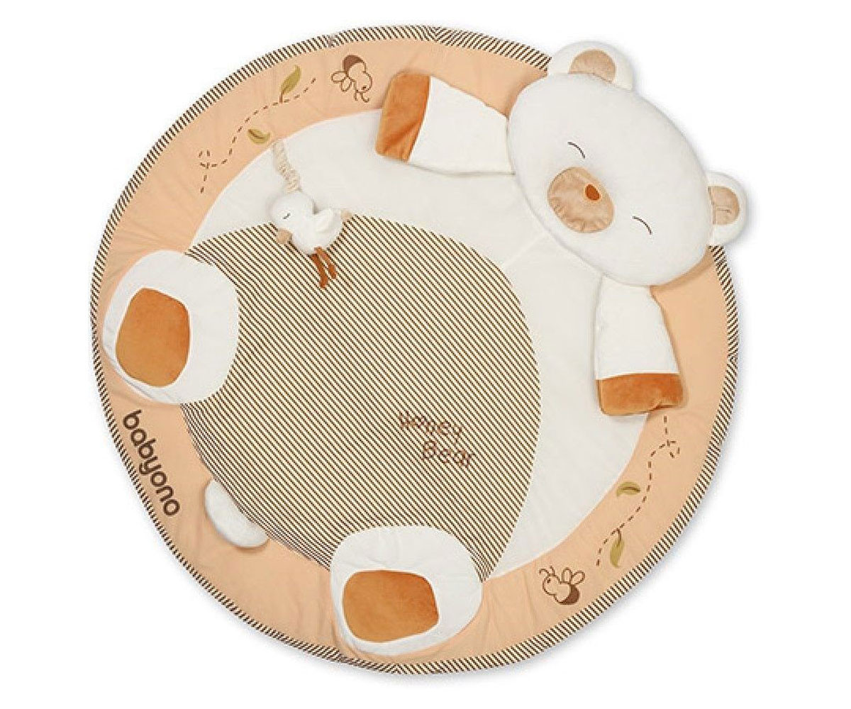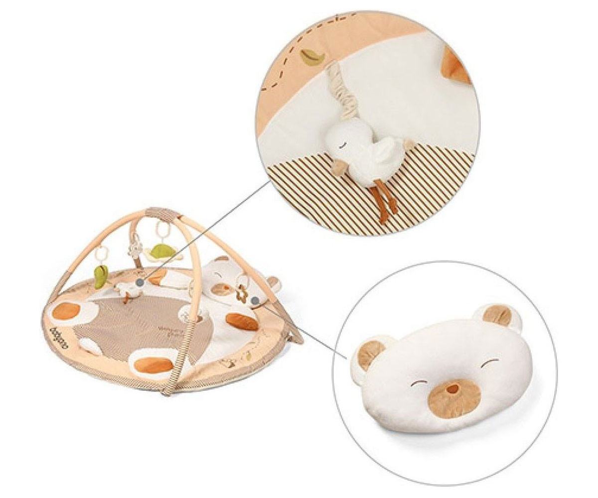 Активната гимнастика е идеална от първите седмици от живота на бебето. Комплектът включва атрактивни висящи играчки, които могат да ви помогнат да запазите концентрацията на бебето за дълго време и да го забавлявате. Лъките в нашата подложка за игра се движат и можете да ги свържете една с друга във всякаква конфигурация. Благодарение на това образователна постелка ще бъде подходяща и за по-големи седящи деца. Можете да поставите играчки на различно разстояние от вашето бебе, като по този начин го насърчавате да играе. Постелката ще придружава Вашето бебе в ранните етапи от растежа му. Първоначално бебето ще го използва, за да лежи по гръб, а след това по корем. Когато порасне и започне да седи и пълзи, постелката ще служи като килим и ще се превърне в уютна детска площадка. Можете да прикрепите панделки към килимчето чрез удобна катарама, разположена в долната част на продукта.