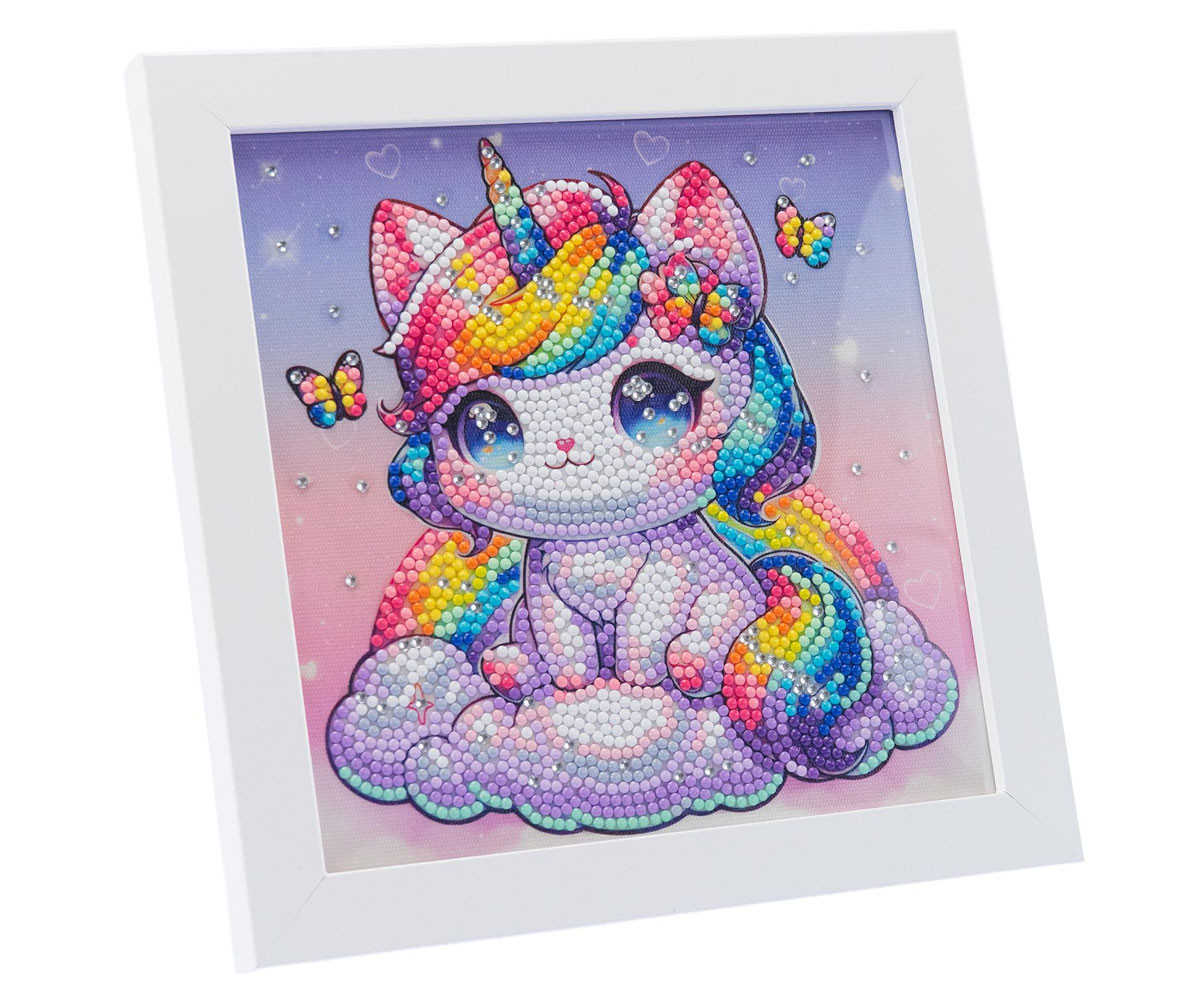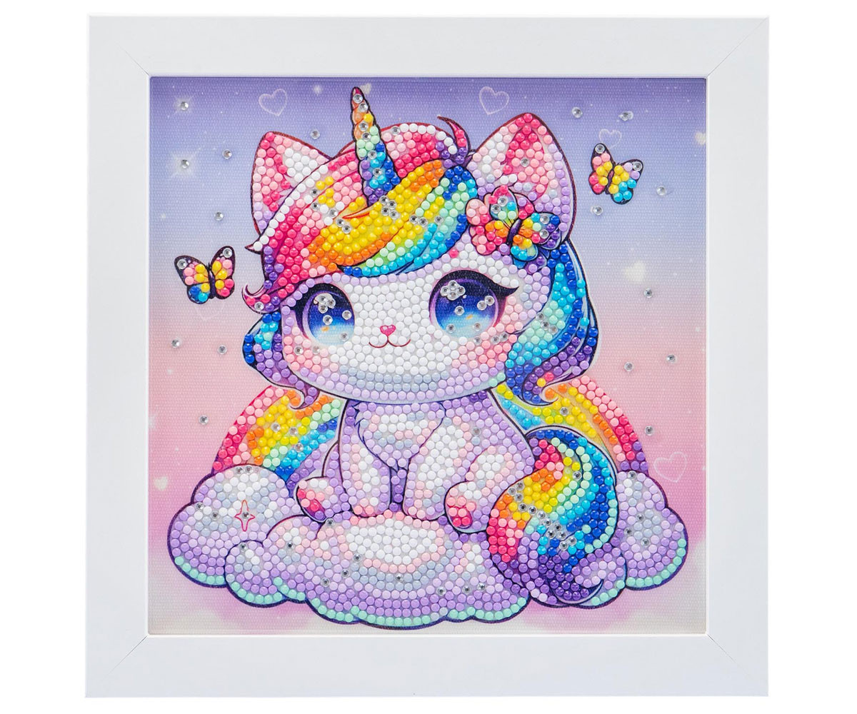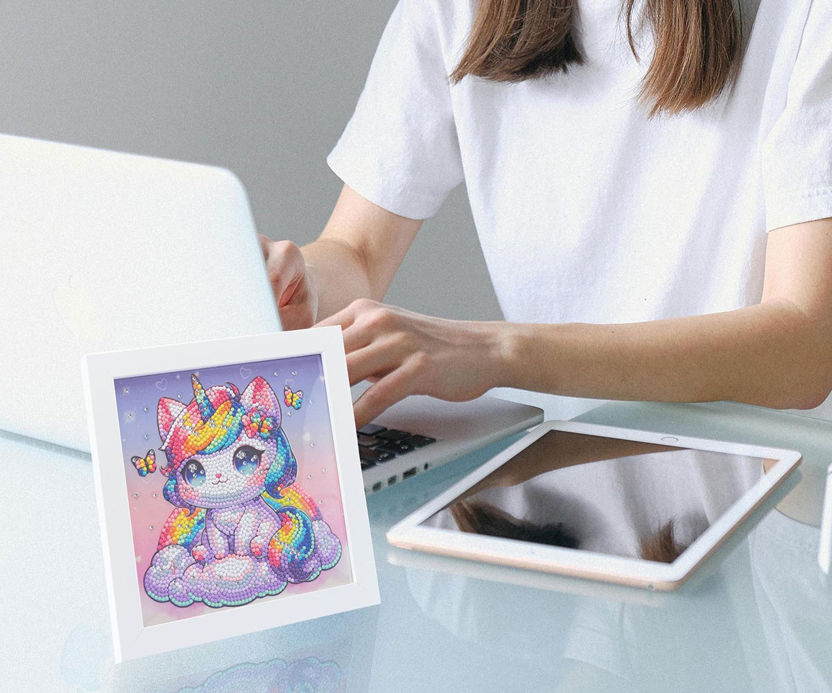 Diamantiny става Kawaii! Забавни изображения на сладки еднорози върху платно, готово за поставяне в рамката, включена в комплекта.