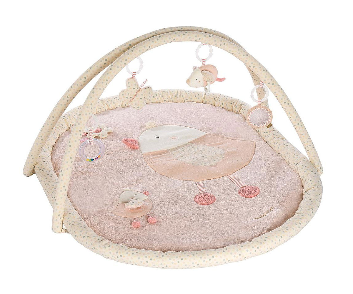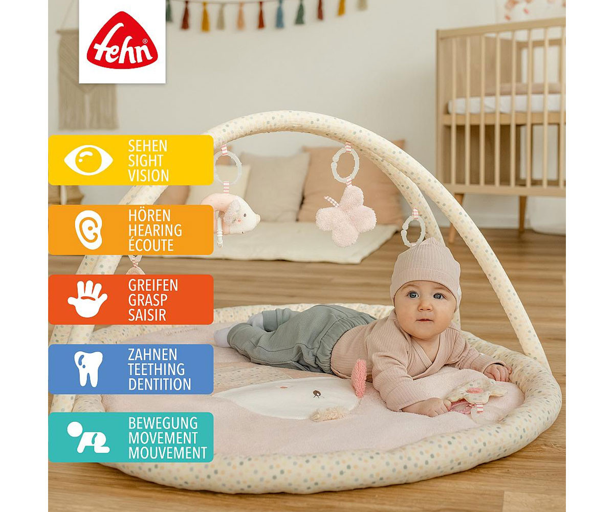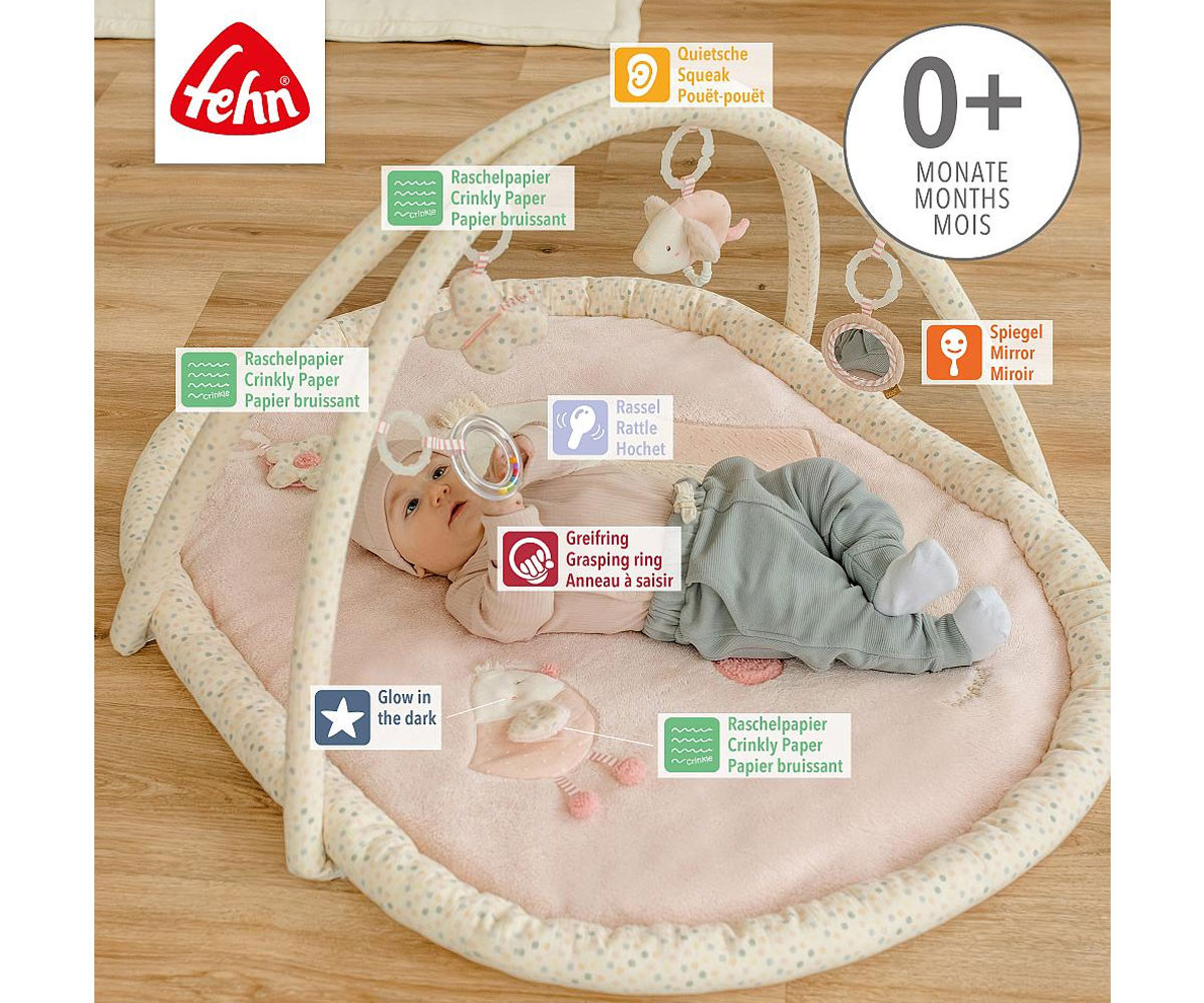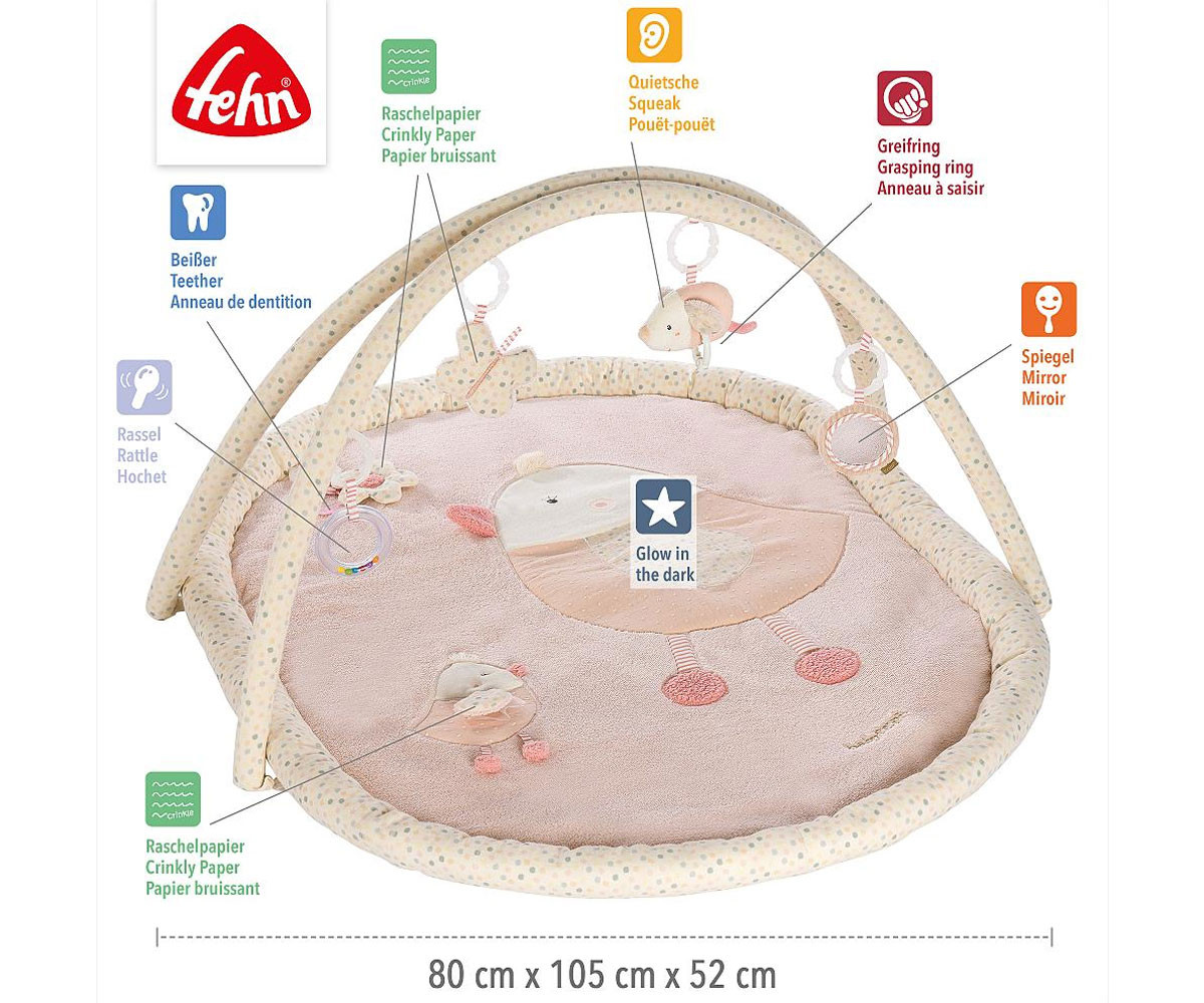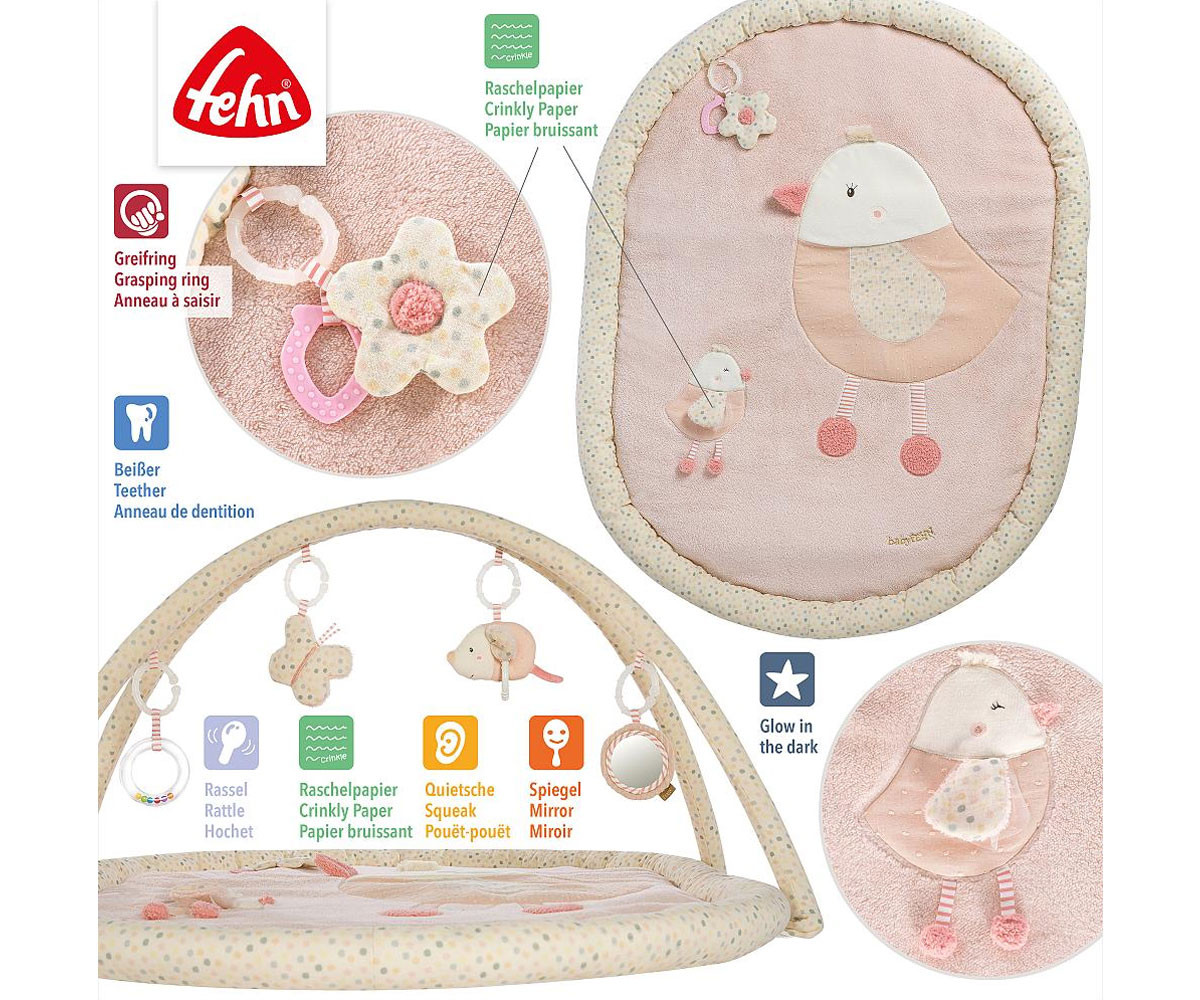 Активна гимнастика за игра „Птиче“ от колекцията feehnLAND с площ, изработена от различни материали и повърхности, кани бебето да пипа, гушка и играе. Чрез 3D фигурите на мишка и пеперуда на арката, тя допълнително стимулира усещането и координацията между ръка и око. Скритата пищялка в мишката, огледалото, гребенът и звънчето, шушулката в пеперудата и цветето повишават забавлението и концентрацията на бебето. Меката гризалка помага допълнително при никнене на зъбки. Освен това, допълнителни игрови възможности върху постелката стимулират слуховото възприятие, както и моториката на детето. Бродерията „Glow-in-the-dark“ свети в тъмното. С 3D активната постелка „Птиче“, бебето може да укрепва мускулите на гърба и шията по забавен начин, докато играе, лежи, пълзи или седи.