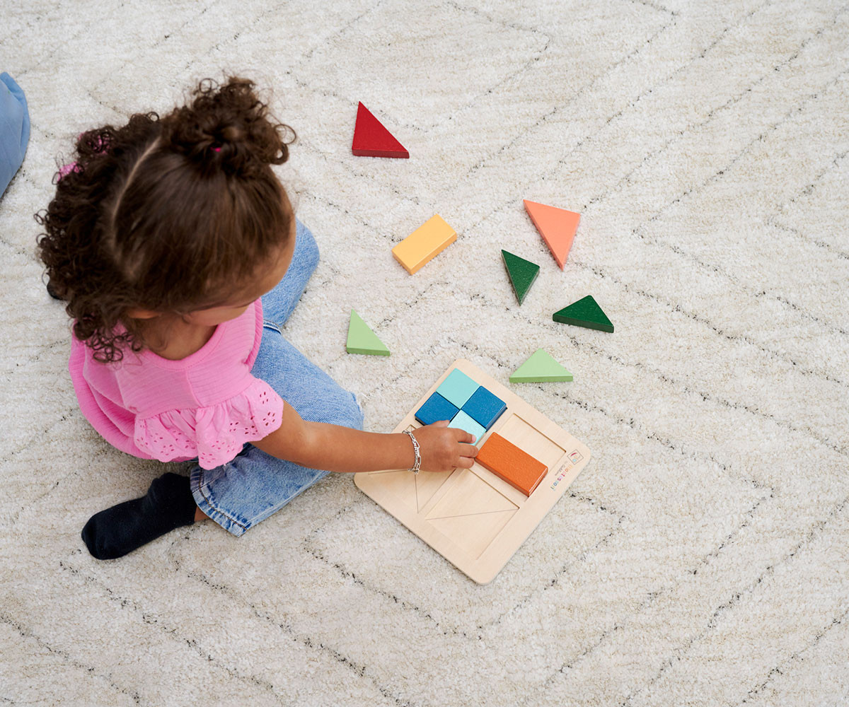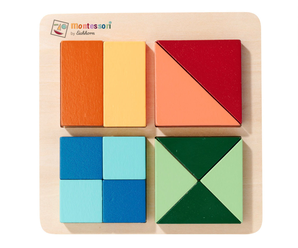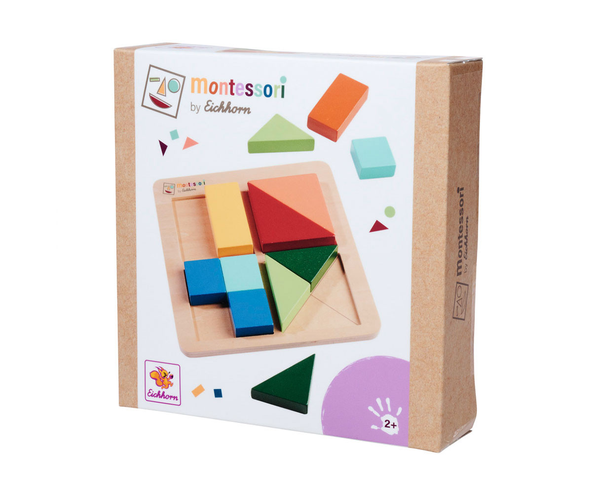 Монтесори пъзелът с форми е не само визуално привлекателен, но и изключително полезен за развитието на детето. Състои се от 12 пъзелни елемента с различни форми, чиято цел е да запълнят квадратните полета. Частите могат да се комбинират и смесват по цветове за по-голямо предизвикателство. Изработен е от 100% FSC сертифицирано брезово и липово дърво и е подходящ за деца над 2 години.