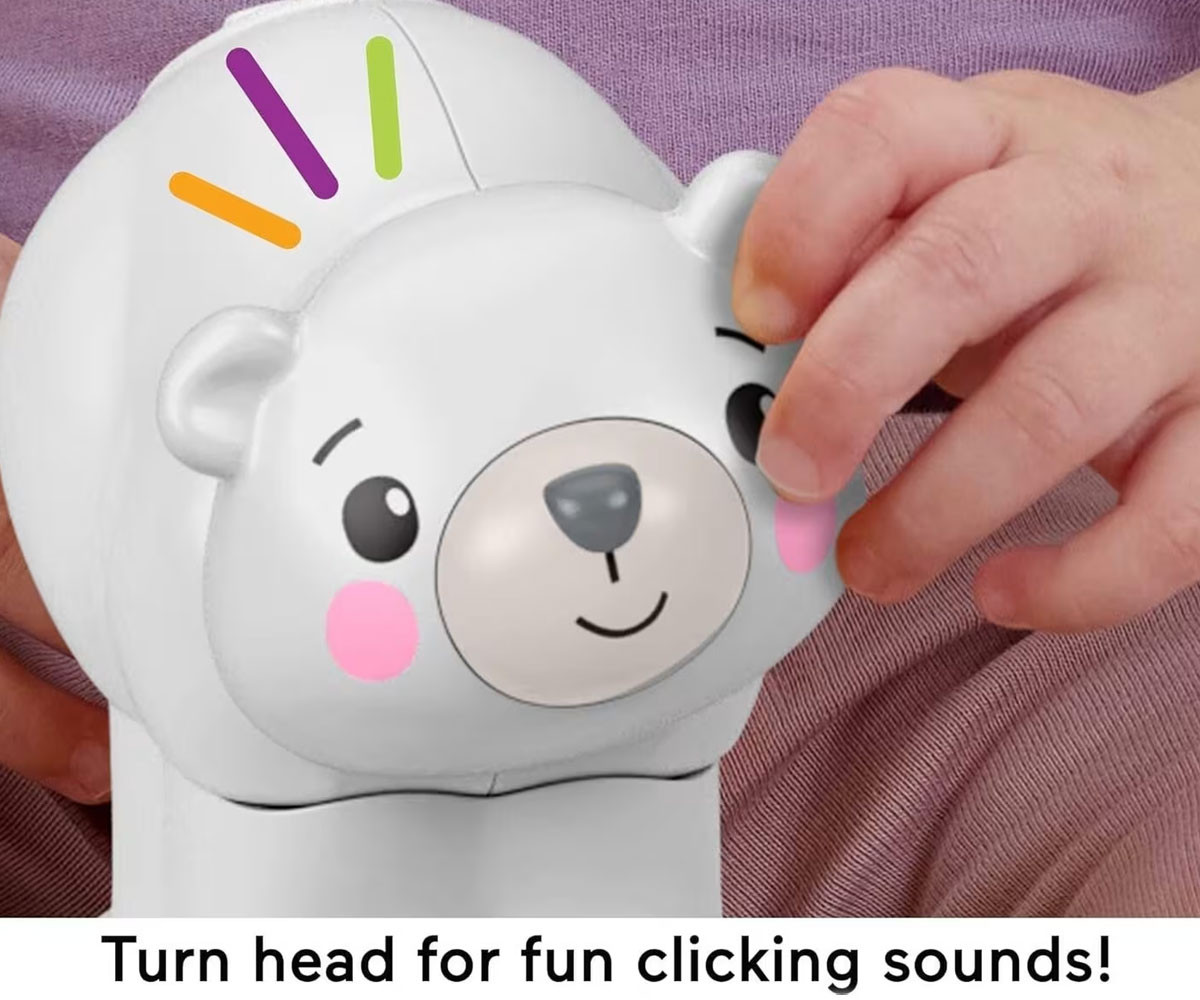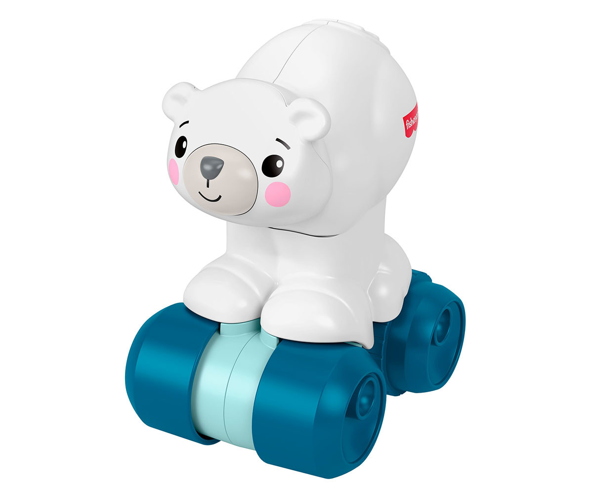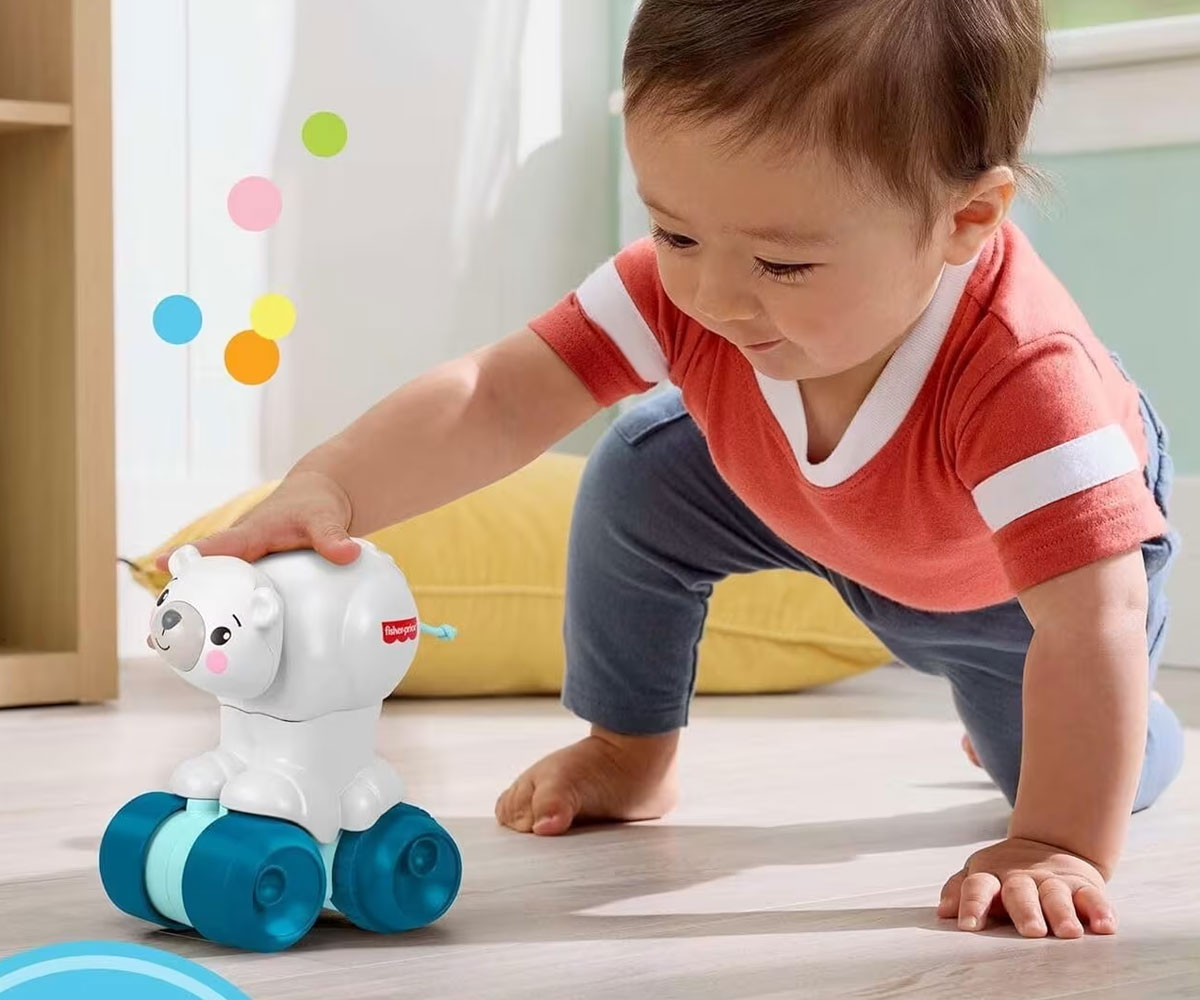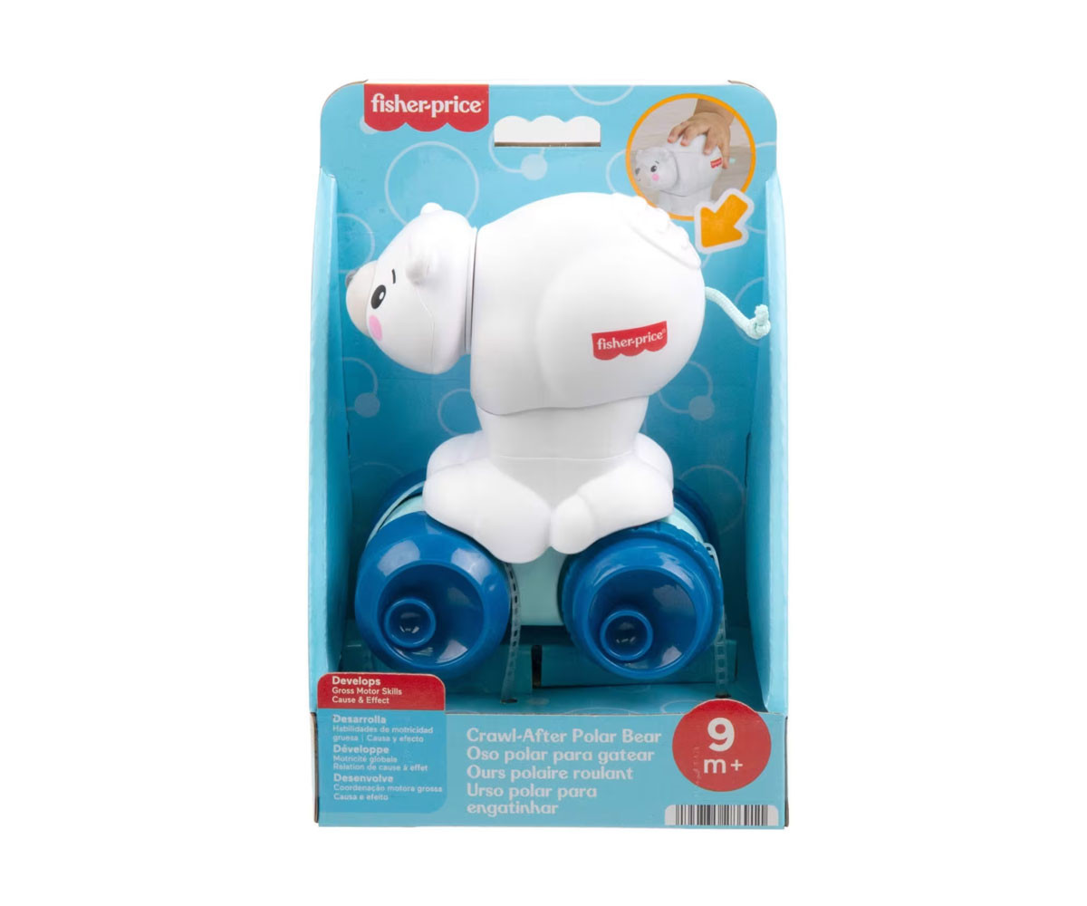 Играчката "Пълзи след мен – Полярно мече" от Fisher-Price насърчава бебето ви да започне да пълзи чрез вълнуващо движение и игра на гоненица. Просто натиснете тялото на мечето, за да го видите как се засилва напред, приканвайки малчугана да го последва. Тази забавна играчка разполага с текстилна опашка и щракаща глава, които стимулират сетивата и държат вниманието на бебето, докато то играе и изследва с ръчички. Цветовете и декорациите може да варират.