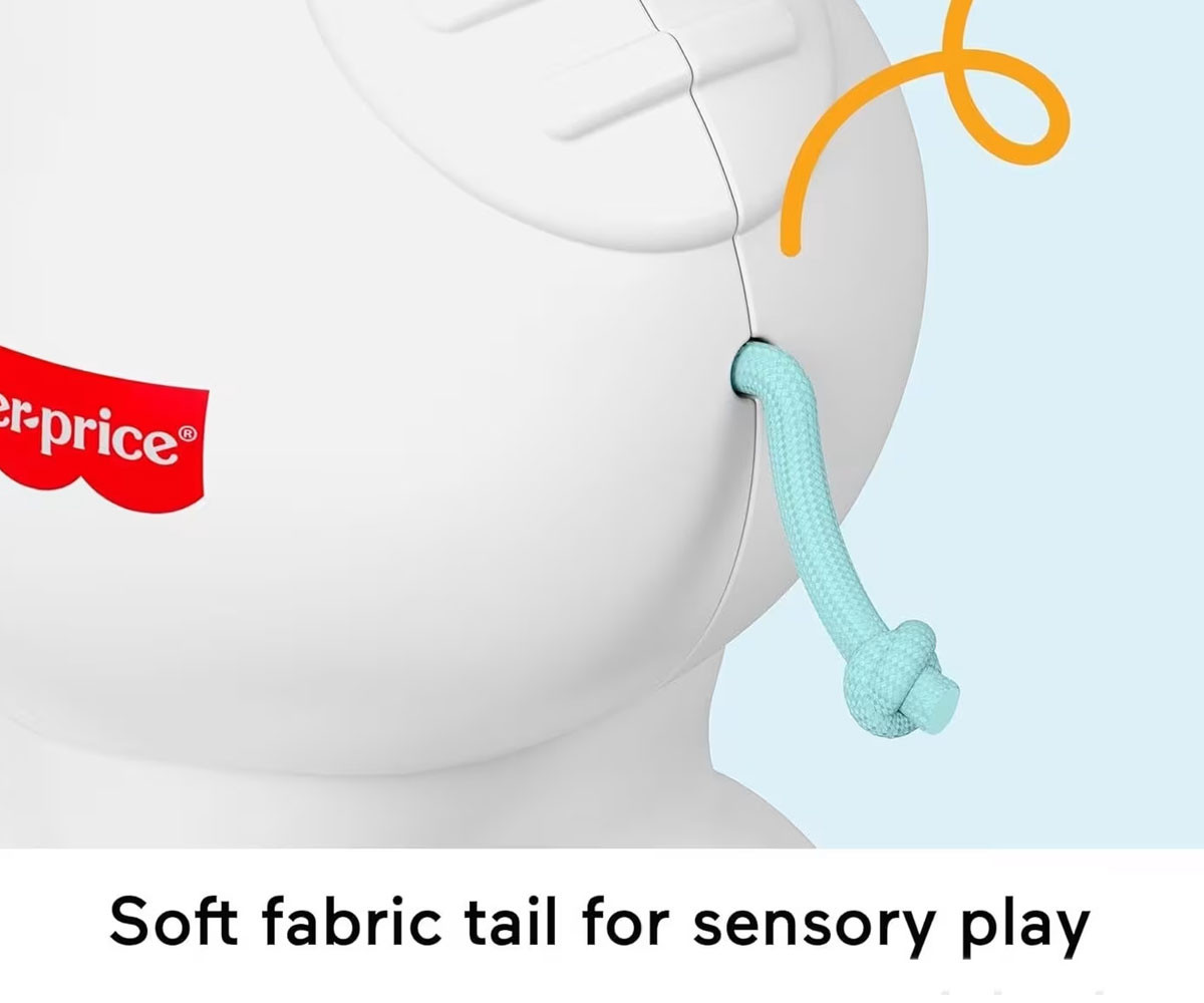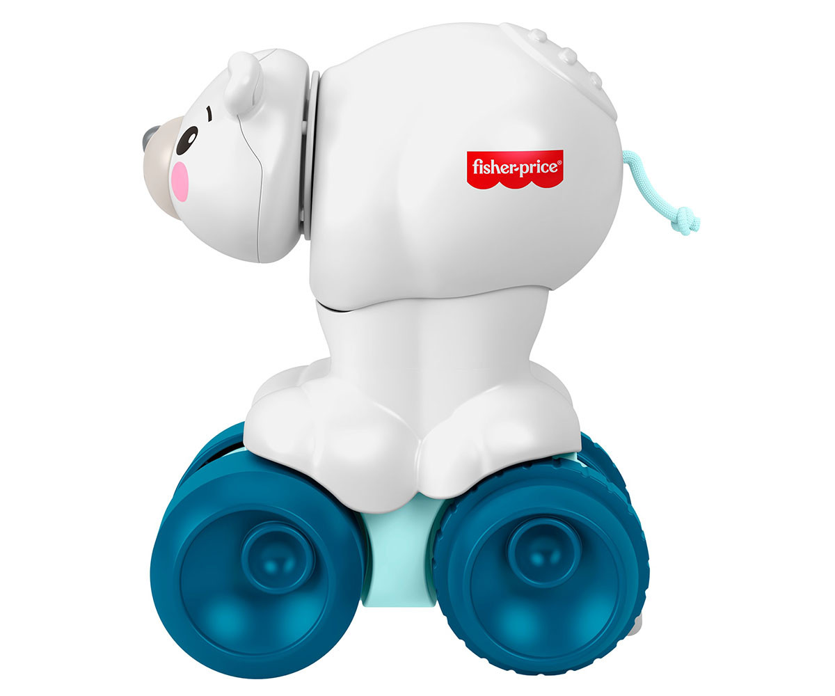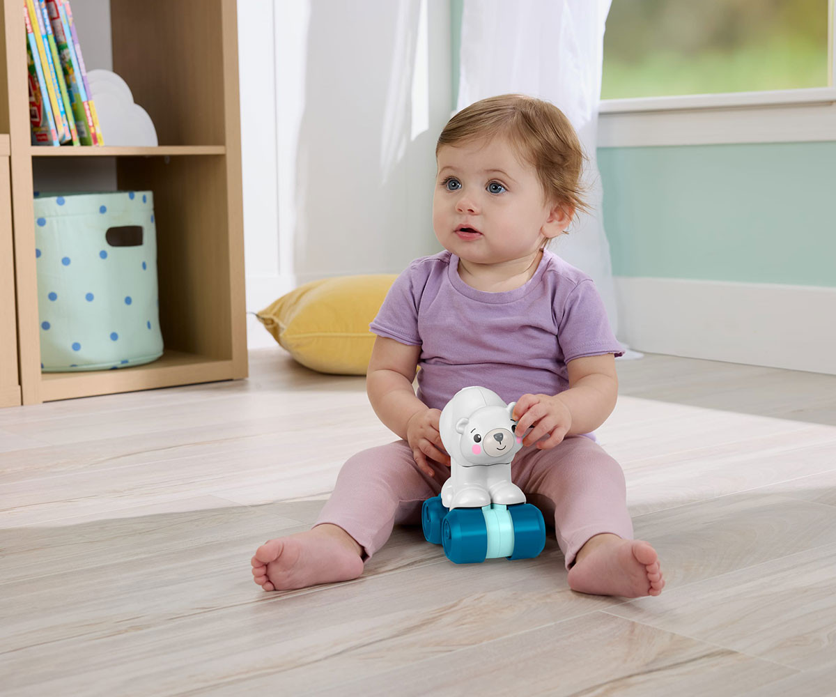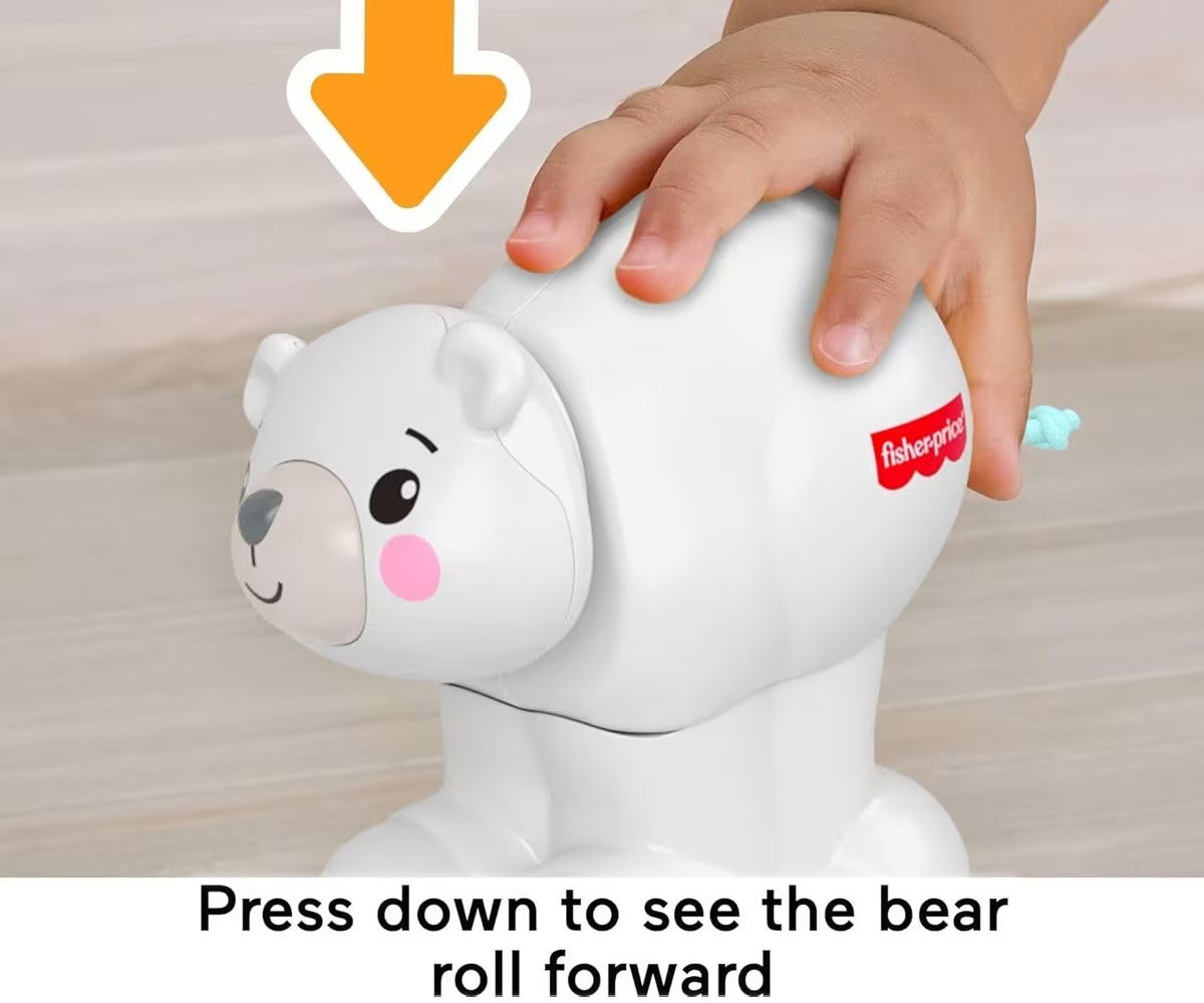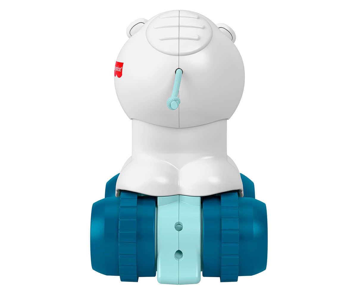 Играчката "Пълзи след мен – Полярно мече" от Fisher-Price насърчава бебето ви да започне да пълзи чрез вълнуващо движение и игра на гоненица. Просто натиснете тялото на мечето, за да го видите как се засилва напред, приканвайки малчугана да го последва. Тази забавна играчка разполага с текстилна опашка и щракаща глава, които стимулират сетивата и държат вниманието на бебето, докато то играе и изследва с ръчички. Цветовете и декорациите може да варират.
