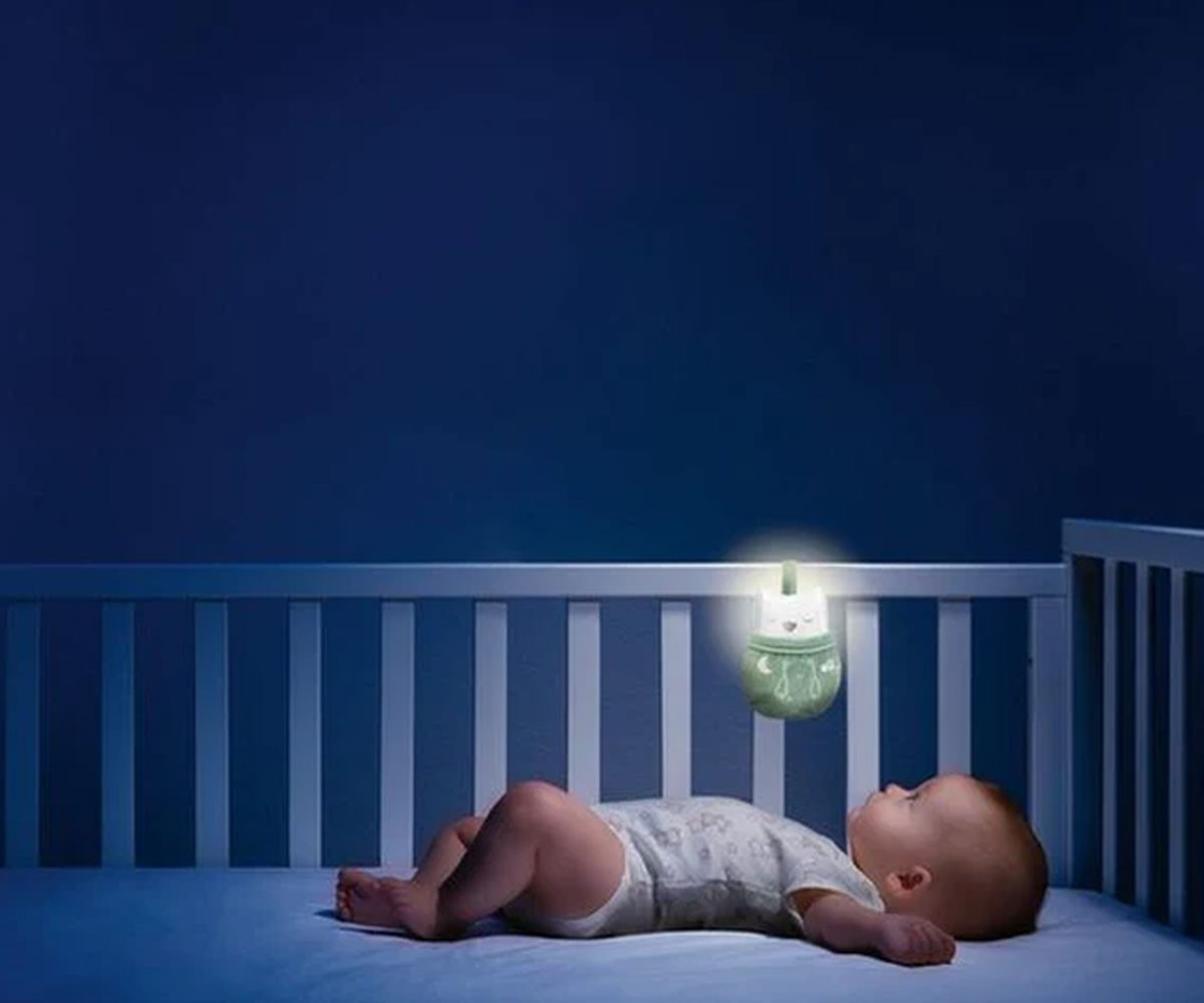 Първата иновативна електронна дрънкалка 2в1 с два режима: забавлява бебетата през деня и се превръща в нощна лампа за почивка на бебето.