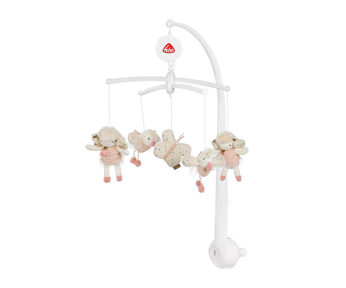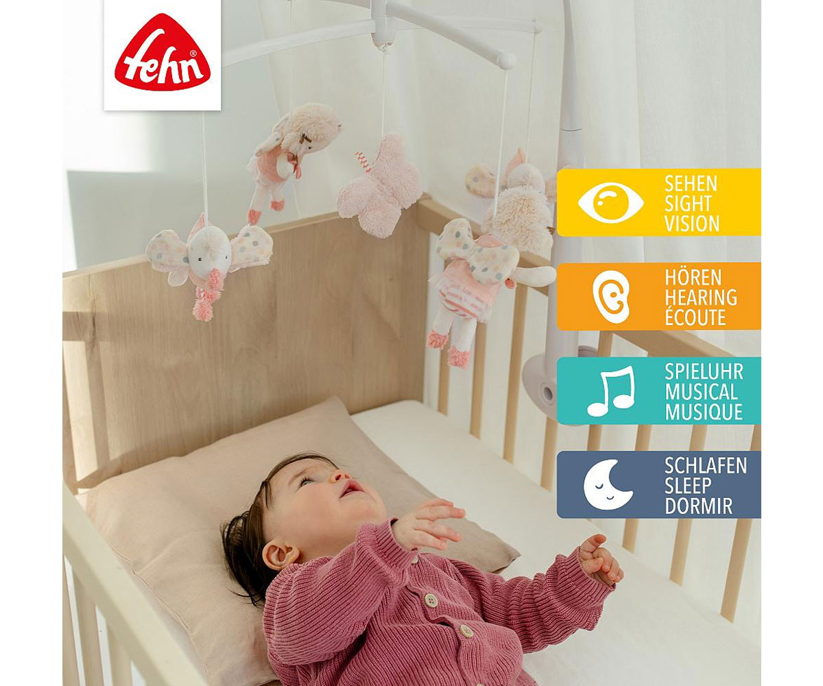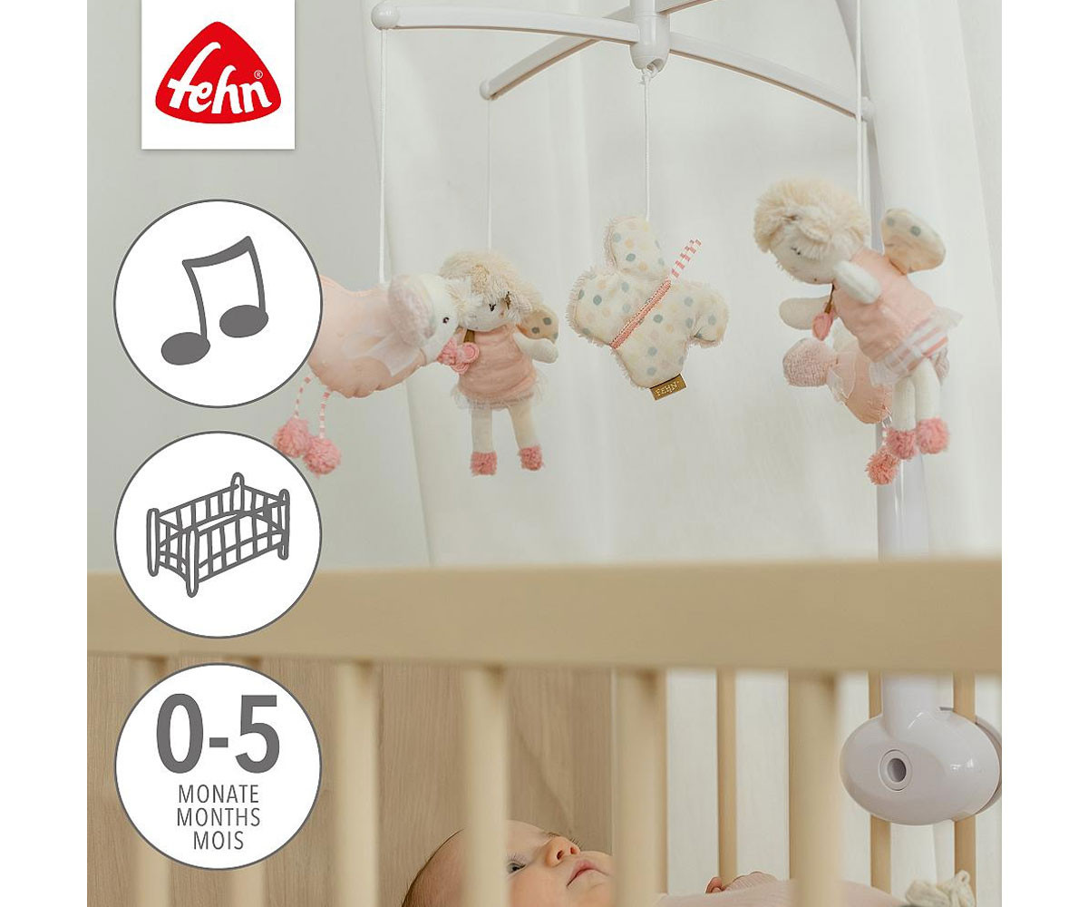 Очарователната музикална въртележка от колекцията feehnLAND е перфектен помощник за заспиване. Малките феи и животни се въртят около красивата мелодия „Знаеш ли колко звездички има“ и насърчават бебето да гледа и да слуша. Бродерията „Glow-in-the-dark“ свети в тъмното. В спокойни моменти механичният механизъм лесно може да бъде спрян благодарение на удобния превключвател за включване/изключване. През деня малките обитатели на feehnLAND въртележката осигуряват забавление: те привличат вниманието на бебето и събуждат въображението му. Въртележката се монтира лесно на детското легло и бързо става неразделна част от ежедневието!
