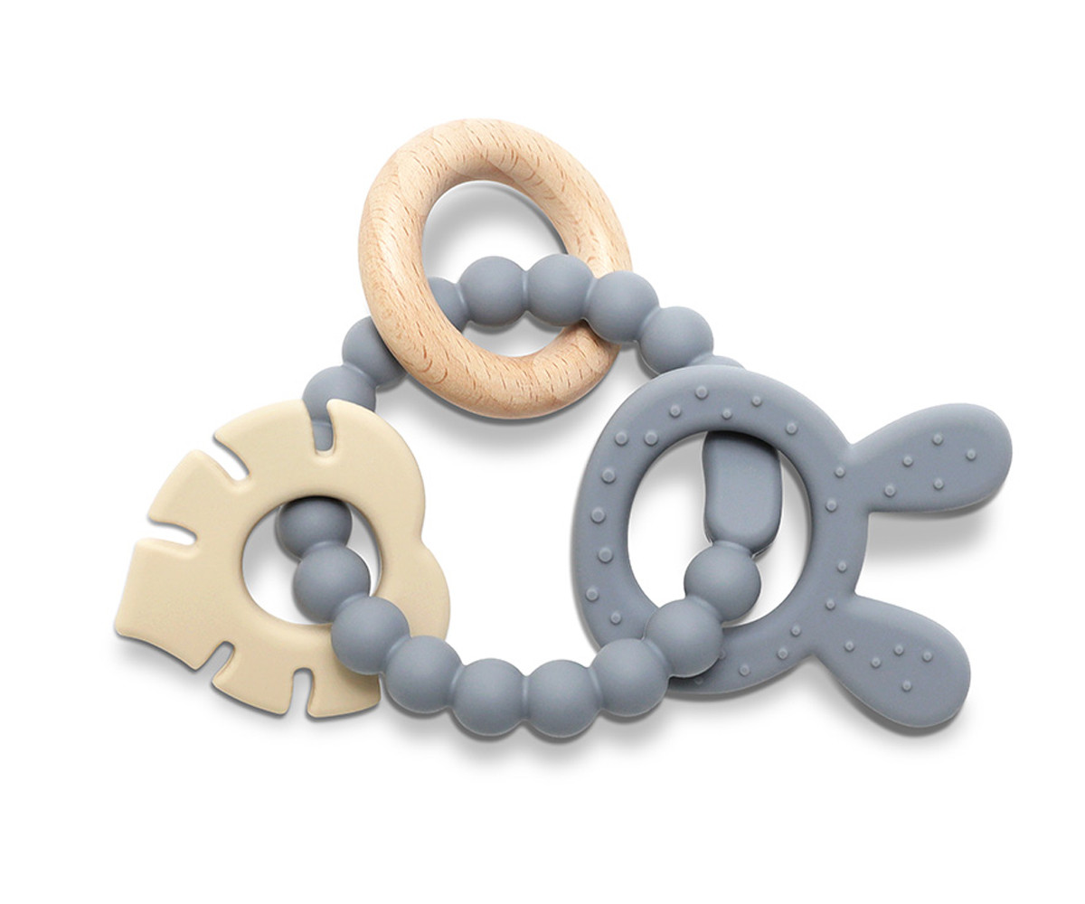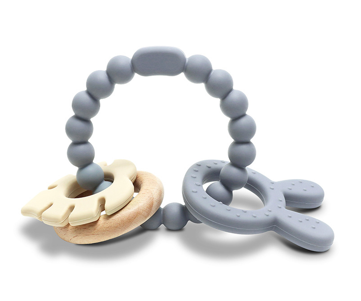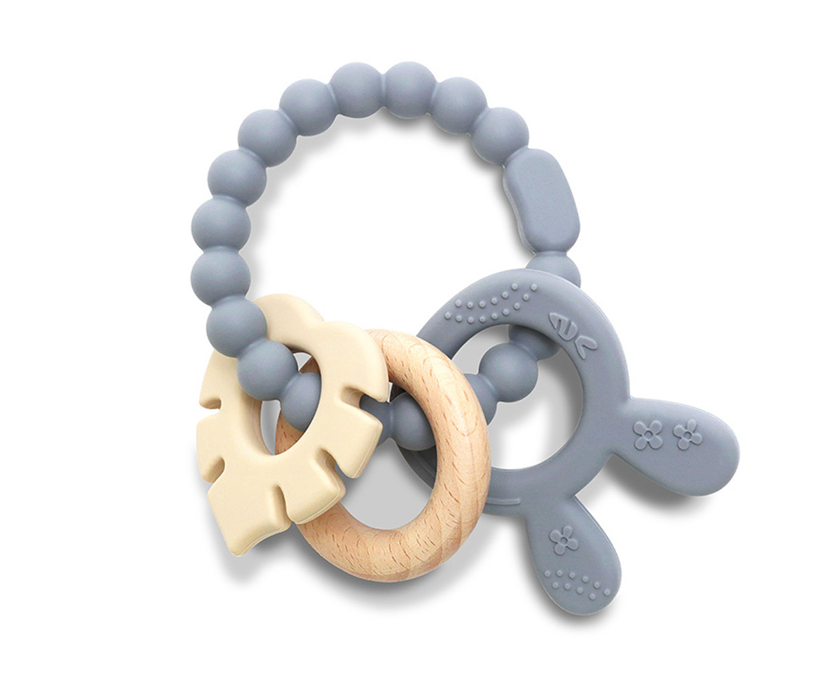 Изработена от силикон и букова дървесина. Перфектна за масажиране на нежните венци на бебето в периодa на растеж на млечните зъбки. Леснa за хващане.