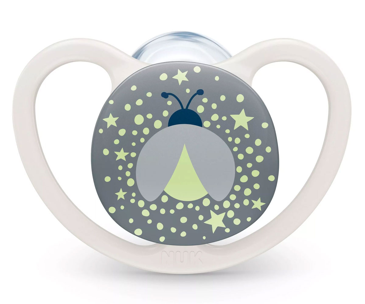 NUK Night - светеща в тъмното залъгалка, която помага на бебето по-лесно да открие своя път към Страната на сънищата. Благодарение на специалния светещ материал, безопасен за бебето, залъгалката излъчва нежна светлина и може лесно да бъде намерена през нощта. NUK Night силиконовата залъгалка е оформена като майчиното зърно по време на кърмене. Всеки ден за малкото бебе е изпълнен с нови и вълнуващи преживявания. В този свят на нови лица и звуци залъгалката е верен приятел, който носи сигурност и спокойствие. Сукането действа успокояващо и помага на детето да се почувства защитено. Формата ѝ е усъвършенствана така, че не само да осигурява комфорт, но и да бъде полезна за развитието. Залъгалката NUK е създадена с подобрена форма, която подпомага правилното развитие на челюстта. Тя е моделирана по естествения образец на майчиното зърно по време на кърмене и приляга оптимално към устата на бебето. Поради това бебетата я приемат много лесно.