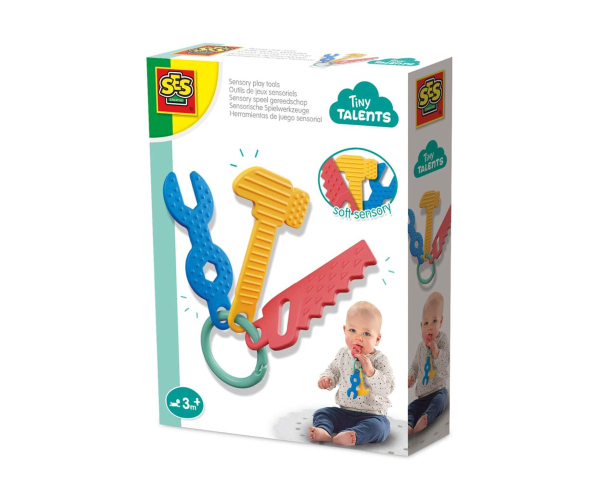 Позволете на вашето мъниче да открива нови текстури, форми и цветове с комплекта „Сензорни инструменти за игра“! Към пластмасов пръстен са прикрепени 3 меки инструмента: чукче, гаечен ключ и трион. Изработени са от безопасна и мека пластмаса в три контрастни цвята, подходящи за хващане и дори за поставяне в устата.