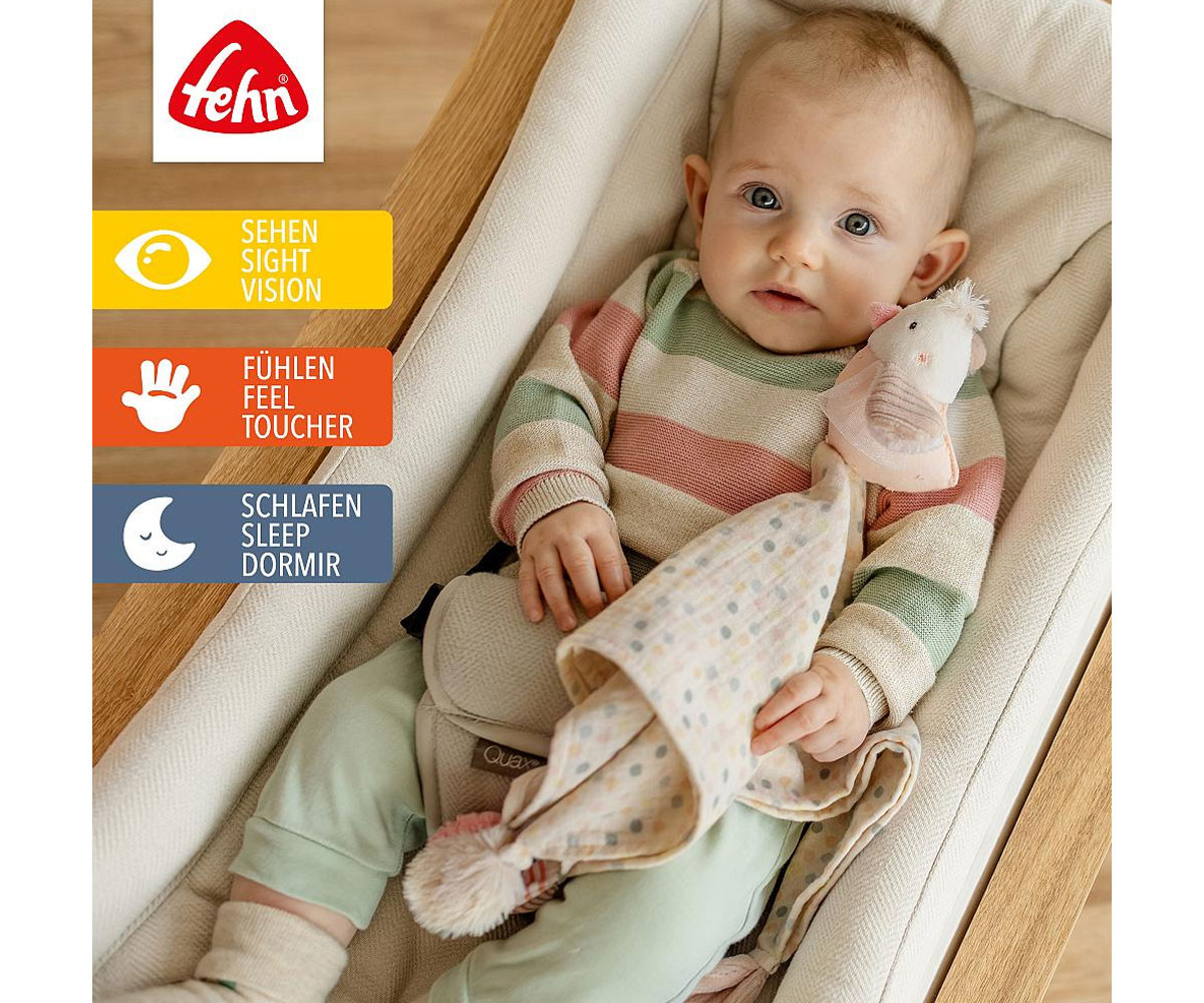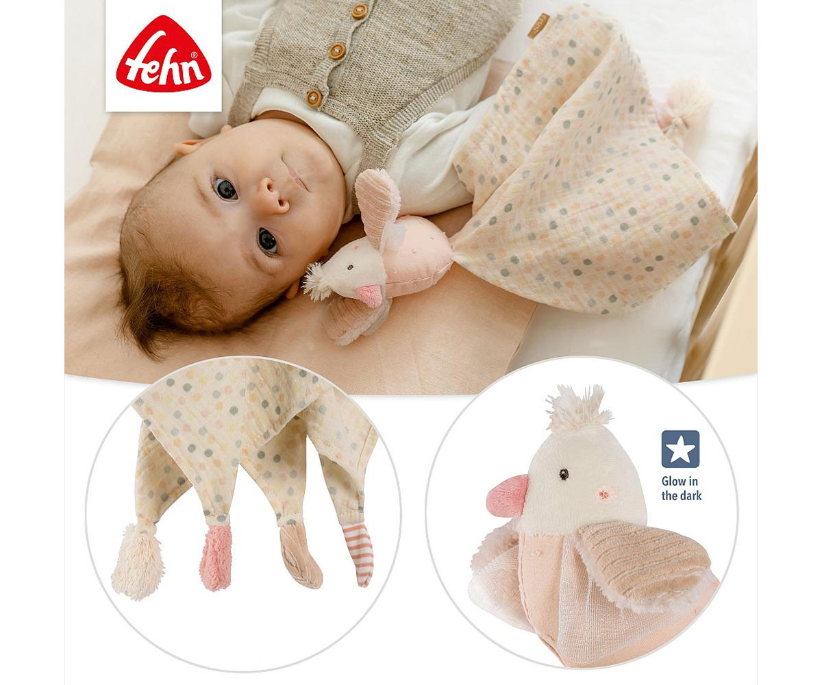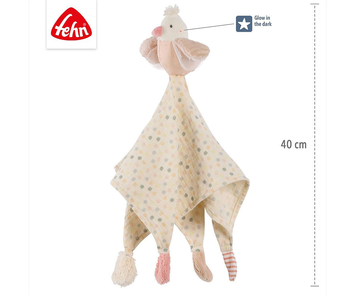 Очарователната птица с кърпа за гушкане от колекцията feehnLAND е помощник за заспиване и приятел за гушкане в едно. Малкото птиче обожава да се гушка и да бъде близо до бебето, като е верен спътник както у дома, така и на път. Елементите „Glow-in-the-dark“ на сладката птица помагат на бебето да се чувства спокойно при заспиване, премахвайки страха от тъмнината. Кърпичката от памучен муселин осигурява уют и сигурност при заспиването. Меката кърпичка, както и различните материали, канят към пипане, усещане и гушкане, така че малката птица скоро ще стане неразделна част от ръката на бебето.