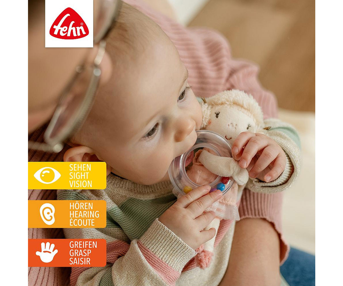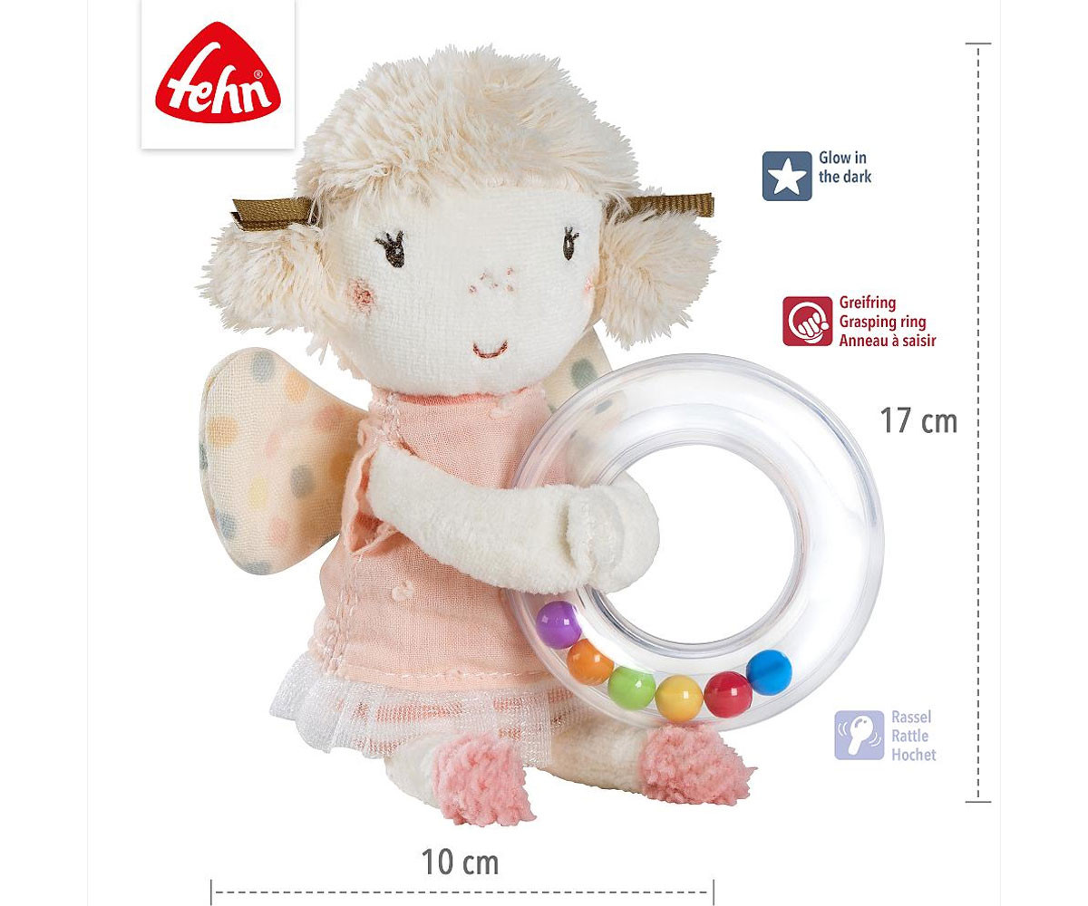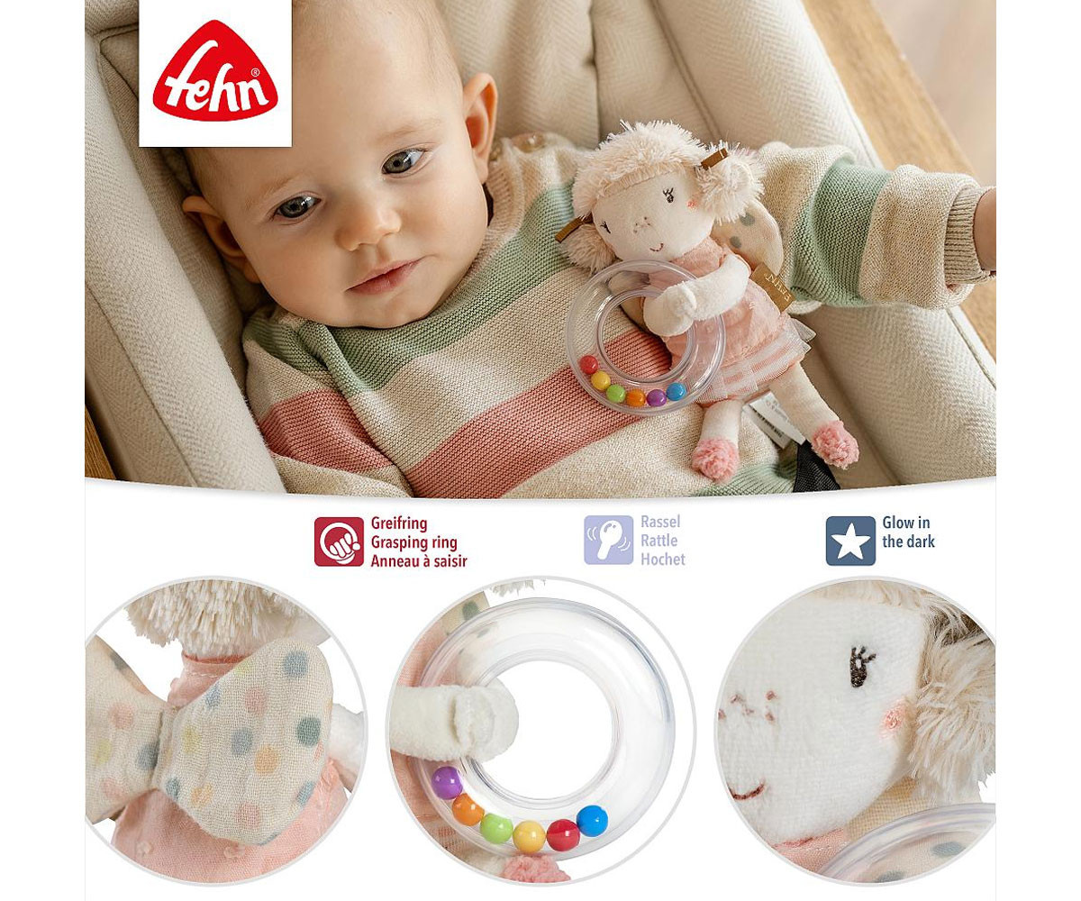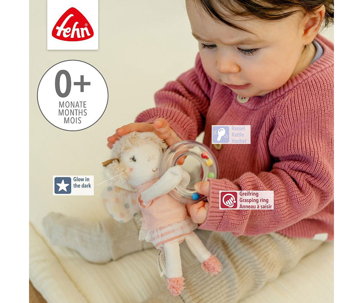 Дрънкака с ринг „Фея“ от колекцията feehnLAND може да се хваща, пипа и звъни, като по този начин стимулира интереса на бебето и го кани да открива и изследва. Дрънкалката играе с интересите на бебето и подпомага развитието на слуха, хващането, тактилното усещане и фината моторика, което я прави идеален подарък за раждане, кръщене или рожден ден. Бродерията „Glow-in-the-dark“ свети в тъмното. Малките откриватели бързо ще обикнат очарователната фея и ще я вземат със себе си навсякъде – вкъщи, на път, в кошчето за бебе или в количката!