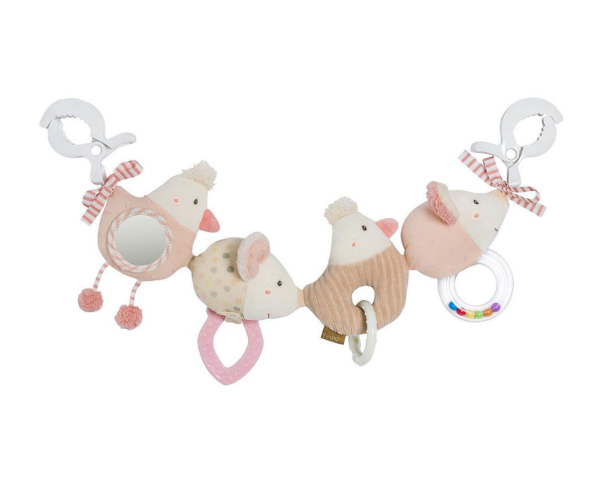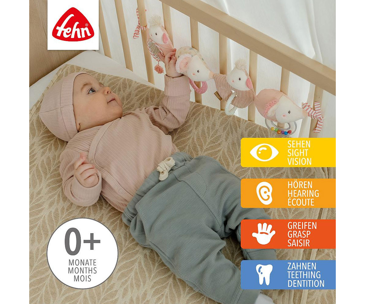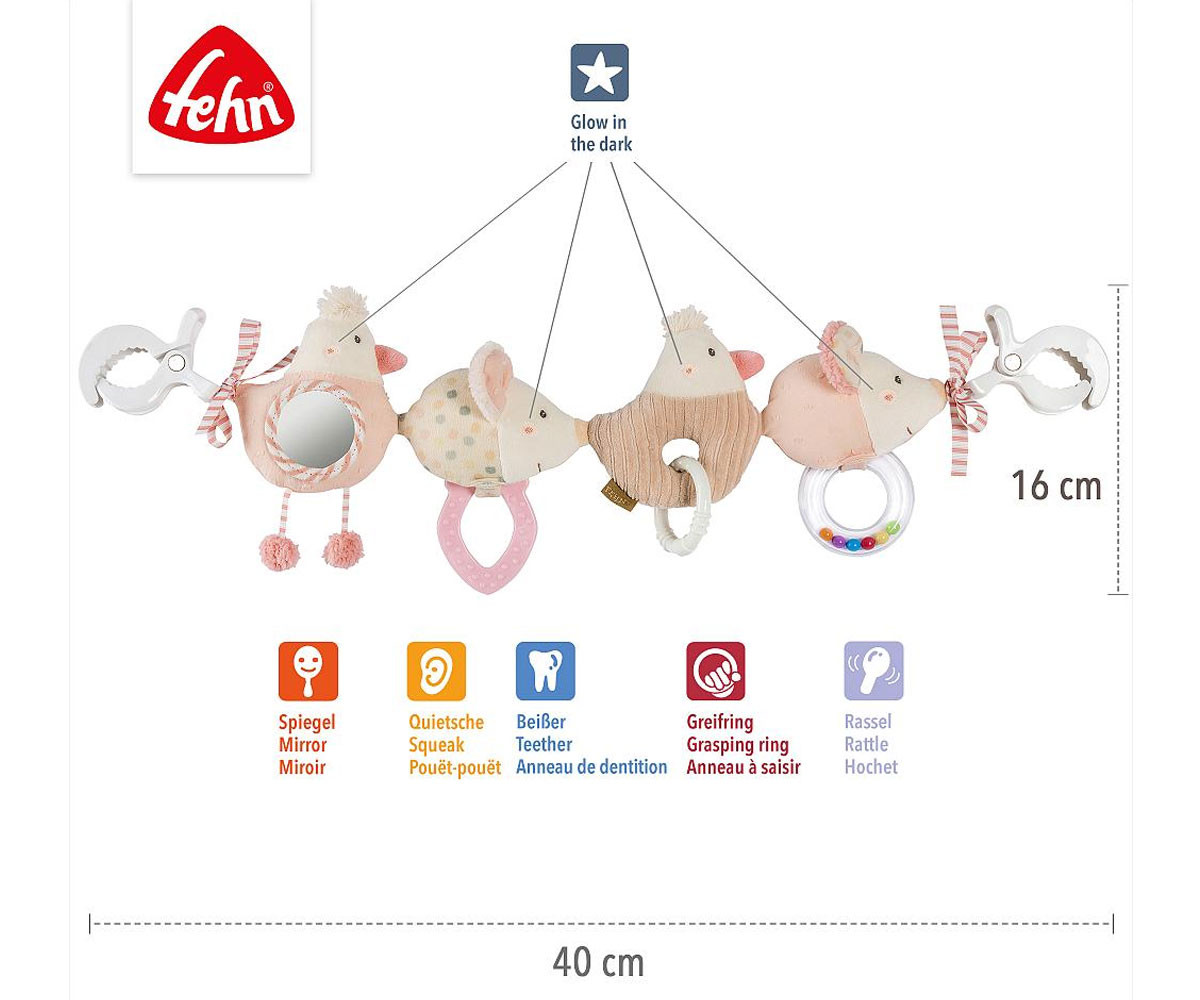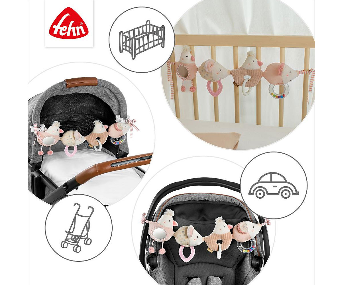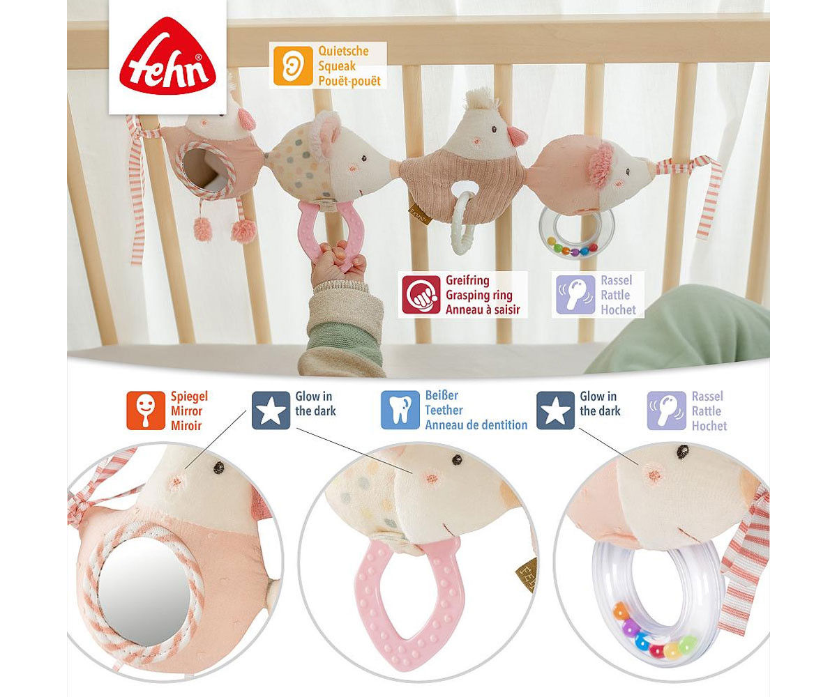 Играчката за количка feehnLAND със сигурност ще стане любима на бебето! Очарователните мишки и птици с камбанка, огледалце, пръстен за хващане, гризалка, звънче и пищялка канят бебето да хваща и пипа, като насърчават първоначалната координация между ръката и окото и подкрепят игровото развитие на самосъзнанието. Бродерията „Glow-in-the-dark“ свети в тъмното. С двете щипки, играчката може бързо да се закрепи към количка, кошче за бебе, легло, люлка или игрова арка, осигурявайки забавление и учене както вкъщи, така и на път!