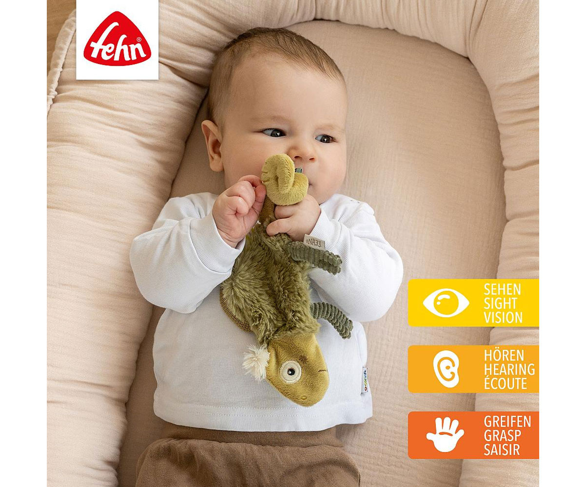 Шумкащ хамелеон – меко приятелче за игра и гушкане! Очарователният хамелеон от серията Lazy, Crazy & Pink стимулира слуха, допира и двигателните умения на бебето по забавен начин. Благодарение на различните материи и интересния шум на скритото шумкащо фолио, играта никога не омръзва. Бебетата обожават удобната форма на хамелеона – подходяща за хващане, пипане, откриване и гушкане. Мекият хамелеон Lazy е идеалният спътник у дома или на път и носи радост във всеки момент от деня.