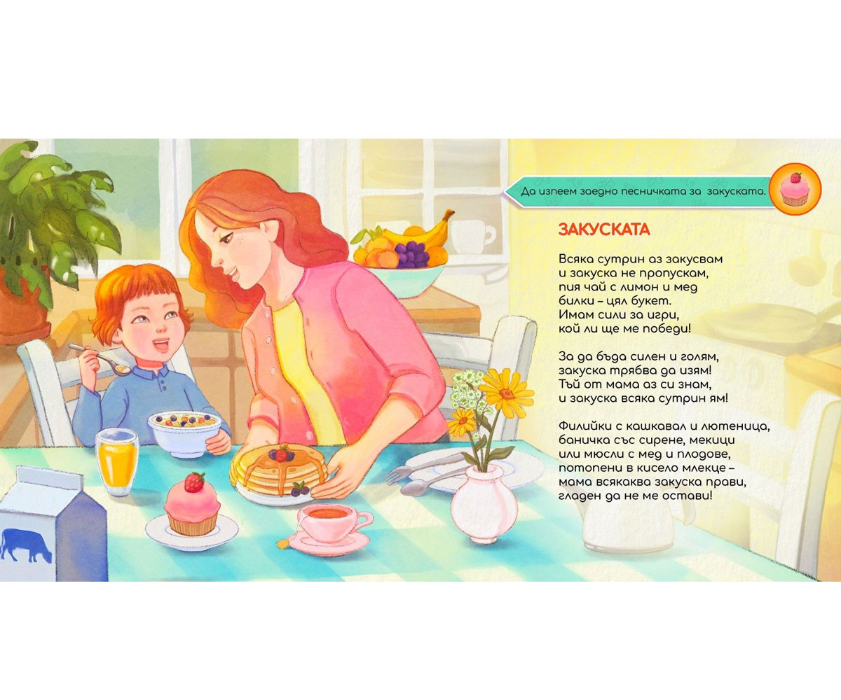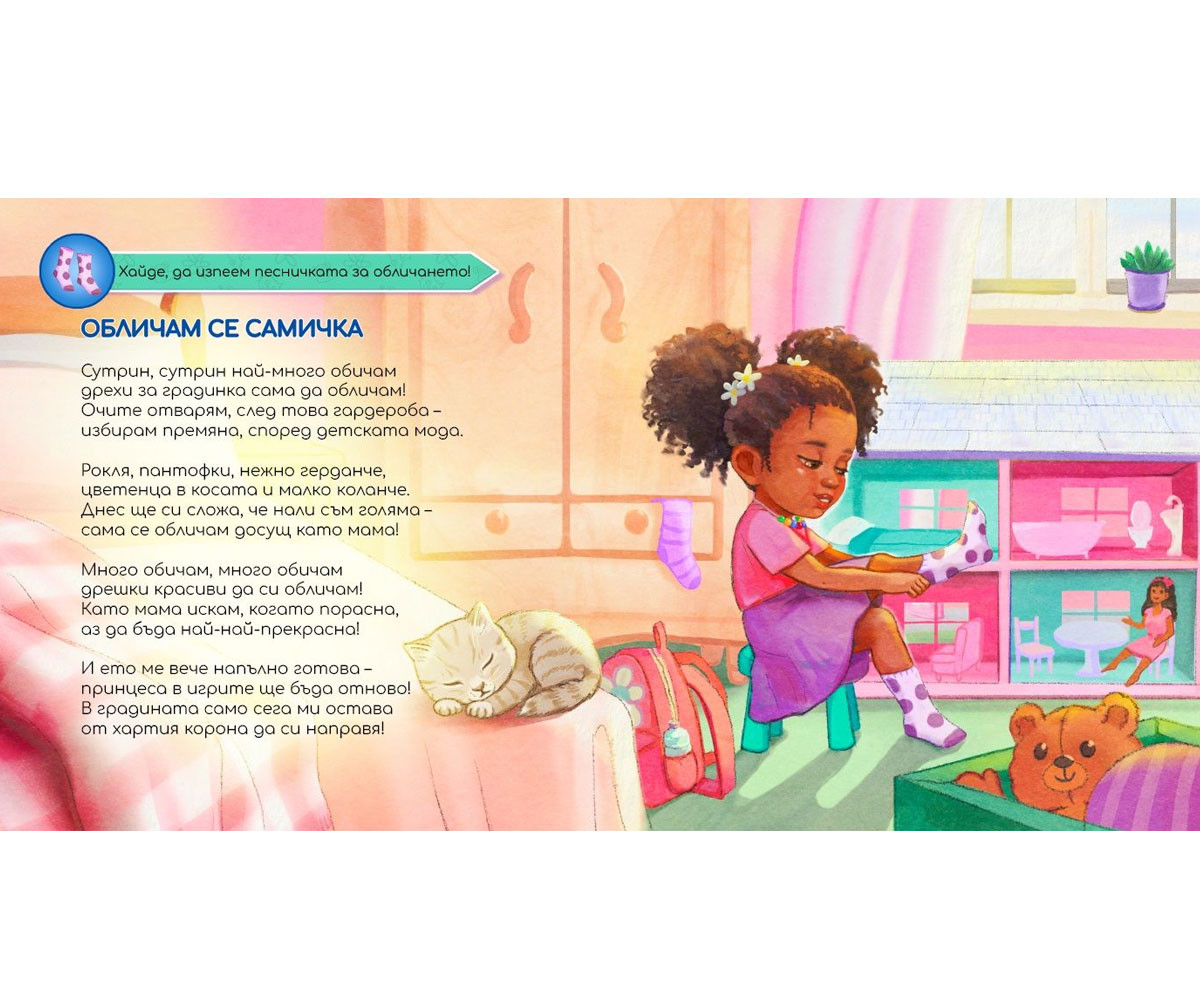 Ежедневната рутина е много важна за малките деца. Книгата Един мой ден в песнички описва с песни как протича денят на детето от ставането сутрин и измиването на зъбките до заспиването в прегръдките на мама - вечер. В книгата са включени весели песнички за добрите навици - измиването на зъбките, самостоятелното обличане, закуската, игрите в детската градина и прибирането вкъщи след дълъг ден.