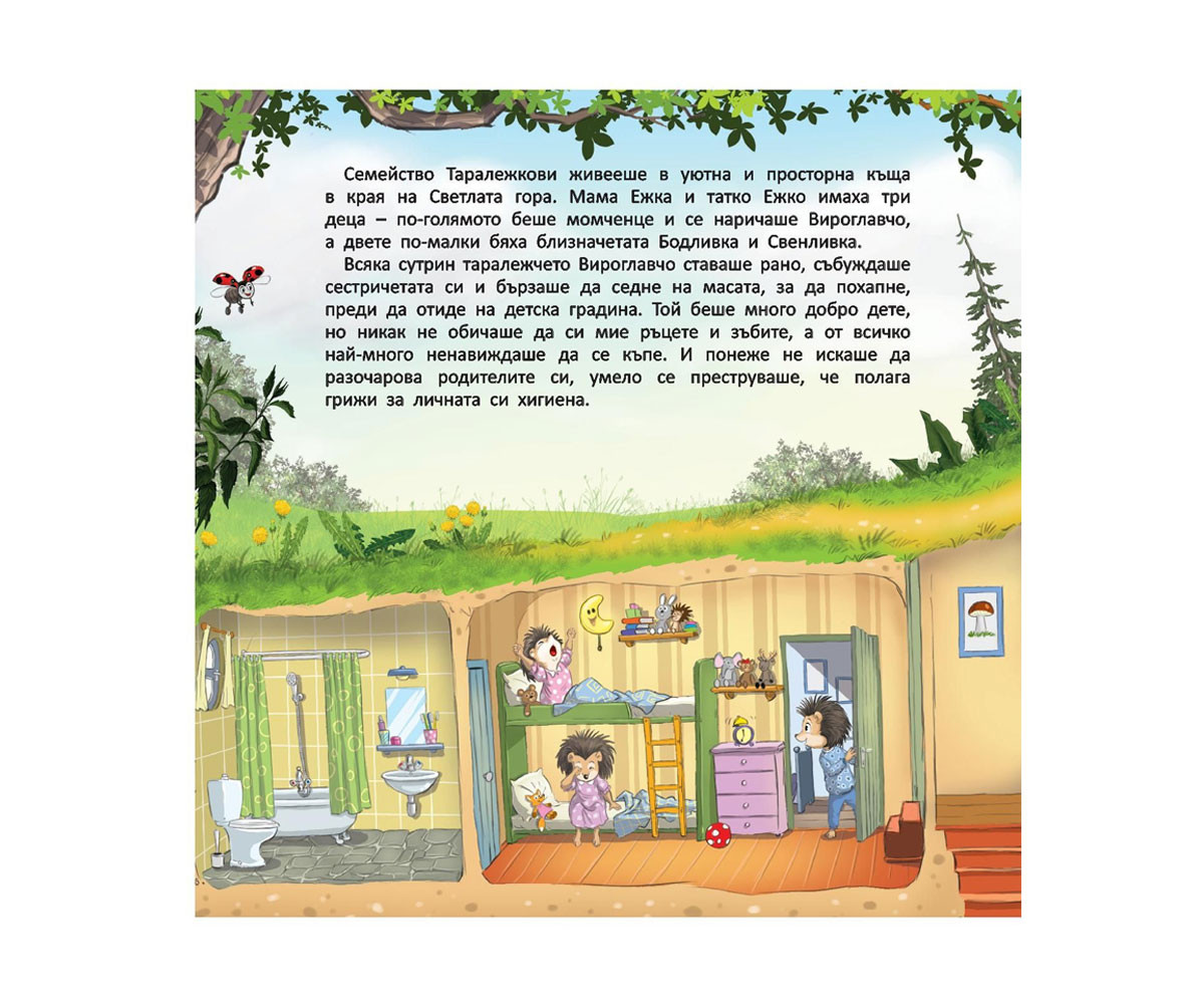 Таралежчето Вироглавчо никак не обича миенето на ръцете, на лицето и на зъбите, а от всичко най-много ненавижда да се къпе. С хитрост и измама то се преструва, че цени хигиената, докато един ден го връхлита една поучителна неприятност. Книжките от поредицата „Горската детска градина“ разкриват пред детето под формата на приказка различни предизвикателства, проблеми и особености на характера. Героите в нея са деца, които попадат в ситуации, доста близки до реалните, за да може детето интуитивно да стигне до важни изводи и заключения. В края на всяка книжка са поместени три урока, които помагат на малчуганите да осмислят поуките от историята, картинки за оцветяване, гатанки и весели задачки, които развиват наблюдателността и концентрацията. НОВО: в края на книжката има поместена карта, която посочва на детето кой от героите къде живее и предлага поглед върху цялата гора – домовете на героите от детската градина и техните семейства.