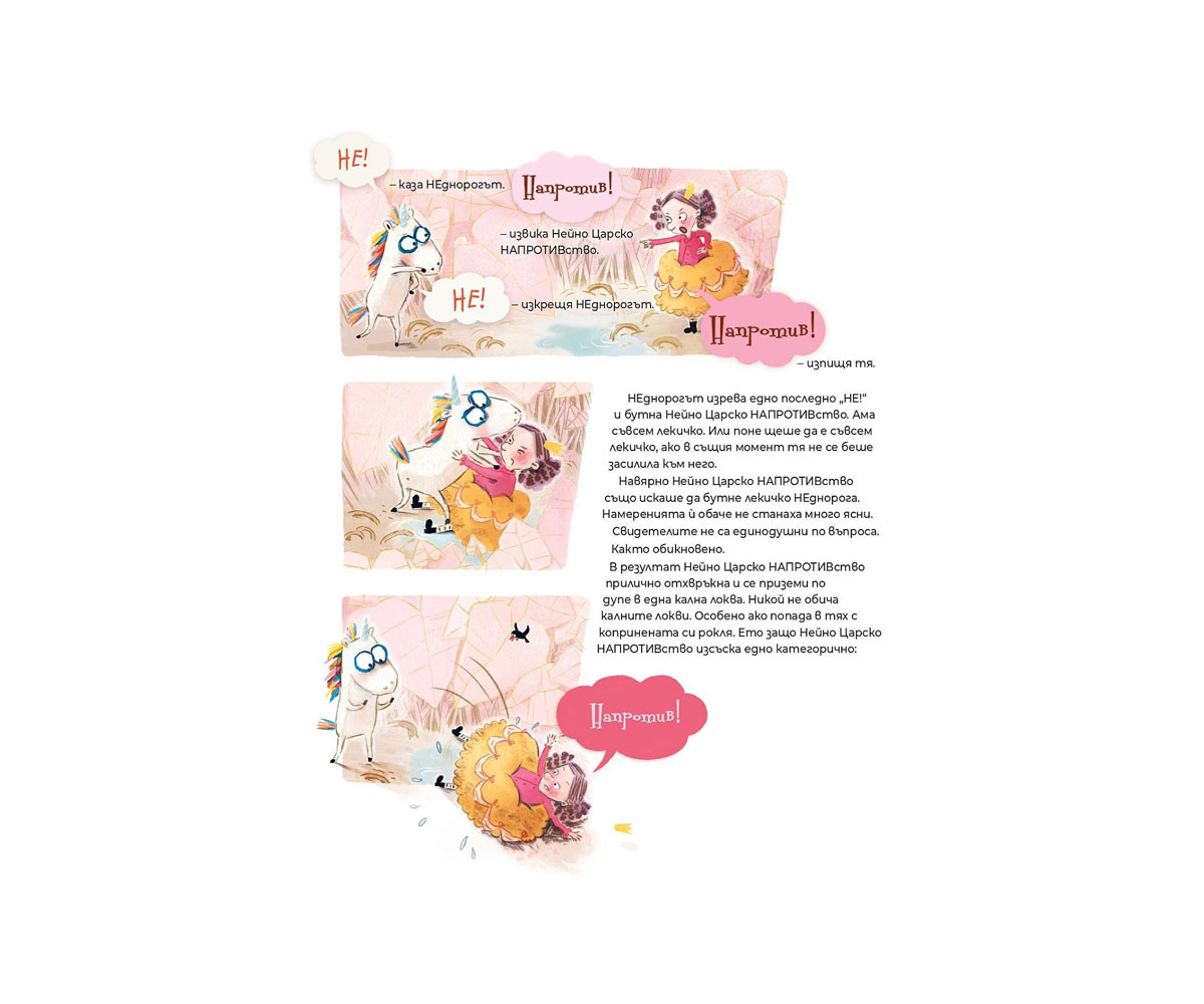 На рожден ден всяко дете кани своите приятели, за да се повеселят, да похапнат торта, да получат подаръци и да полудуват. Нейно царско НАПРОТИВство обаче не е като всяко дете - тя си има всичко на този свят, само едно нещо разваля настроението й: НЕднорогът. Който й беше приятел, но вече не е! Горкият инатливко не просто е НЕпоканен на партито й, но дори официално му е отказано да опитва от тортата... За да се сдобрят, той ще трябва да й избере най-невероятния подарък. Но какъв може да е той? Всичко започна с едно... ъъъ... неразбирателство. Ето как: