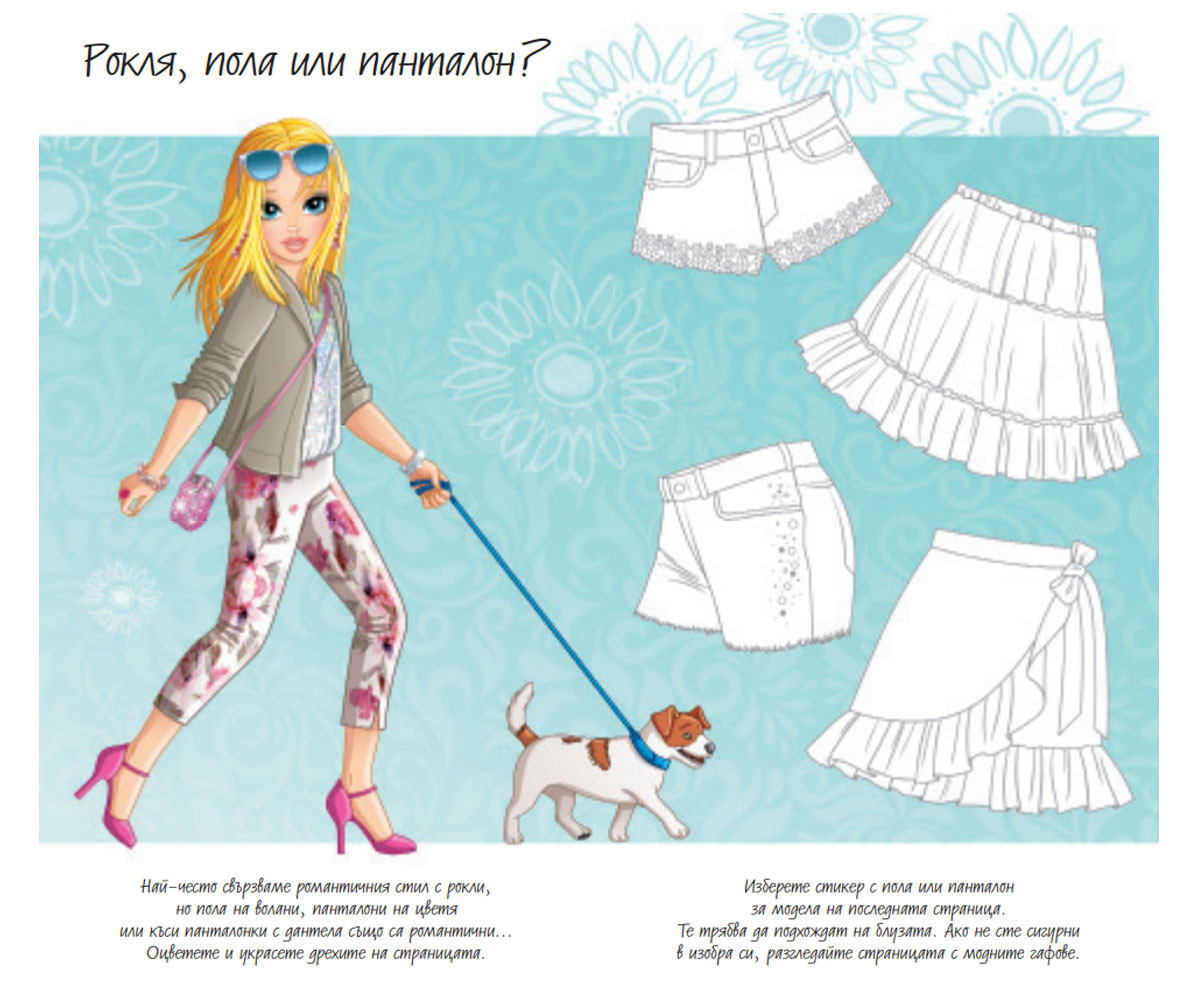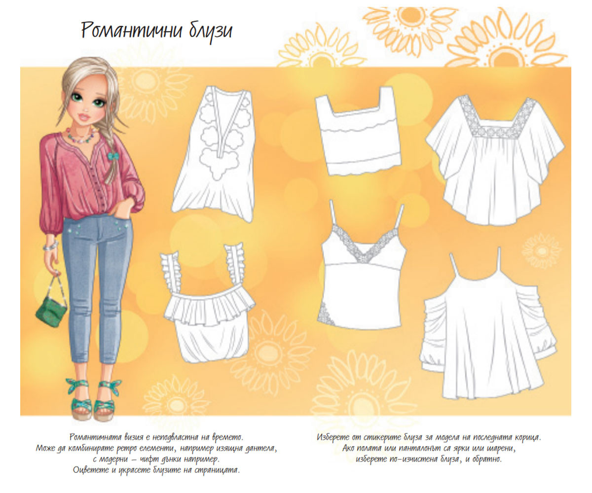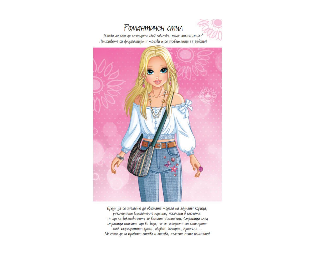 Преди да се заемете да обличате модела на задната корица, разгледайте внимателно идеите, показани в книгата. Те ще са вдъхновението за вашата фантазия. Страница след страница книгата ще ви води, за да изберете от стикерите най-подходящите дрехи, обувки, бижута, прическа... Можете да го правите отново и отново, колкото пъти поискате!