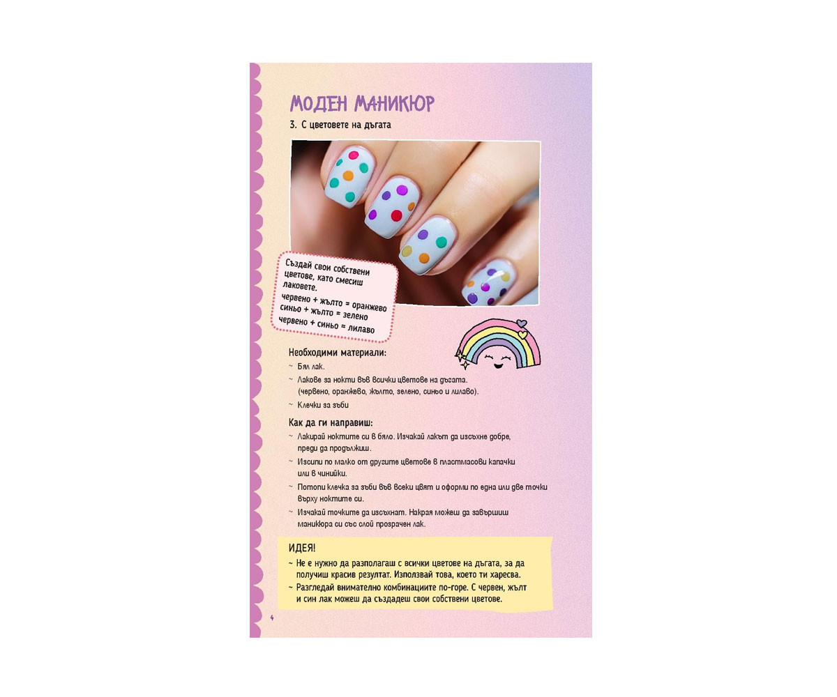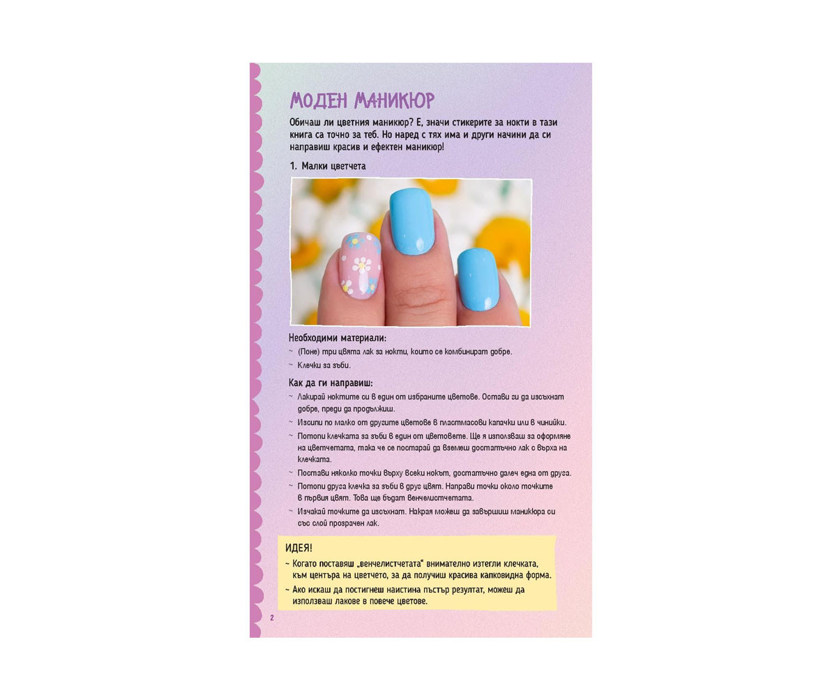 Тези невероятни стикери за нокти са създадени за всички, влюбени в еднорозите! Представи си колко прекрасно ще изглежда маникюрът ти, ако го украсиш със стикери на весели еднорози, цветни дъги или пъстри цветя! В комплекта ще откриеш и книжка със съвети за лакиране и много весели игри. Приятно забавление! Обичаш ли цветния маникюр? Е, значи стикерите за нокти в тази книга са точно за теб. Но наред с тях има и други начини да си направиш красив и ефектен маникюр!