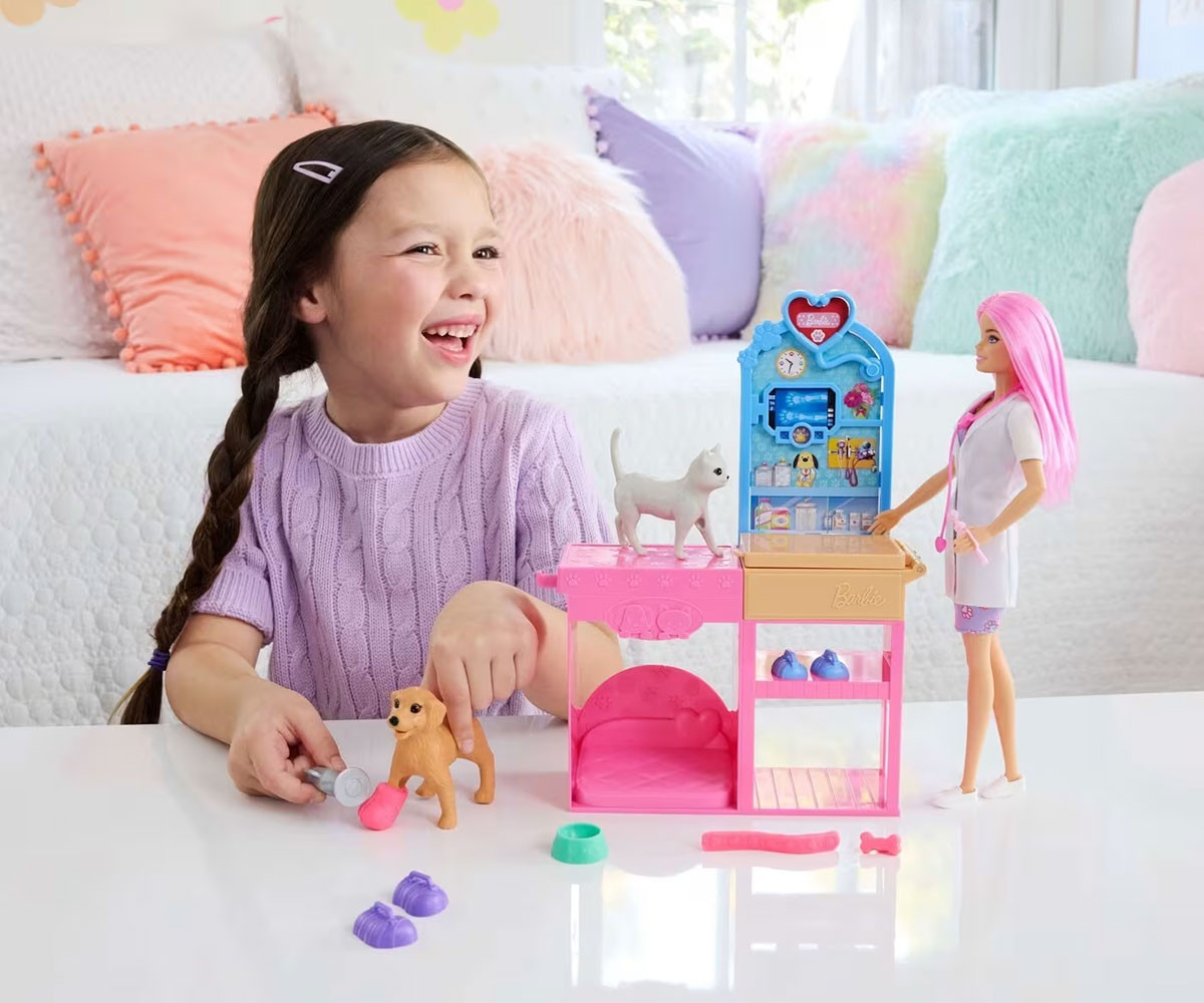 Barbie Ветеринарна клиника – грижи, въображение и забавление! Открий света на животните и се потопи в ролята на ветеринар с комплекта Barbie® Ветеринарна клиника! Когато децата играят с Barbie, те си представят всичко, което могат да станат – а за тези, които обичат да се грижат за животни, мечтата да бъдат ветеринари е само началото! Комплектът включва кукла Barbie с розова коса, две животинки (кученце и коте), маса за прегледи и над 10 ветеринарни аксесоара за часове реалистична и забавна игра.