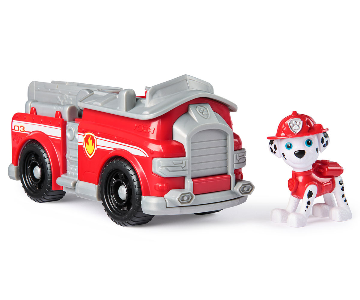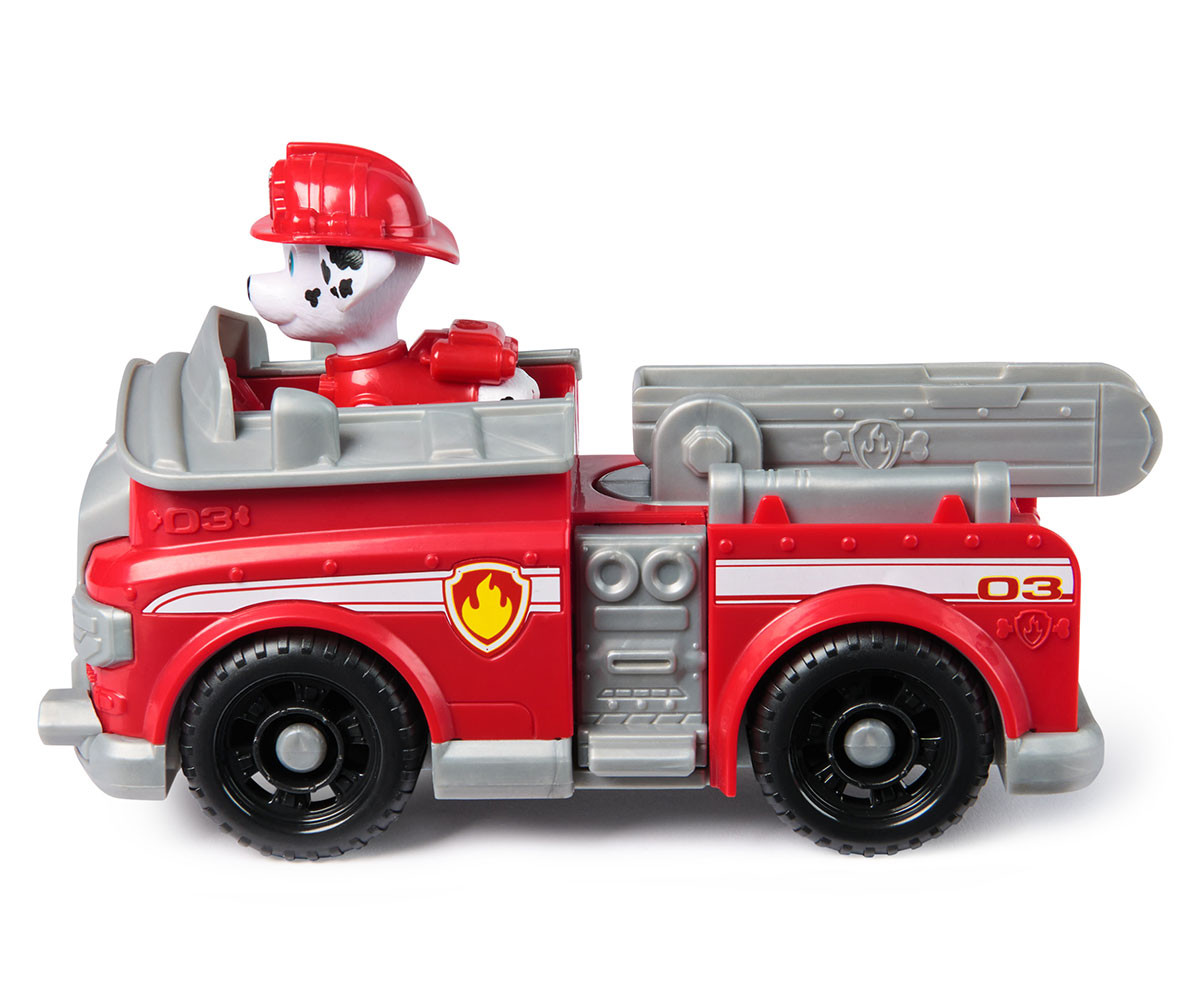 Пес Патрул са в движение – готови за спасителна мисия! Присъедини се към Маршал и неговия пожарен камион за вълнуващи приключения! Когато възникне проблем, постави Маршал на шофьорското място, закачи крачетата му и се впусни в спасителна мисия с истински въртящи се гуми и подвижна стълба! С автентични детайли и реалистичен дизайн, любимото кученце на Пес Патрул и неговото спасително превозно средство пренасят магията на сериала в ръцете на малките герои. Събери целия екип от спасителни кученца и техните превозни средства (всяко се продава отделно), и помогни да спасите деня в Адвенчър Бей! Преживей любими моменти от "Могъщите кученца", "Пес Патрул: Филмът" и създай свои собствени истории с героите и техните уникални превозни средства (всяко се продава отделно). Увеличи приключението с колекциите Action Pups и Air Rescue – с превозни средства, фигурки и играчки за малки деца – за безкрайно ПЕС-тастично забавление, вдъхновено от сериала!
