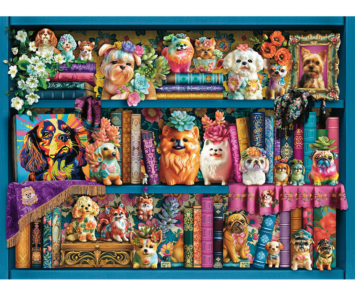 Насладете се на очарователната елегантност на този пъзел от 500 части, "Ценни порцеланови кученца". Този магичен пъзел улавя уютната топлина на обичана библиотека, където изкусно изработените порцеланови кученца се сгушват сред редове от вечни книги. Всяка част разкрива фините детайли на нежните фигурки и богатите текстури на класическите подвързии на книгите.