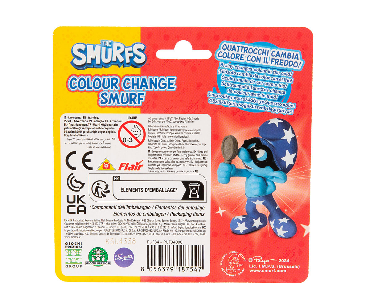 Смърфовете се завръщат с магическа изненада! Пренесете очарованието на селцето на Смърфовете у дома с този забавен комплект от 2 фигурки с любимите ви герои! Едната от фигурките променя цвета на дрехите си при контакт със студена вода — за още по-забавна и изненадваща игра! Съберете и трите уникални двойки за още по-смърфско забавление!