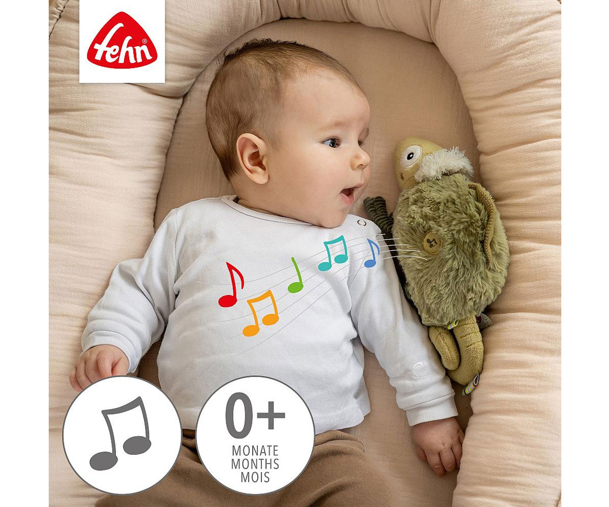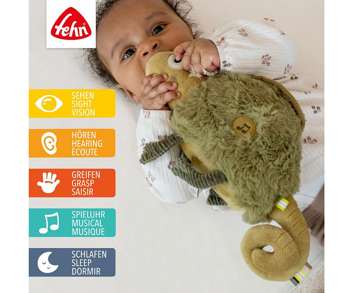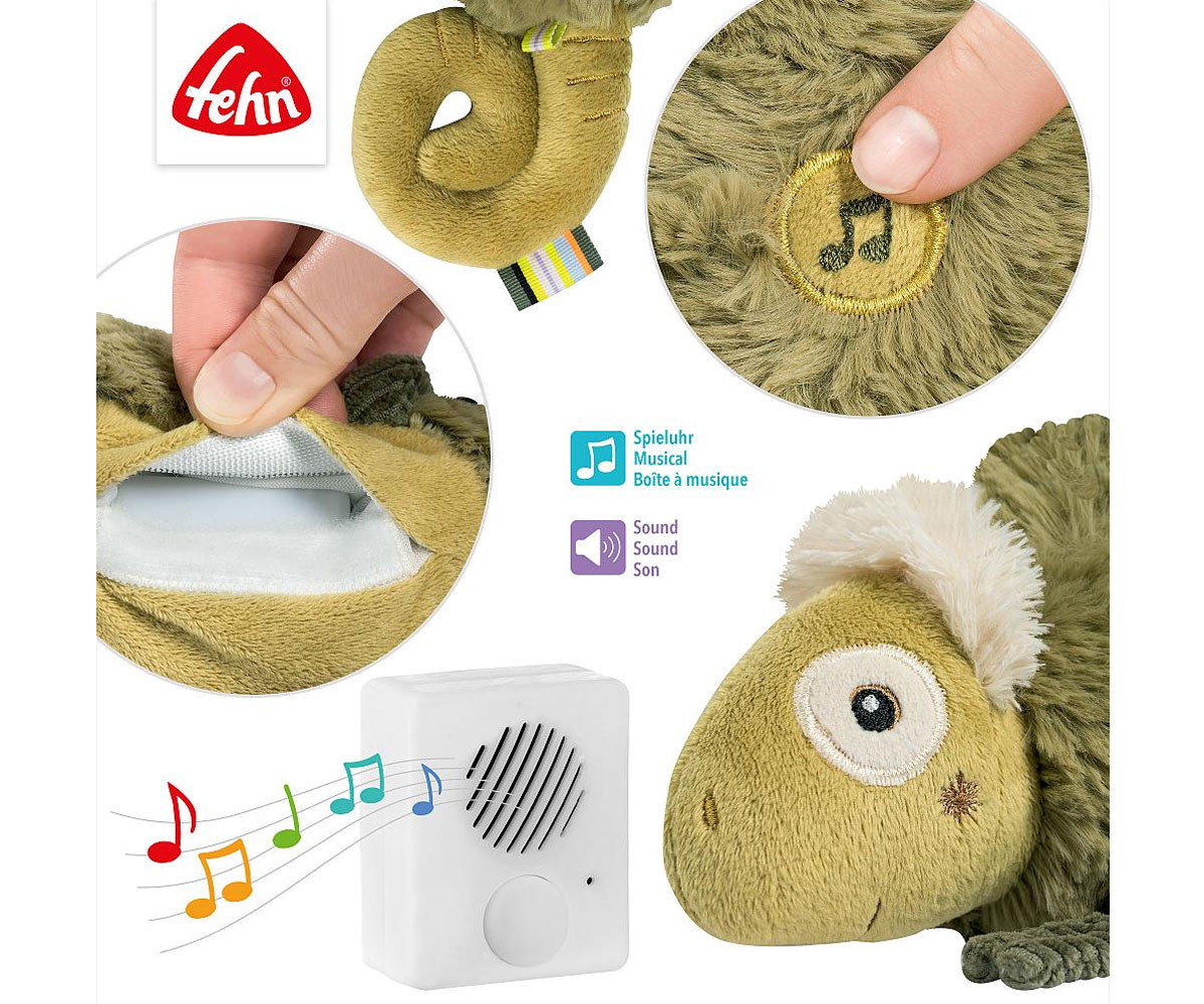 С 10 приятни звука и изключително меки материи, плюшения хамелеон пленява всяко бебешко сърце. Перфектно като първи приятел в бебешкото креватче.