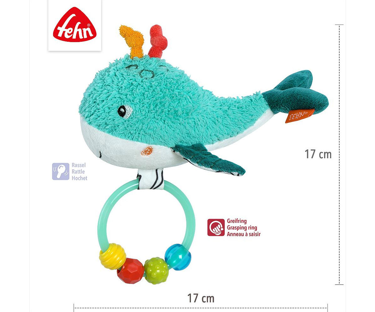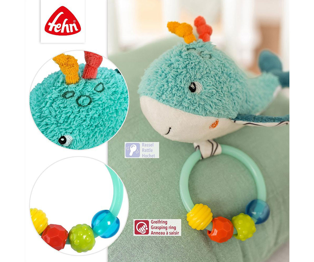 Бебешка дрънкалка с мек плюшен кит - за хващане, усещане и игра (0+ месеца). Цветният ринг „Кит“ от колекцията DoBabyDoo Ocean е създаден за хващане, разклащане и изследване. Съчетавайки различни материи и вградена дрънкалка, той събужда любопитството на бебето и го насърчава към първи открития.