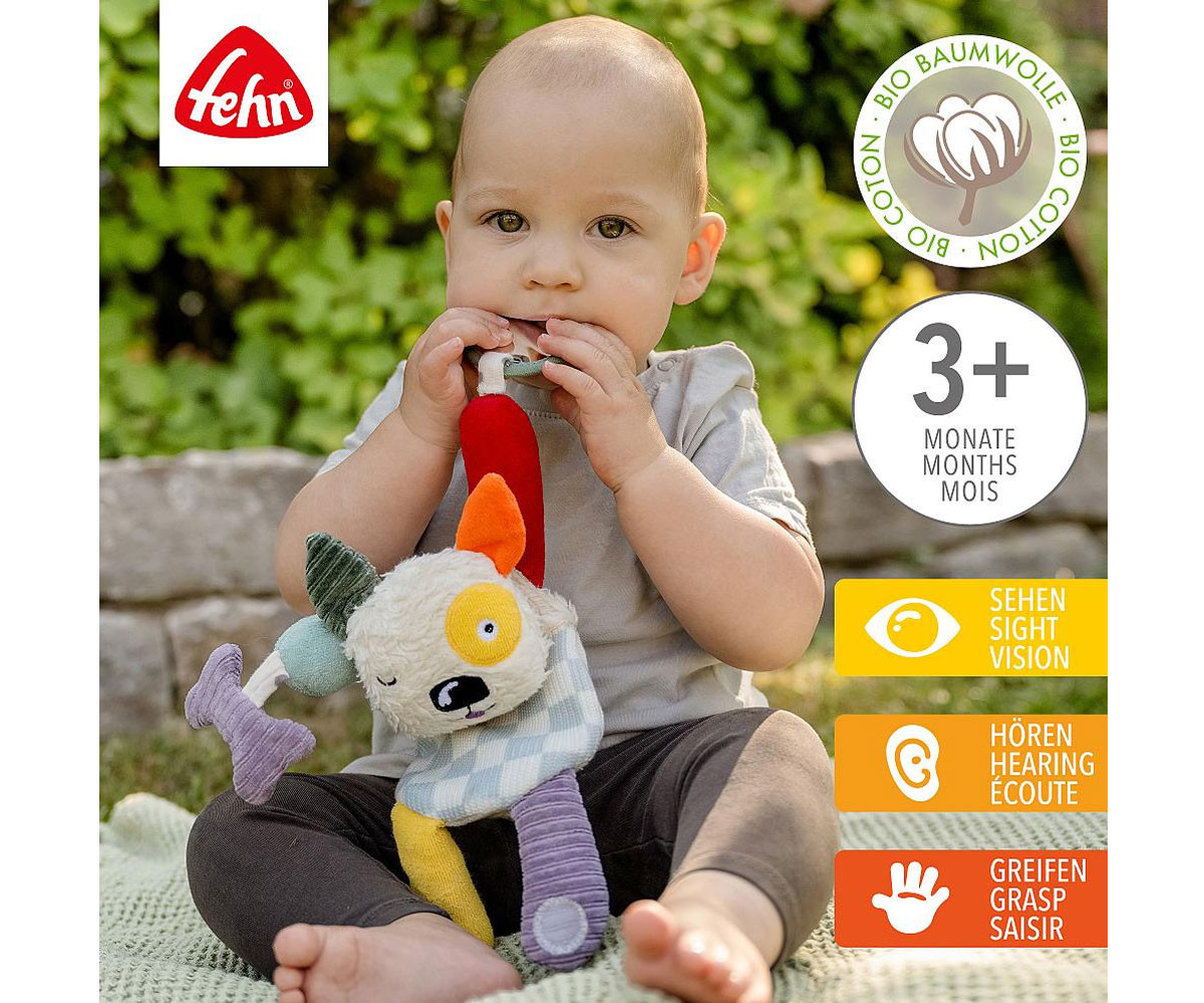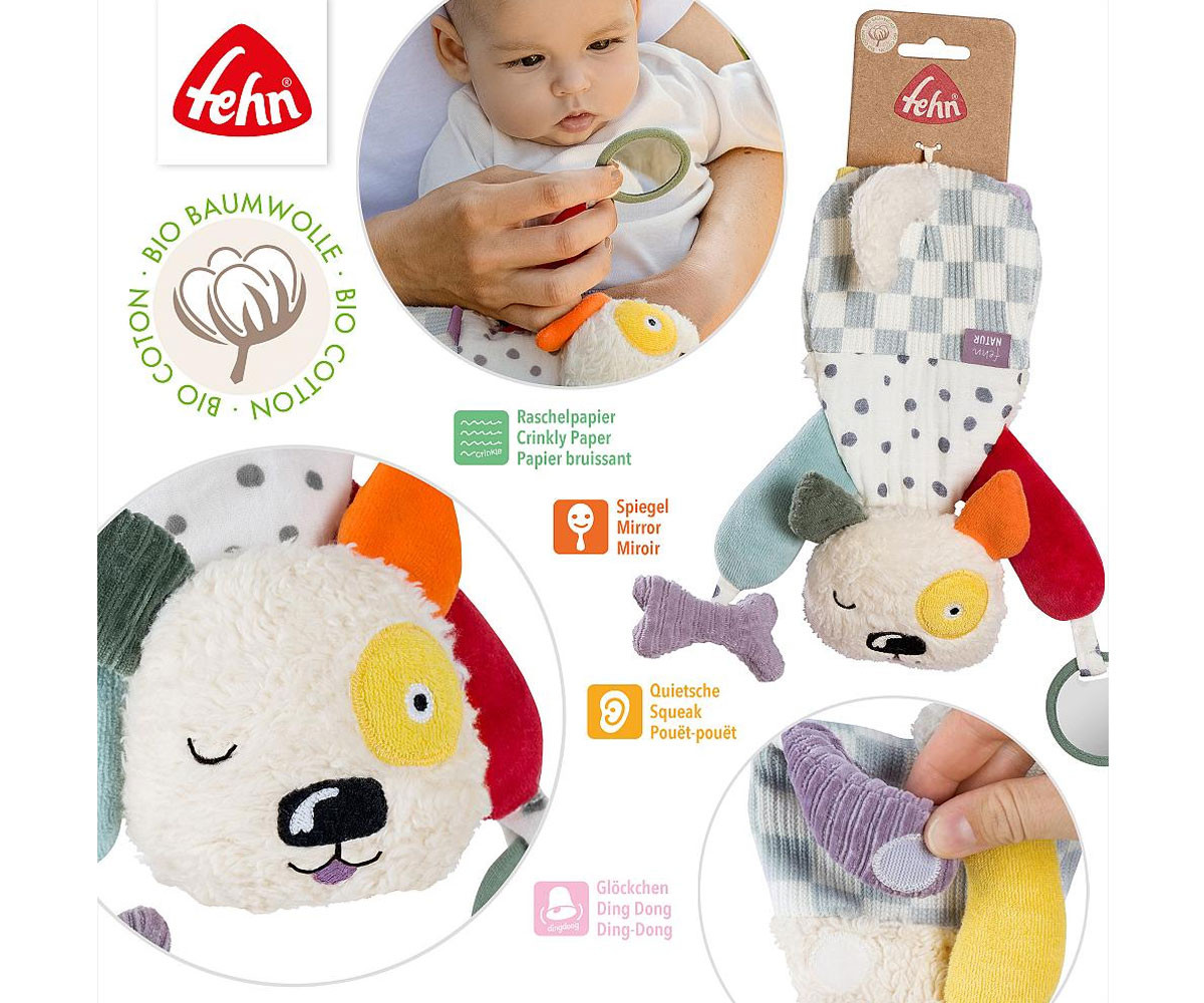 Забавна игра у дома или по време на разходка! Благодарение на практичното велкро закопчаване, активното кученце от колекцията fehnNATUR Hund може лесно да се прикрепи към детска количка, столче за кола или легълце. Множеството игрови функции – звънче, пискалка, шумящо фолио, огледалце и разнообразен микс от материи (памук от биологично земеделие) – стимулират любопитството, развиват фината моторика и сетивните умения на бебето.