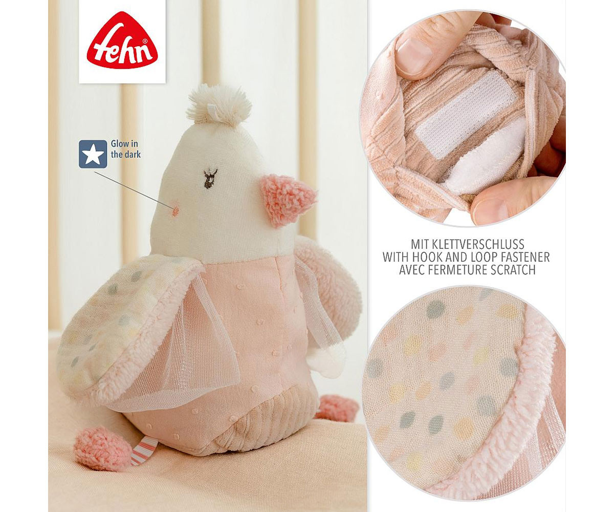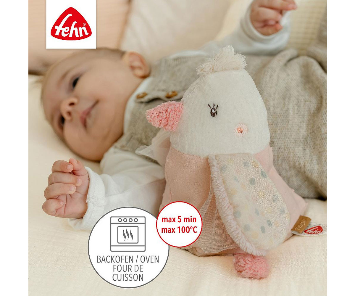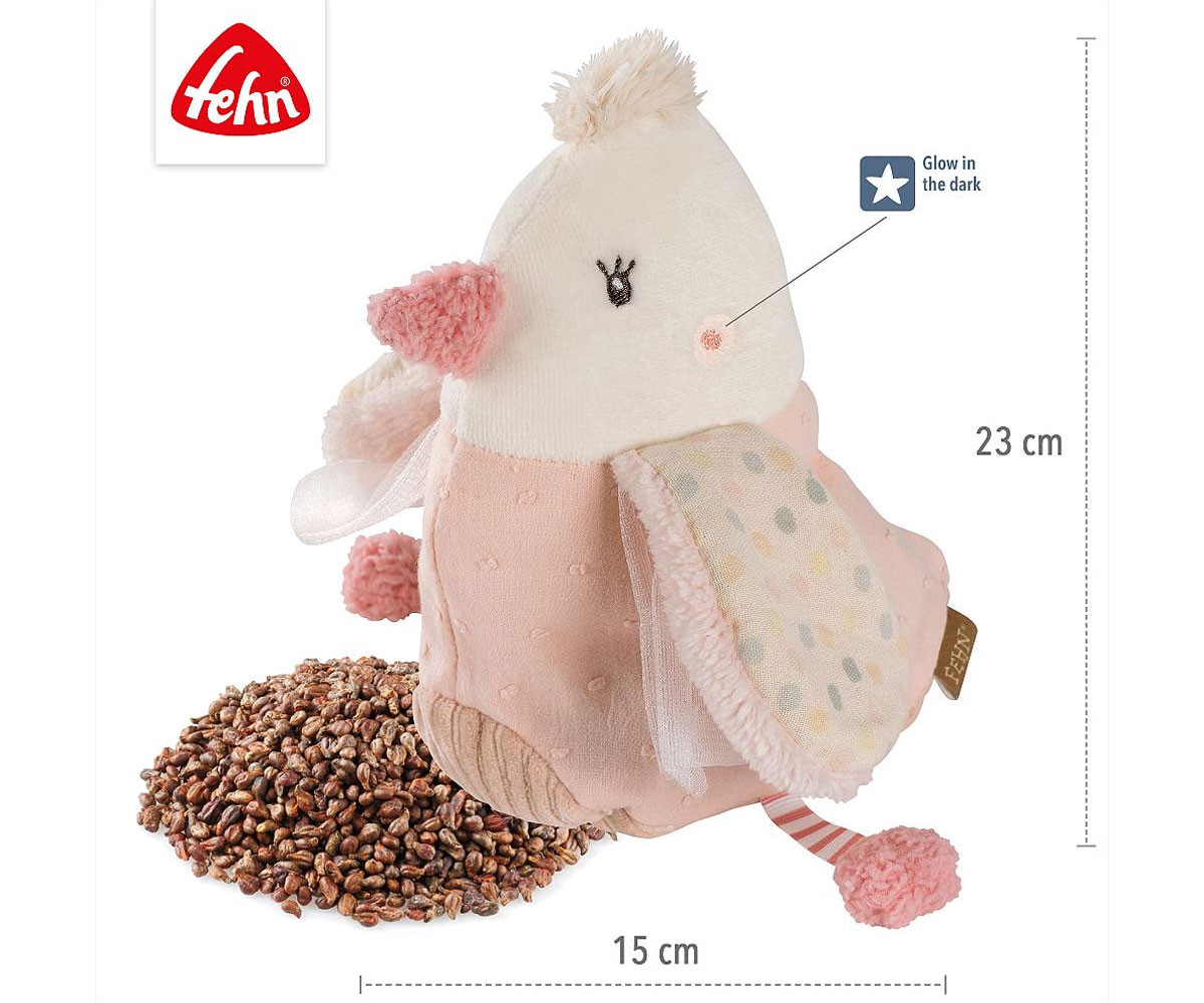 Очарователното животинче „Птица“ от колекцията feehnLAND е многофункционален и перфектен приятел за гушкане. Вътрешността му може лесно да се извади благодарение на удобната велкро лента и да се затопли във фурната, а за да се охлади, поставете я в найлонов плик в хладилник или фризер. Гроздовите семена се прилепват идеално към тялото на бебето, осигурявайки равномерна, успокояваща топлина, която утешава и успокоява най-малките в кошчето за бебе или количката. Бродерията „Glow-in-the-dark“ свети в тъмното. Торбичката за затопляне или охлаждане може лесно да се отстрани благодарение на практичната велкро закопчалка - птичката може да се пере при 30°C и винаги остава свежа и уютна!