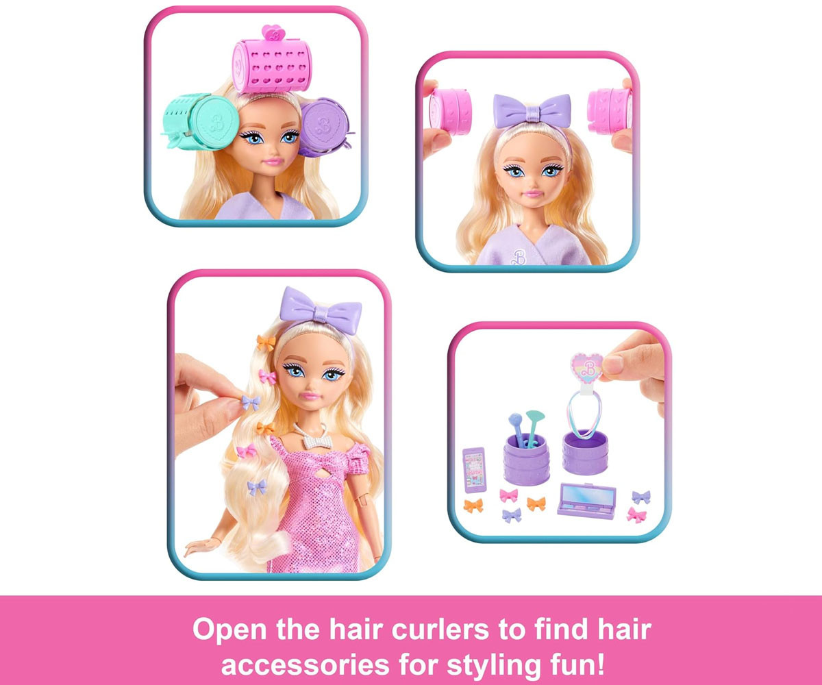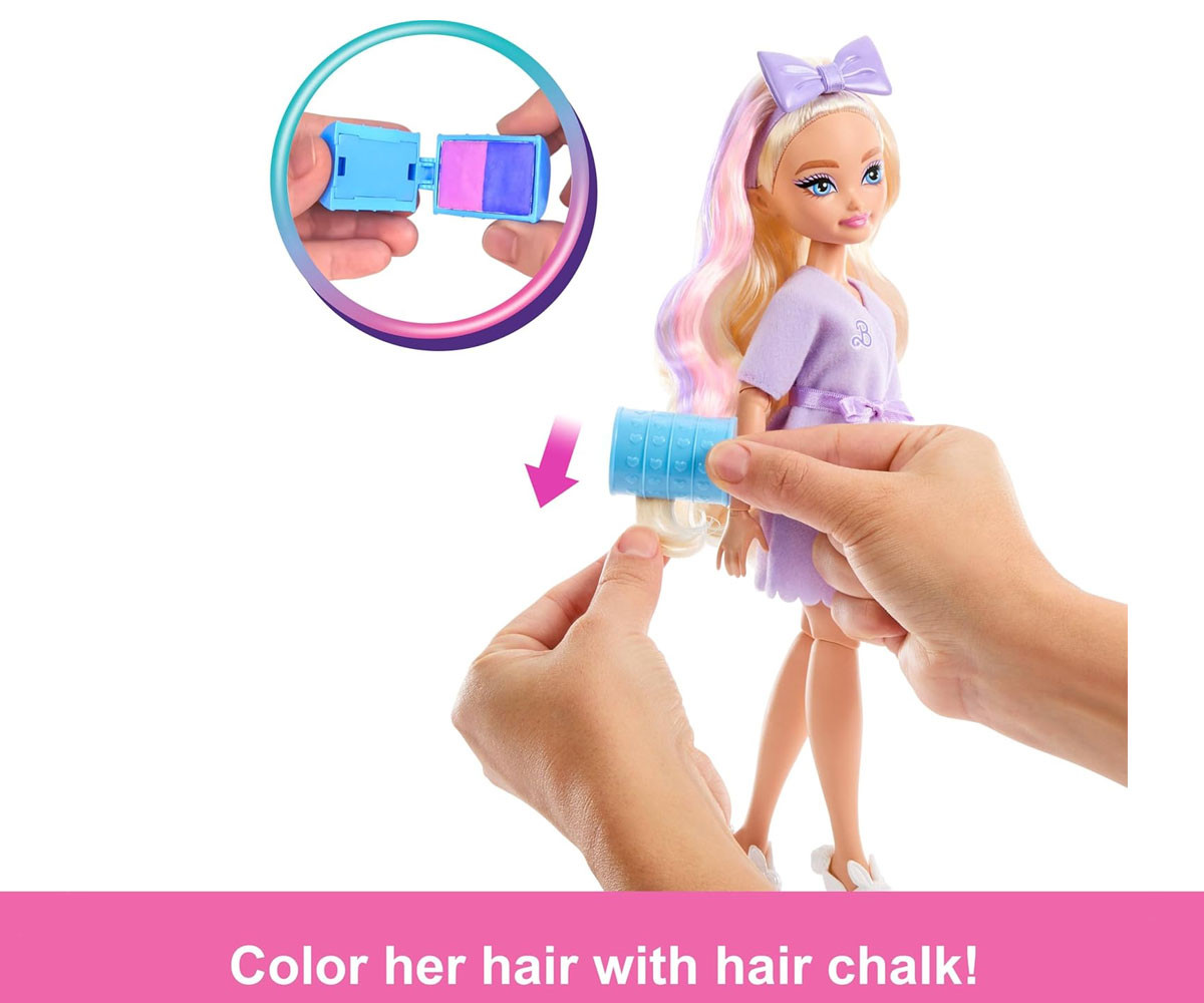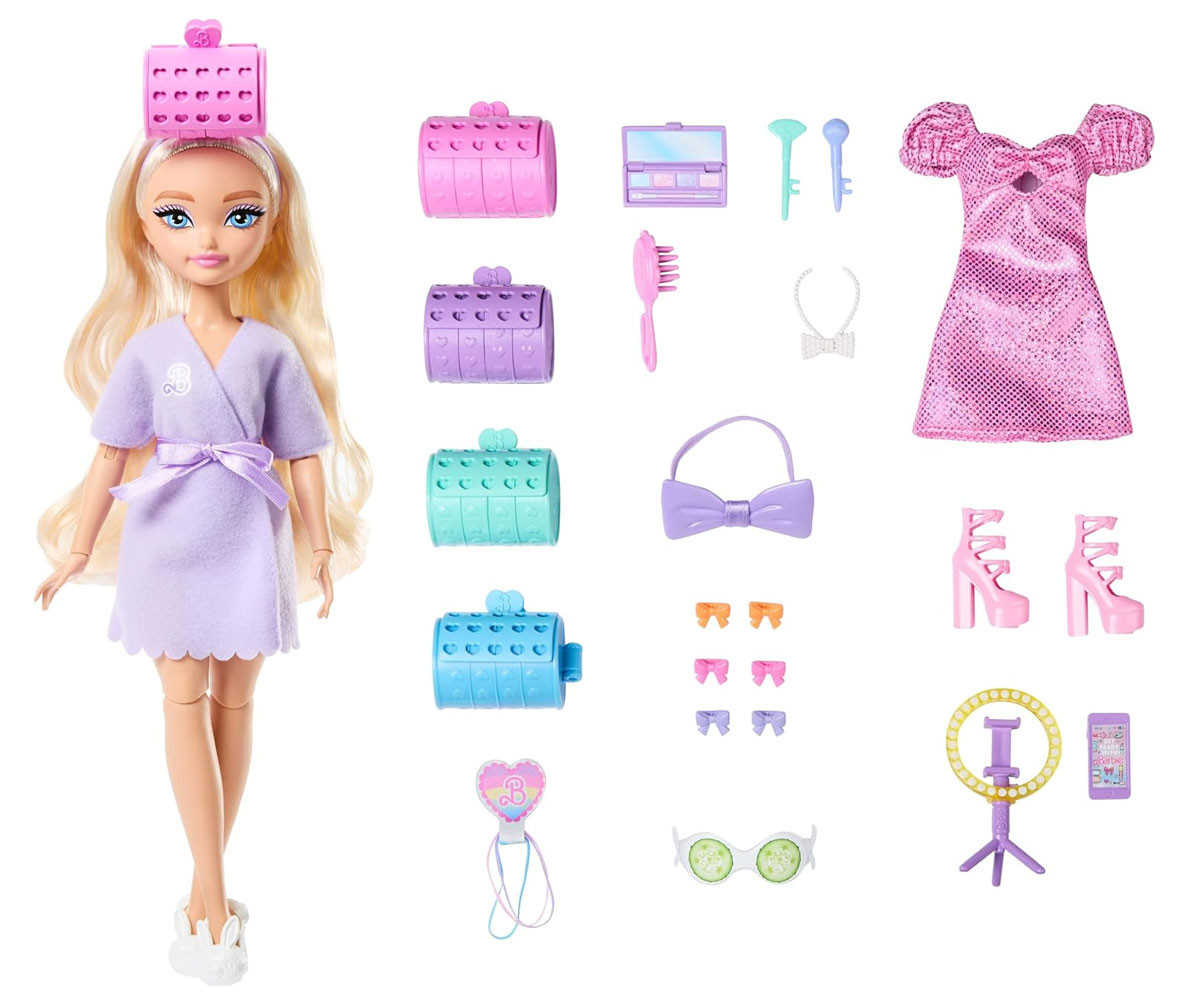Barbie Dream Besties – „Malibu“ се приготвя за вечерно парти! Помогни на Barbie Малибу“ да се подготви за забавна вечер навън – време е за трансформация! Куклата Малибу вдъхновява децата да изразяват себе си чрез мода и игра. Облечи Barbie в уютния ѝ халат и сложи маската за очи с резенчета краставица – идеална за релакс преди вечерното ѝ приключение! Разтвори ролките за коса и открий изненади, като цветен тебешир за коса и голяма панделка! Докато оформя прическата си, Barbie може да носи халата си, а когато е готова – да облече бляскавата си рокля! Завърши визията с помощта на включените аксесоари – палитра с гримове и четка за разкрасяване! Играй, мечтай и блести с Barbie! Куклите Barbie Dream Besties насърчават децата (4+ години) да пресъздават мечтите си чрез стил, творчество и въображение. Куклата не може да стои самостоятелно. Възможни са вариации в цветовете и декорациите.