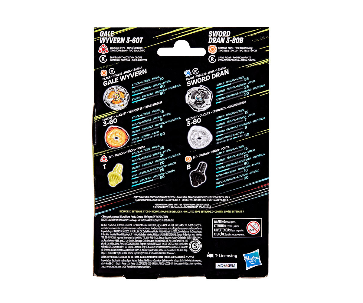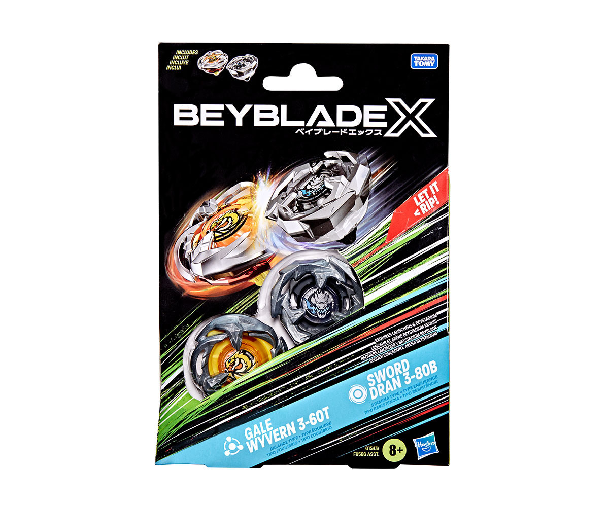 Комплектът Beyblade X Tail Viper 5–800 и Sword Dran 3–60F Dual Pack, който включва 2 въртящи се надясно върха (необходими са Beystadium и ракети-носители, продават се отделно). Пуснете се направо в битка или преконфигурирайте с този двоен пакет с тези на други върхове Beyblade X (продават се отделно), за да създадете свой собствен ненадминат Bey. Beyblade X разполага с иновацията X-Celerator Gear System, за да повишите нивото на вашата игра. Когато зъбното колело Beyblade X захване релсата на арената Beystadium, то може да се ускори в Xtreme Dash, което го разнася около стадиона за смазващи сблъсъци и епични изблици. Bladers изстрелват пумпалите си в ожесточени сблъсъци срещу точките на опонента си при всяка конфронтация – първият, който вкара 4 точки, печели. Играчките Beyblade на Hasbro с автентични горни части от лят под налягане метал Takara Tomy са страхотни детски подаръци за момчета и момичета на възраст над 8 години.