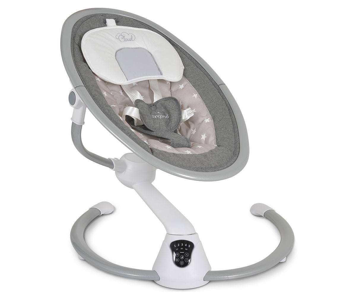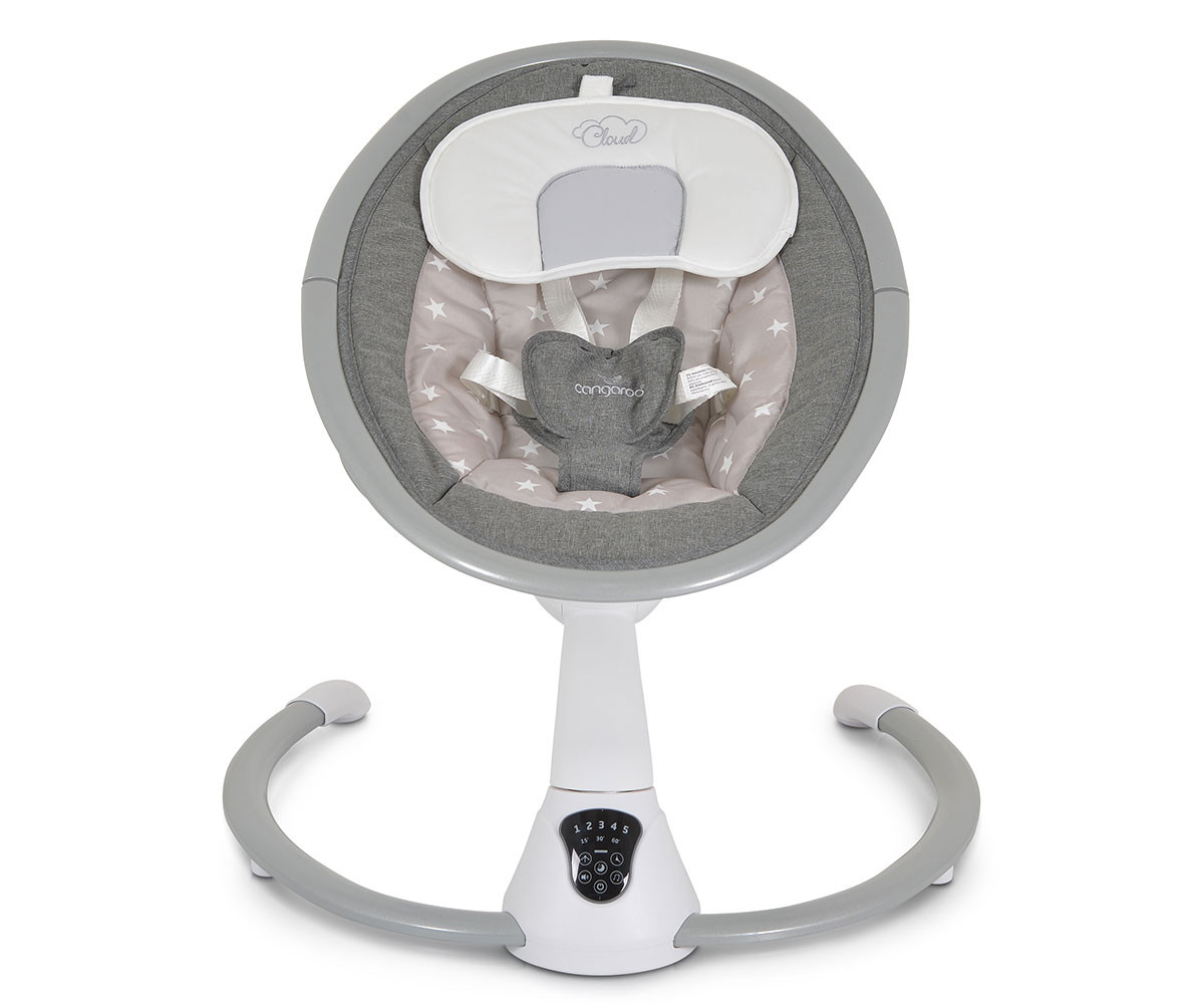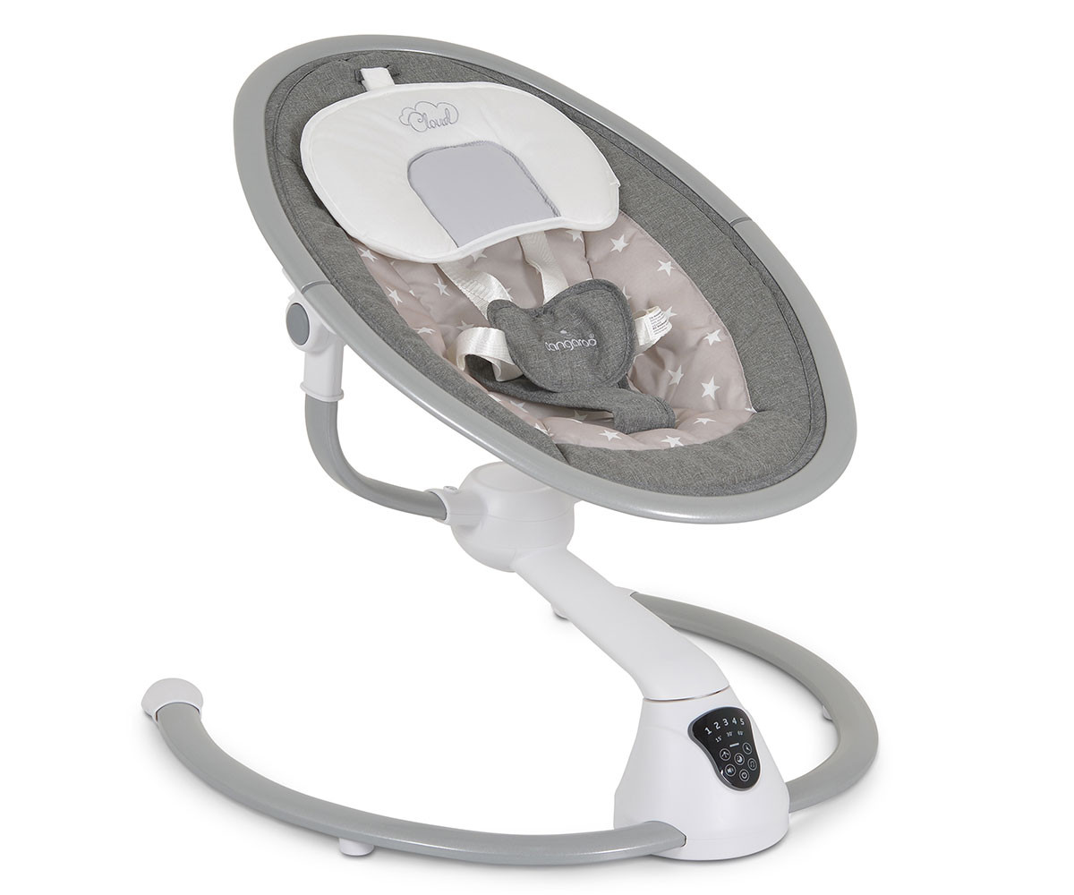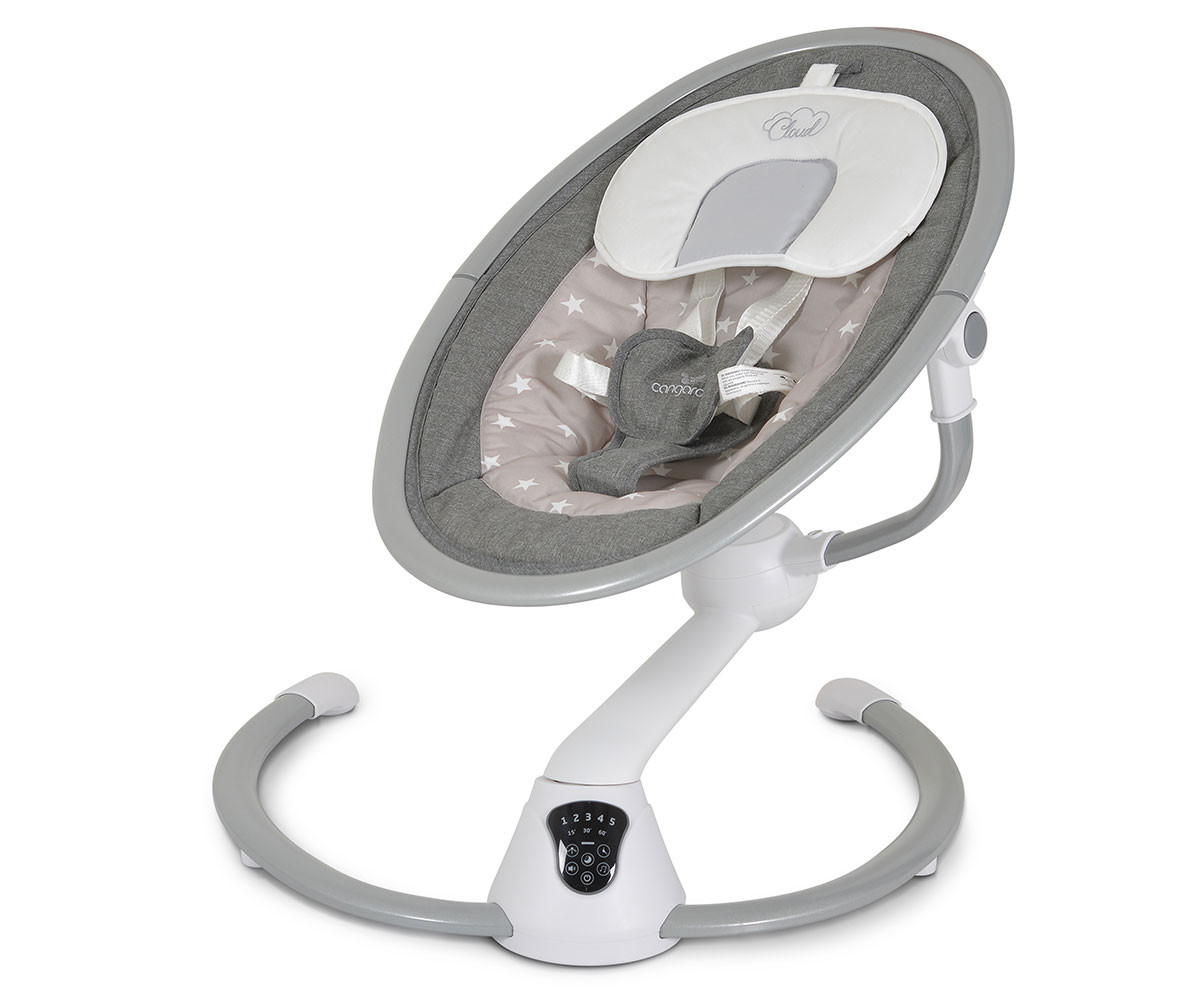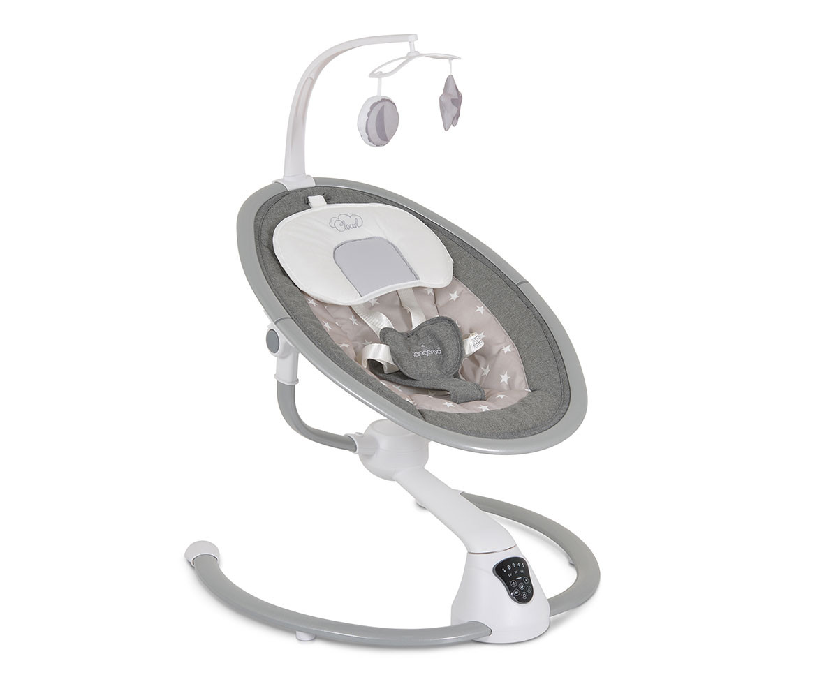 Електрическата люлка Cloud е удобно решение за всеки родител. Тя има 360-градусова ротация на седалката и 2 позиции на наклона. Предоставя избор между 5 скорости на люлеене и 3 времена за автоматично изключване. Можете да се възползвате и от вградения детектор за движение, който активира люлката автоматично. Има 12 мелодии и 5 природни звука, като силата на звука може да се регулира. За развитие на зрителните възприятия и разпознаването на различни форми е включен гриф с 2 меки играчки. За по-голямо удобство са предоставени също допълнителна възглавничка и сенник с мрежа против комари. Люлката работи с включен в комплекта адаптер или на батерии, които не са включени. Може да се ползва с Bluetooth функция. При желание механизмът се застопорява и продуктът се превръща в шезлонг.