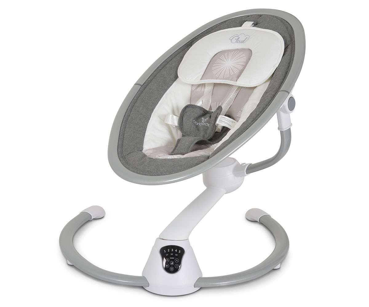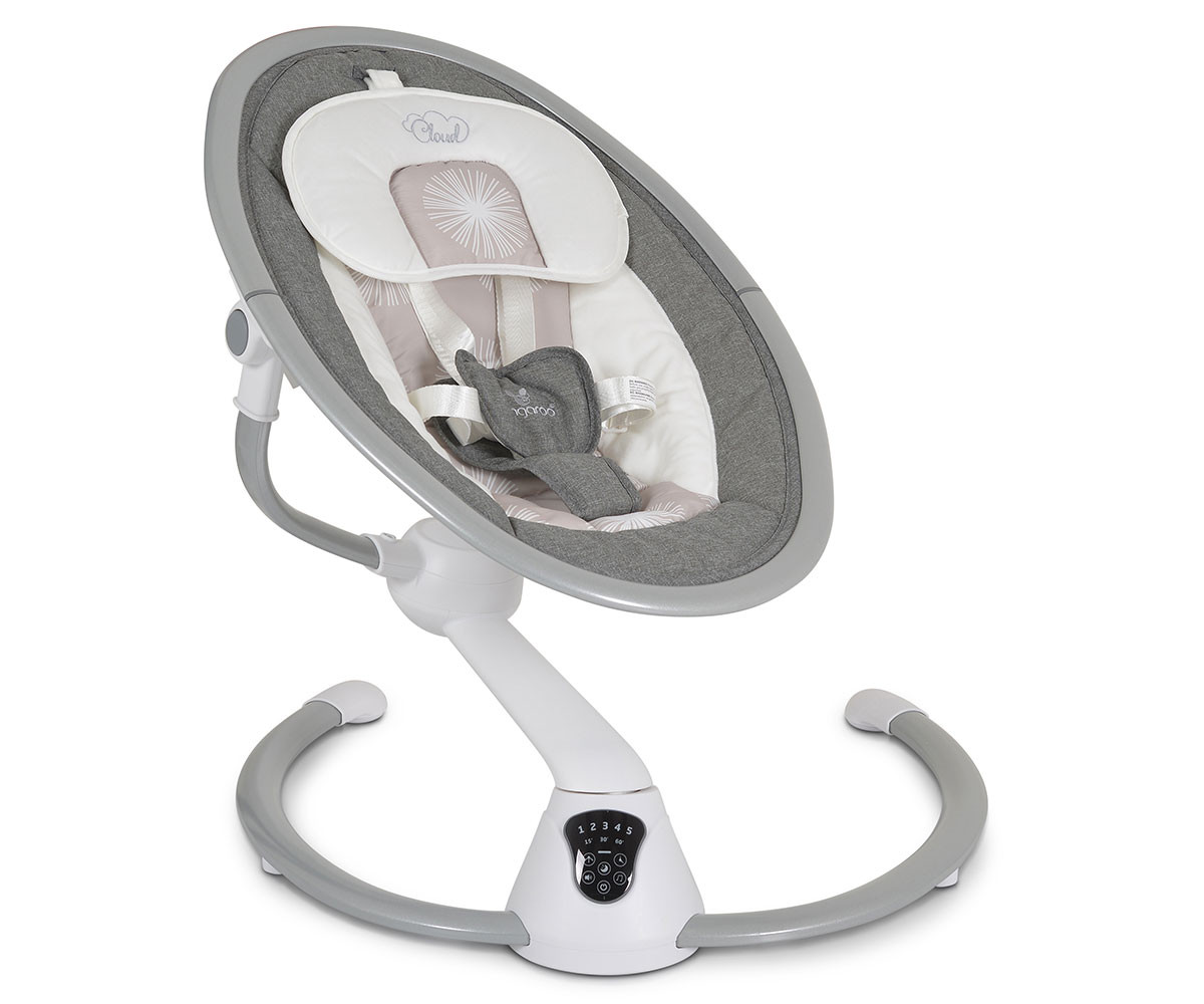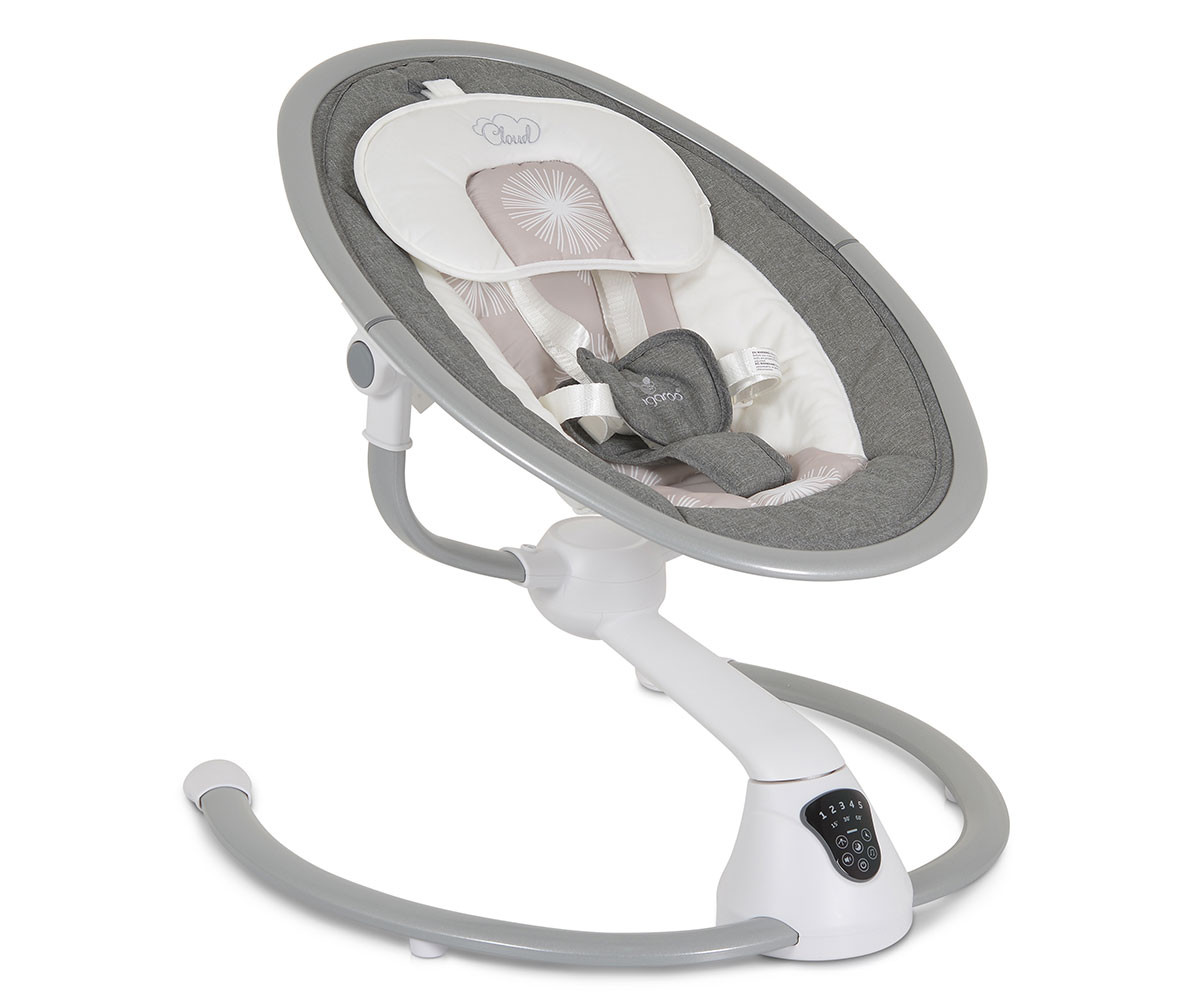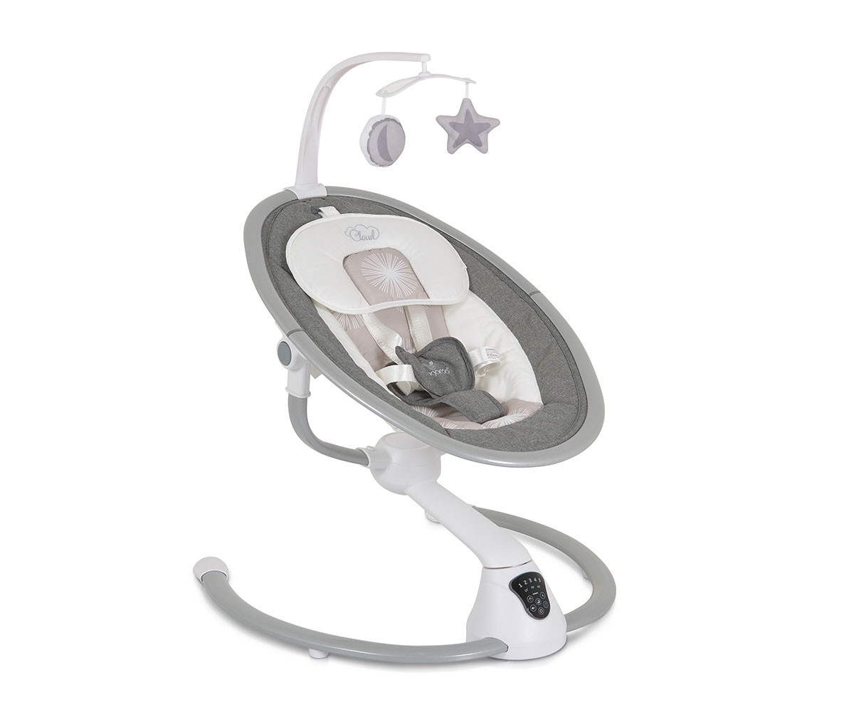 Електрическата люлка Cloud е удобно решение за всеки родител. Тя има 360-градусова ротация на седалката и 2 позиции на наклона. Предоставя избор между 5 скорости на люлеене и 3 времена за автоматично изключване. Можете да се възползвате и от вградения детектор за движение, който активира люлката автоматично. Има 12 мелодии и 5 природни звука, като силата на звука може да се регулира. За развитие на зрителните възприятия и разпознаването на различни форми е включен гриф с 2 меки играчки. За по-голямо удобство са предоставени също допълнителна възглавничка и сенник с мрежа против комари. Люлката работи с включен в комплекта адаптер или на батерии, които не са включени. Може да се ползва с Bluetooth функция. При желание механизмът се застопорява и продуктът се превръща в шезлонг.