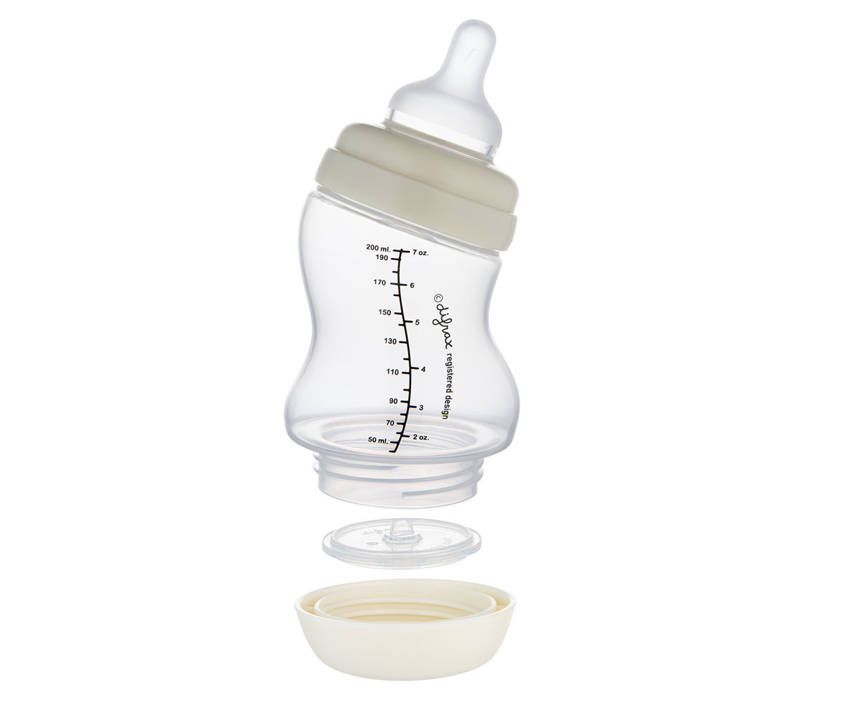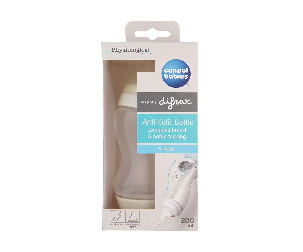 Специалното антиколик шише със S-форма Canpol babies от Difrax е създадено с цел ефективно подпомагане на родителите при първото хранене и намаляване на коликите. Шишето със S-форма, проектирано от Difrax, има уникален дизайн и специален антиколик механизъм. Формата на шишето гарантира, че биберонът остава пълен с мляко във всяка позиция, дори при лек наклон (20 градуса). То поддържа така нареченото ротационно хранене – когато родителят сменя позициите през деня (настрани, лице в лице, класическа позиция), а правилната поза при хранене е един от ключовите фактори за намаляване на честотата на коликите. Антиколиковият клапан и отворите в основата позволяват на въздуха да излиза от бутилката, осигурявайки постоянен поток от мляко и позволявайки на бебето да пие непрекъснато, без да поглъща въздух. Комбинацията от тези две функции създава изключително ефективна антиколик система – ефективно елиминира въздуха от бутилката и биберона, намалявайки риска от колики, спазми и друг коремен дискомфорт. Ергономичната форма на шишето прави храненето по-удобно както за бебето, така и за възрастния. При хранене със S-образното шише, родителят интуитивно заема естествена и правилна позиция, а бебето не трябва да накланя прекалено главата си – нещо особено важно в етапа на самостоятелно хранене с шише. Физиологичният биберон е мек и наподобява майчината гърда, което улеснява комбинираното кърмене и хранене с шише. Изработен е от хипоалергенен, без мирис, матов силикон – лесно се приема от децата. Вътрешните ребра на биберона предотвратяват неговото слепване и прегъване по време на хранене. Благодарение на свалящата се основа, шишето със S-форма е изключително лесно за разглобяване и почистване.