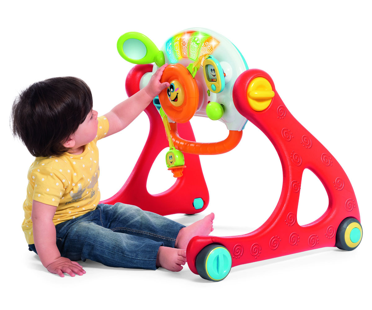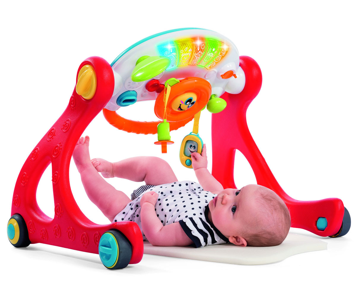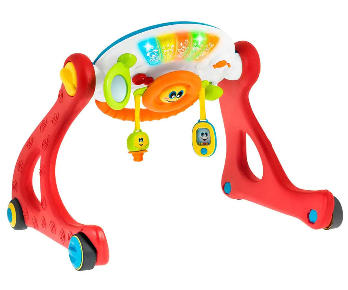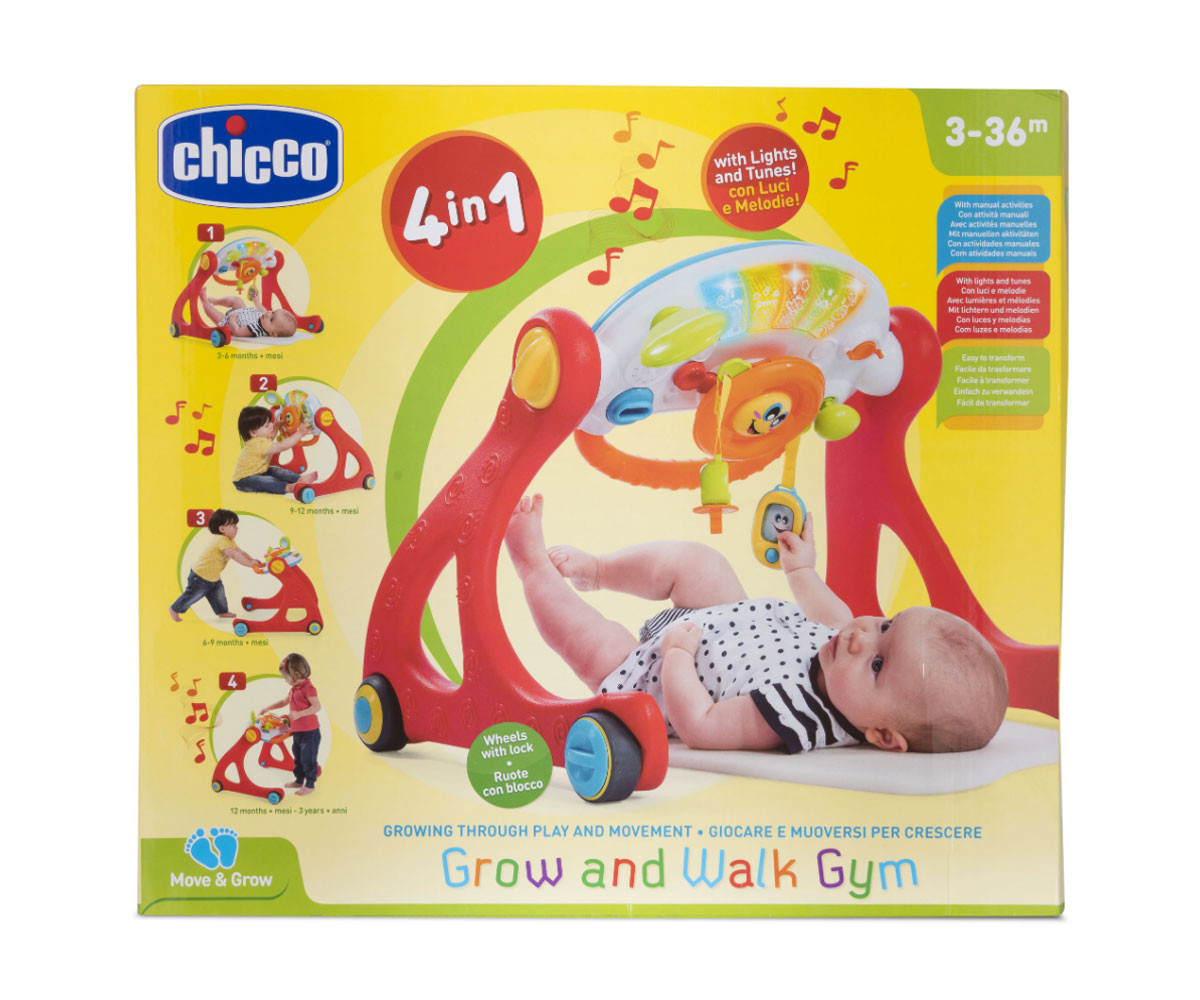 Chicco 4in1 Grow and Walk Gym, пълен с ръчни дейности, светлини и мелодии, придружава двигателното развитие стъпка по стъпка от 3 месеца до 3 години, благодарение на своите 4 игрови конфигурации Чрез премахване на долните части, които поддържат продукта, електронният панел може да се използва и отделно за игра на игри задните колела са с предпазна система, която се блокира и позволява на детето да играе, ходи и се забавлява безопасно.