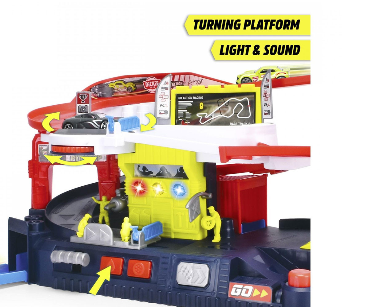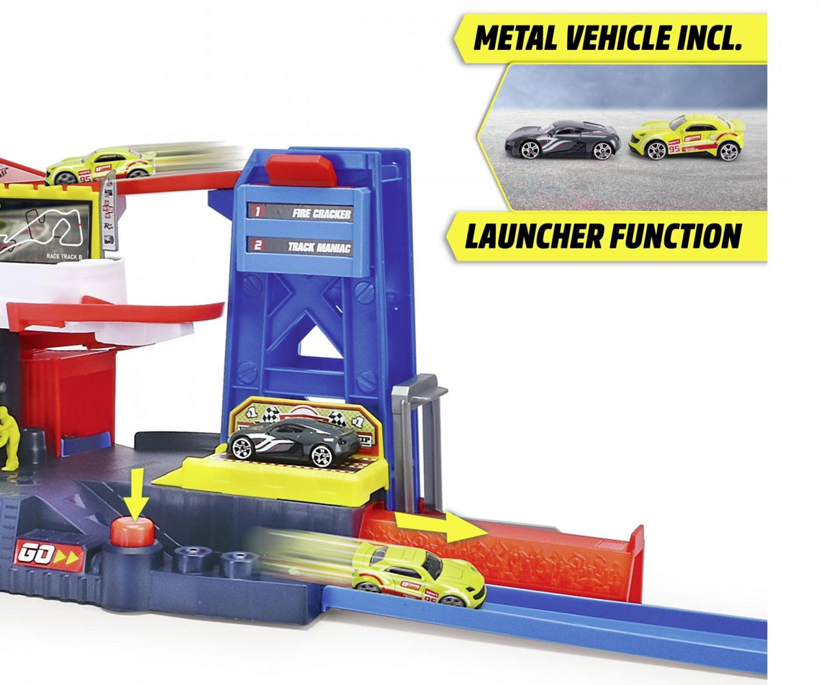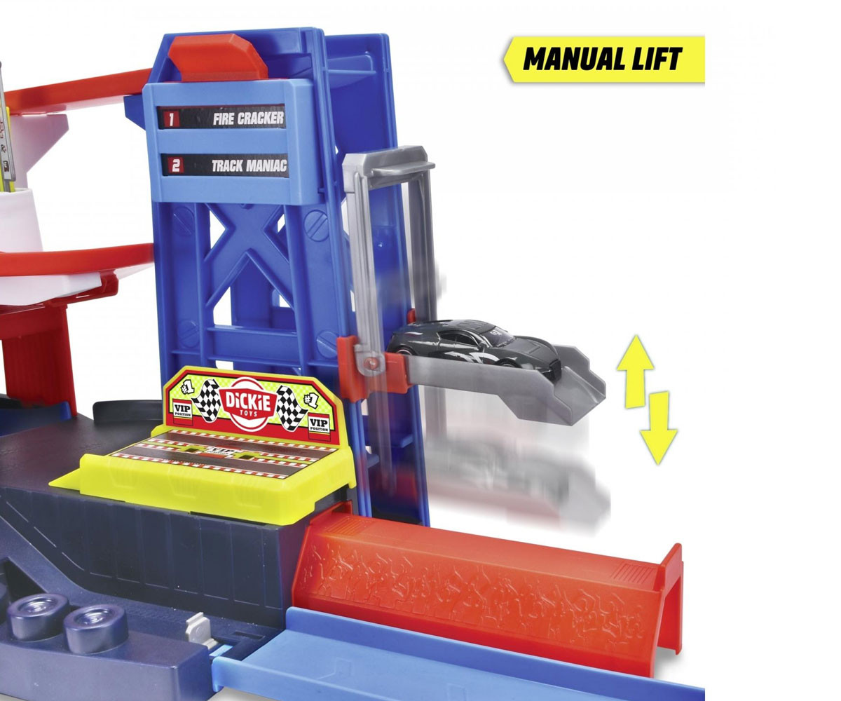 Децата могат да използват ръчния подемник, за да повдигнат автомобила, да го въртят на платформата или да го изстрелят на пистата с натискане на бутон. Комплектът е оборудван с различни елементи, които не само осигуряват часове забавление, но и развиват фината моторика и координацията на движенията.