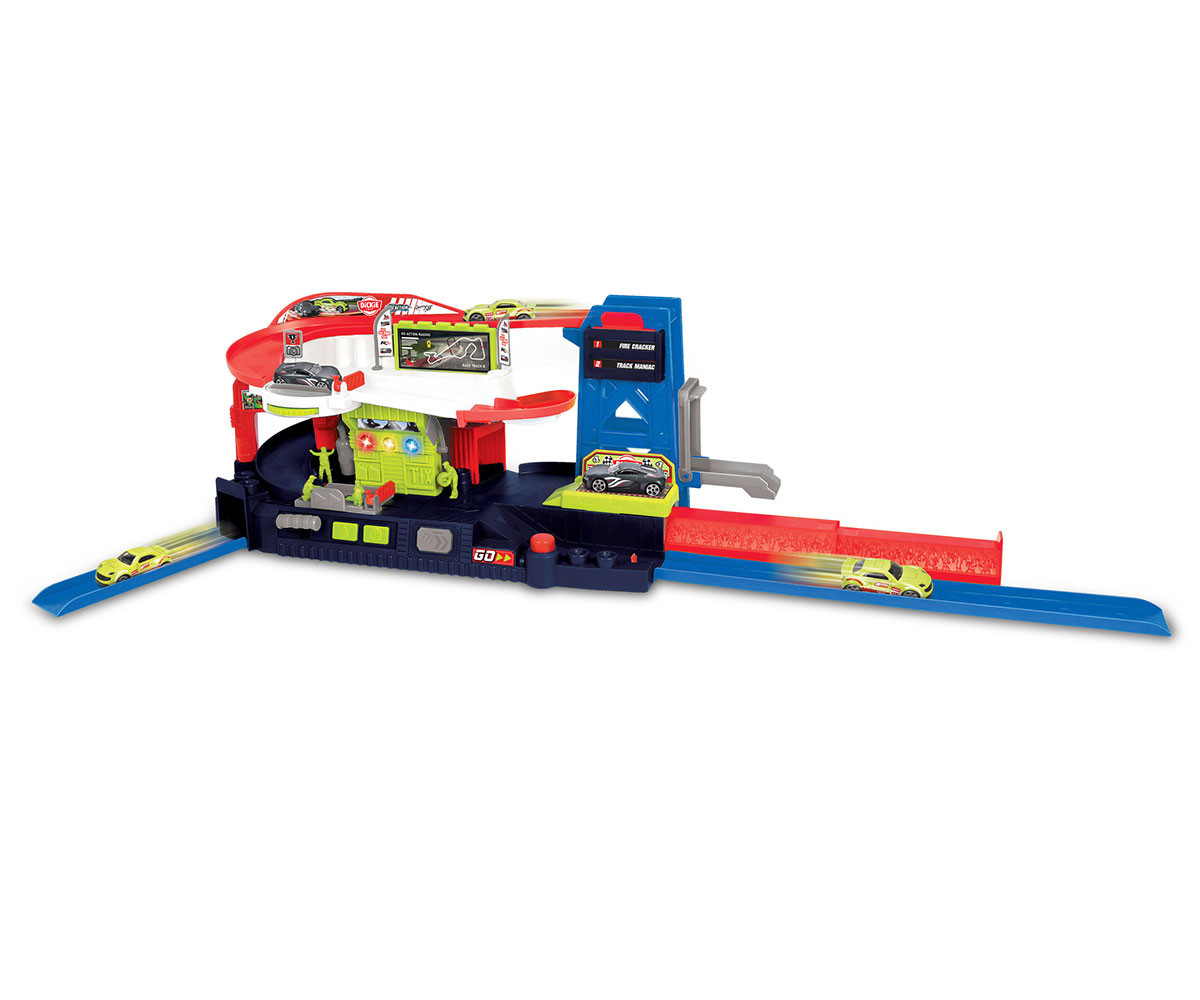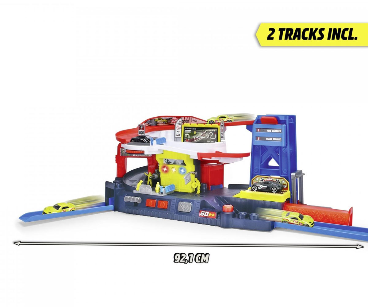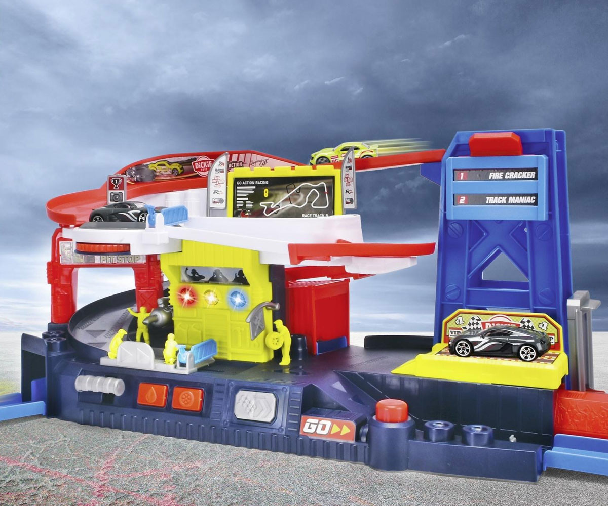 Децата могат да използват ръчния подемник, за да повдигнат автомобила, да го въртят на платформата или да го изстрелят на пистата с натискане на бутон. Комплектът е оборудван с различни елементи, които не само осигуряват часове забавление, но и развиват фината моторика и координацията на движенията.