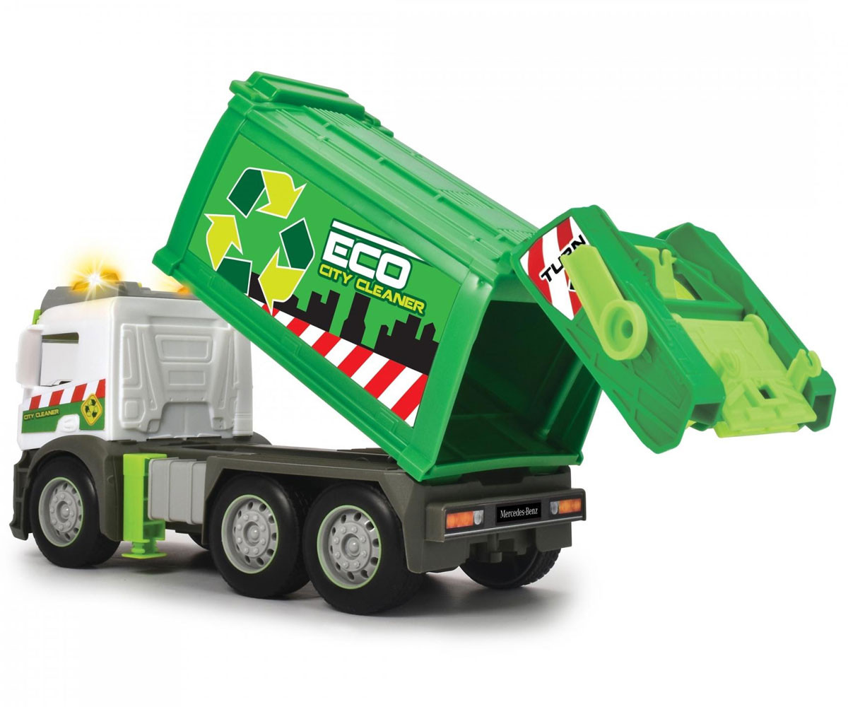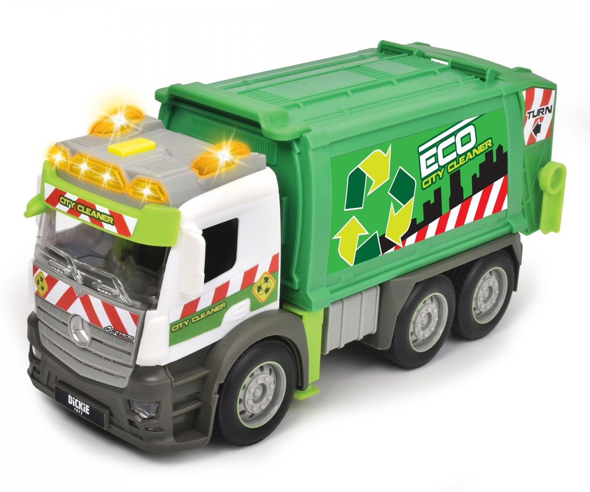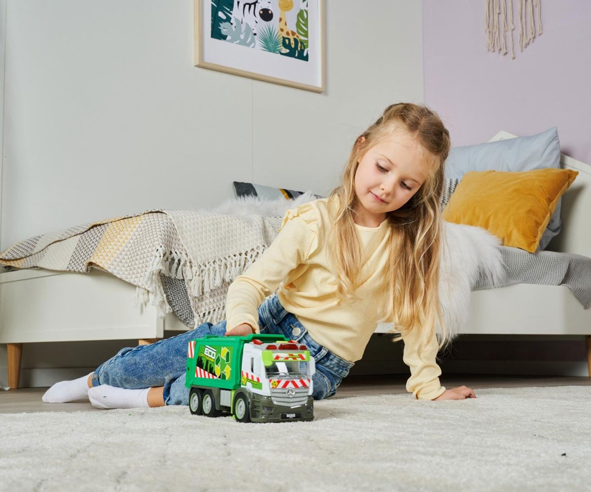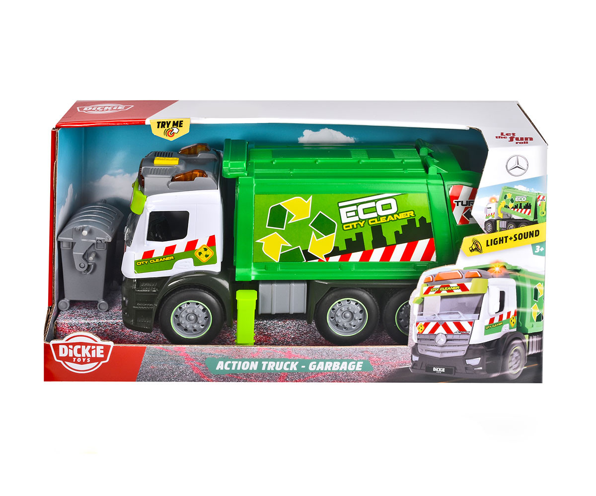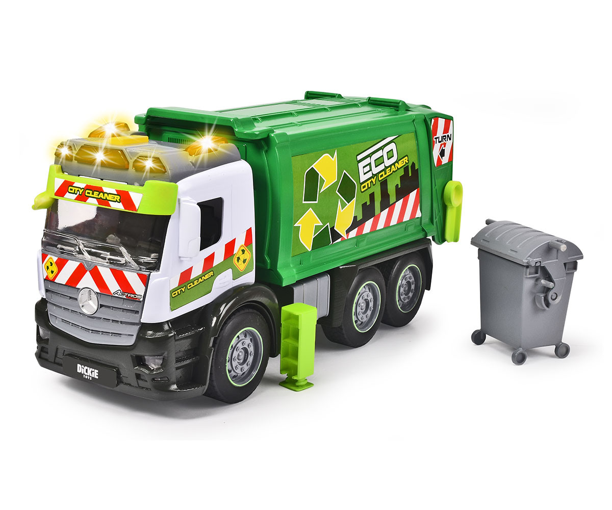 Време е за събиране на отпадъците – с реалистичния камион за боклук на Dickie Toys! Малките почитатели на специализирани превозни средства ще бъдат възхитени от този реалистичен модел на камион за отпадъци, вдъхновен от истинските Mercedes Actros камиони. Със своя автентичен дизайн, светлинни и звукови ефекти, подвижни части и функция за повдигане и изсипване на кофа, тази играчка ще превърне всяка игра в истинско приключение!