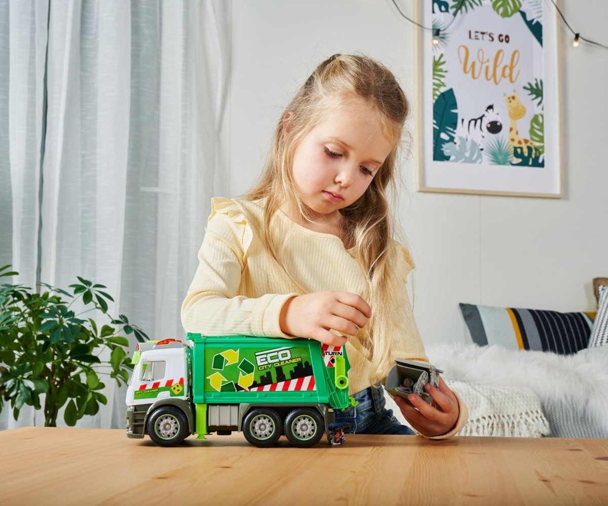 С този камион децата могат да пресъздадат истински сцени от града, да сортират отпадъци, да разиграват работата на сметосъбирач и да се забавляват часове наред. Играта развива фина моторика, координация и ролеви умения.