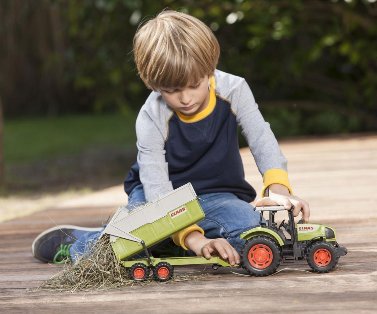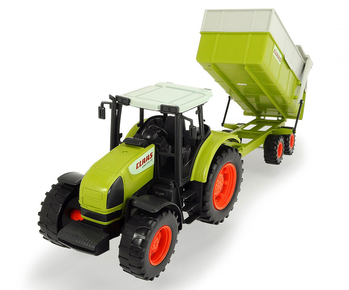Фермерски приключения на четири колела – трактор с ремарке за разтоварване! Когато петелът пропее, е време да се качим на трактора и да излезем на полето. Жътва, товарене и доставка – фермерът никога не почива, а влага цялото си сърце и усилия в работата си. Dickie Toys Farm Tractor помага на малките фермери да започнат своите приключения още в детската стая. Тракторът е изработен по модела на Claas и впечатлява с реалистичен дизайн. Подвижните части осигуряват много възможности за игра и едновременно стимулират развитието на фината моторика у децата. Ремаркето с функция за разтоварване позволява бързо и лесно товарене и разтоварване – точно както в истинска ферма. Комплектът от серията Farm е чудесна идея за подарък и превръща играта у дома в малко фермерско приключение, като запознава децата с живота на село.