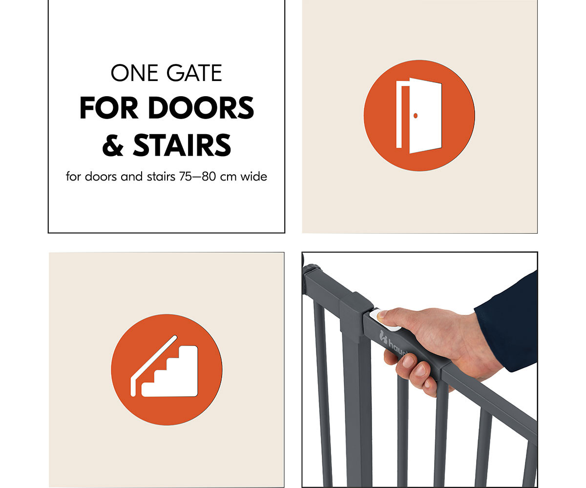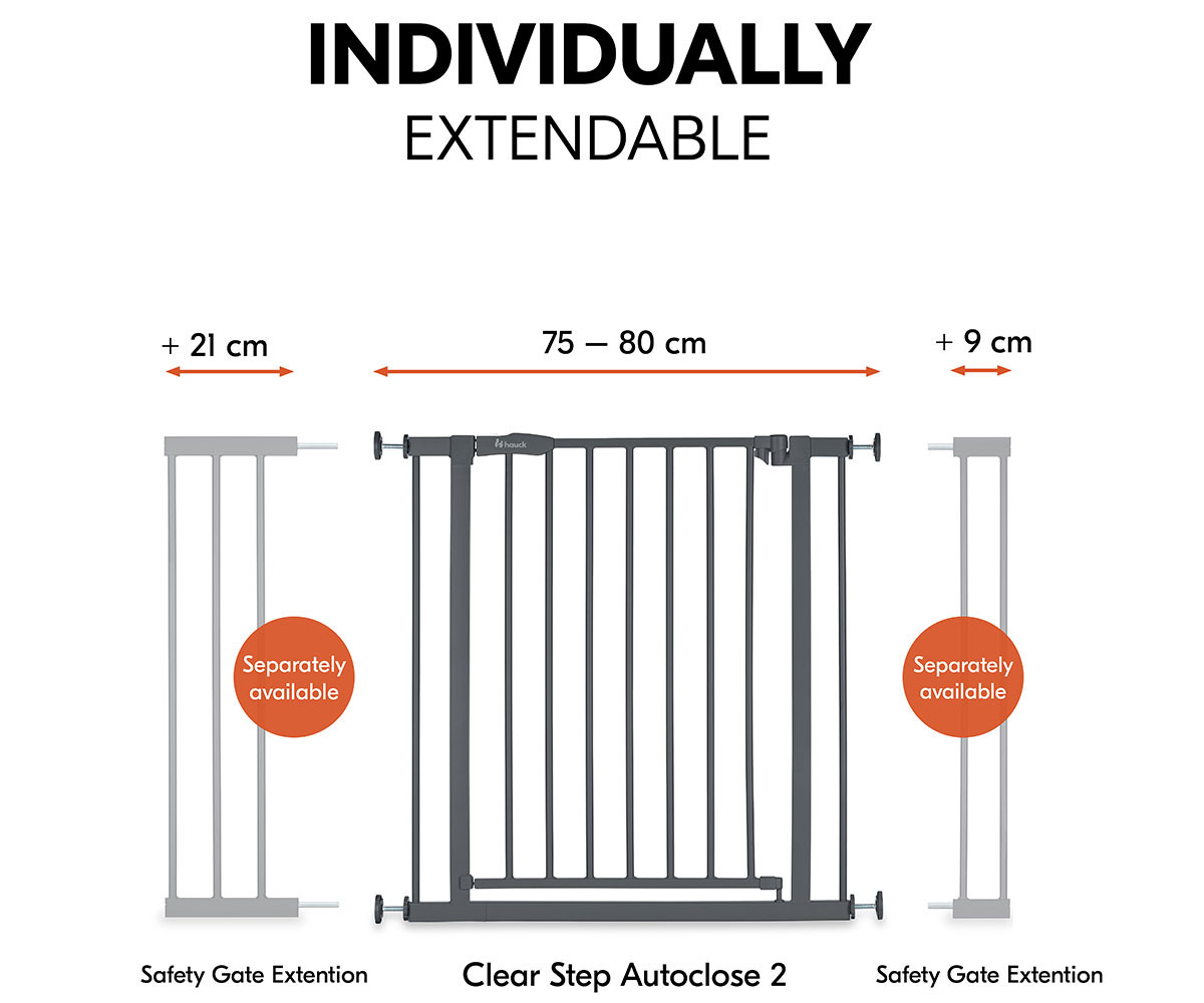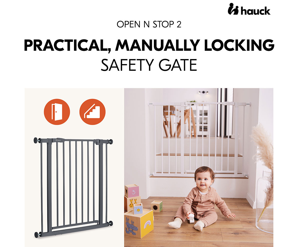 Практична, ръчно заключваща се преграда за врати и стълби. Щом детето ви започне да се движи, преградите за стълбища и врати са незаменими и помагат да запазите бебето си в безопасност. Независимо дали сте у дома, при баба и дядо или на почивка, вратата с клипс е здраво прикрепена с регулиращи винтове чрез натиск и може да бъде премахната без да оставя следи. Преградата може да се отваря с една ръка от двете страни и е лесна за затваряне. Open N Stop 2 е подходяща не само за отвори със стандартна ширина от 75–80 см, но може да бъде удължена до 122 см с помощта на отделно наличните удължения от 9 см и 21 см (можете да ги закупите тук).