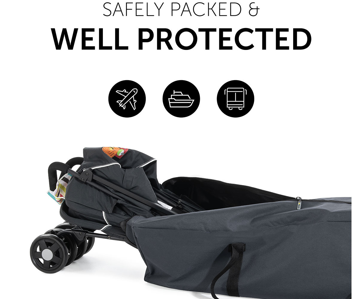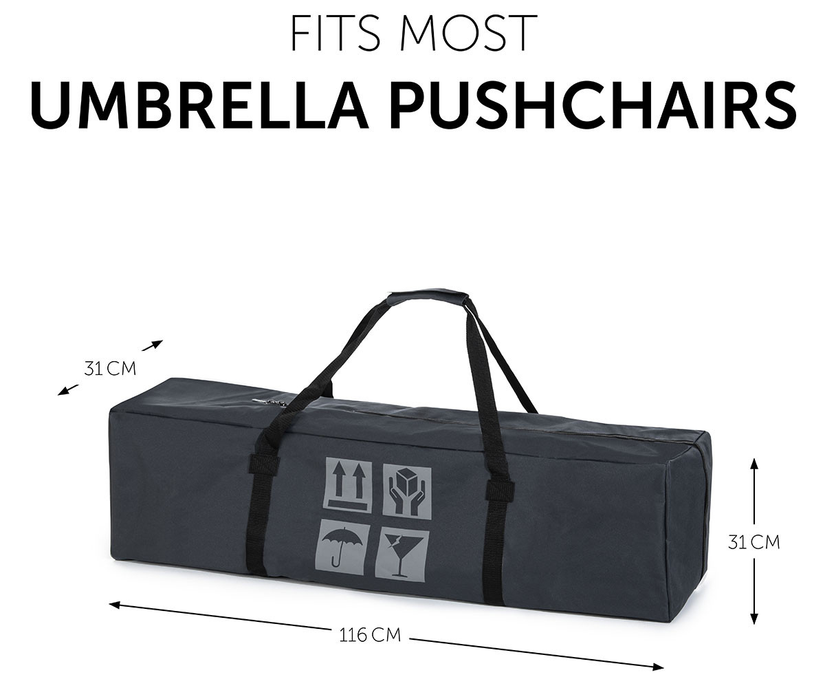 Чанта за пренасяне на сгъваема количка тип „чадър“. Независимо дали пътувате със самолет, автомобил, кораб или влак - с тази просторна чанта вашата количка ще бъде сигурно прибрана и надеждно защитена от повреди. Освен това предпазва багажника от замърсяване и влага. Подходяща за повечето модели сгъваеми колички тип „чадър“. Изработена от изключително издръжлив, висококачествен и водоустойчив материал. Здравият цип гарантира дълъг експлоатационен живот. Благодарение на допълнително дългата регулируема презрамка можете да носите чантата удобно през рамо или в ръка.