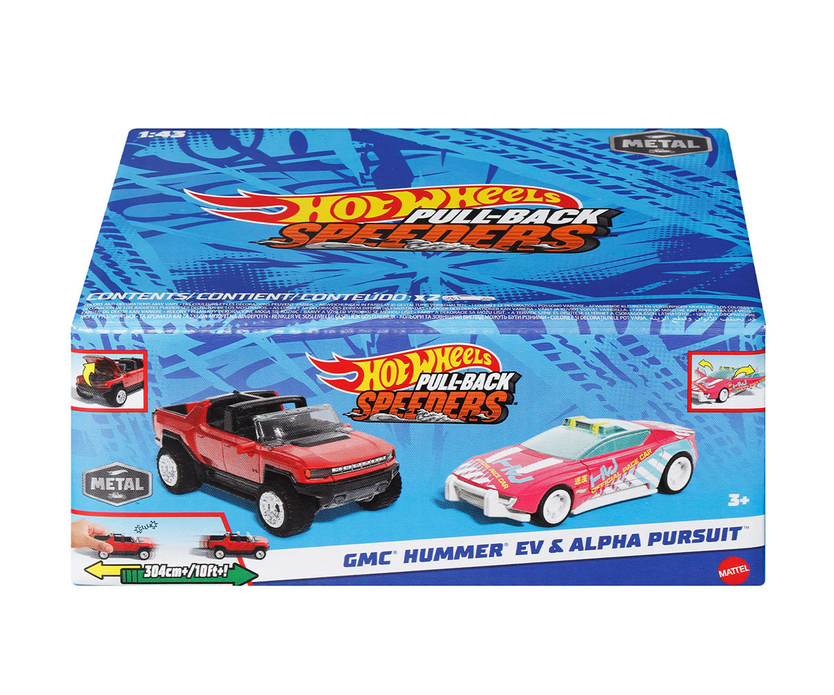 Пригответе се за състезание с Hot Wheels Pull-Back Speeders комплект от 2! Тези по-големи метални коли Hot Wheels са в мащаб 1:43 с автентичен дизайн. Всяко превозно средство включва интерактивна функция, като например такава, която подчертава работещия двигател или отварянето на вратите, капака или багажника. С такъв модерен дизайн екшън историите са безкрайни и децата и колекционерите ще искат да ги съберат всички! Всеки комплект се продава отделно в зависимост от наличността. Цветовете и дизайните могат да варират.