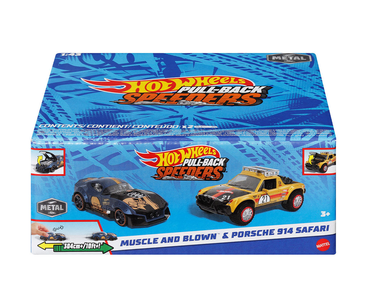 Пригответе се за състезание с Hot Wheels Pull-Back Speeders комплект от 2! Тези по-големи метални коли Hot Wheels са в мащаб 1:43 с автентичен дизайн. Всяко превозно средство включва интерактивна функция, като например такава, която подчертава работещия двигател или отварянето на вратите, капака или багажника. С такъв модерен дизайн екшън историите са безкрайни и децата и колекционерите ще искат да ги съберат всички! Всеки комплект се продава отделно в зависимост от наличността. Цветовете и дизайните могат да варират.