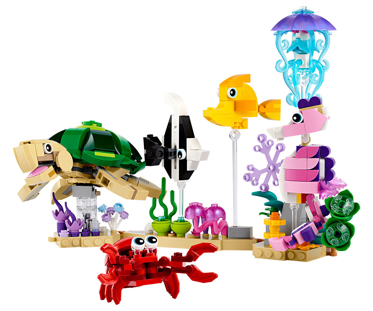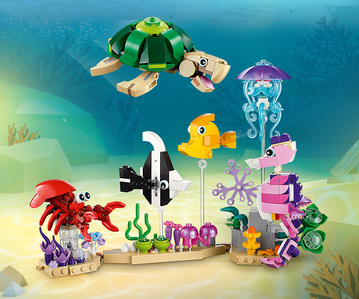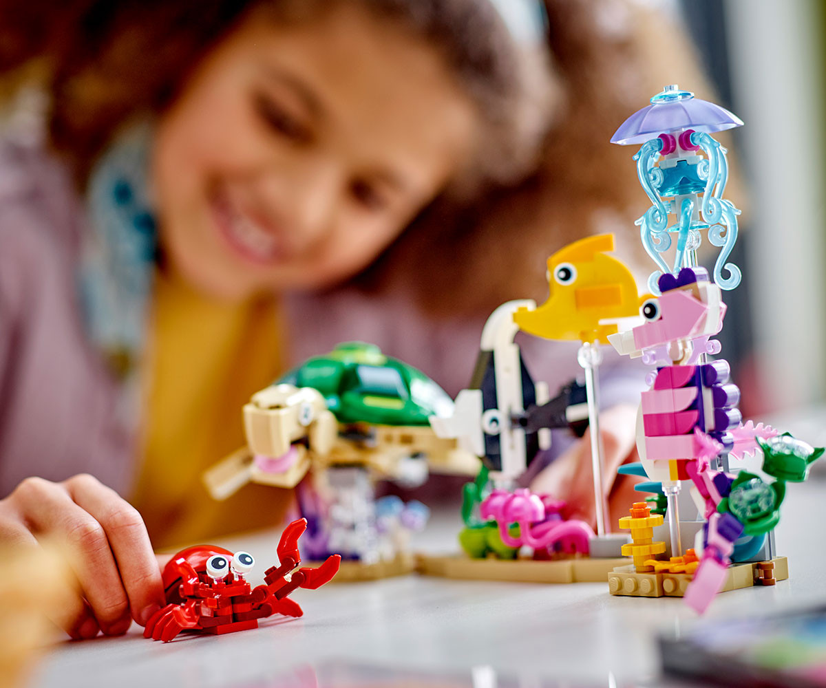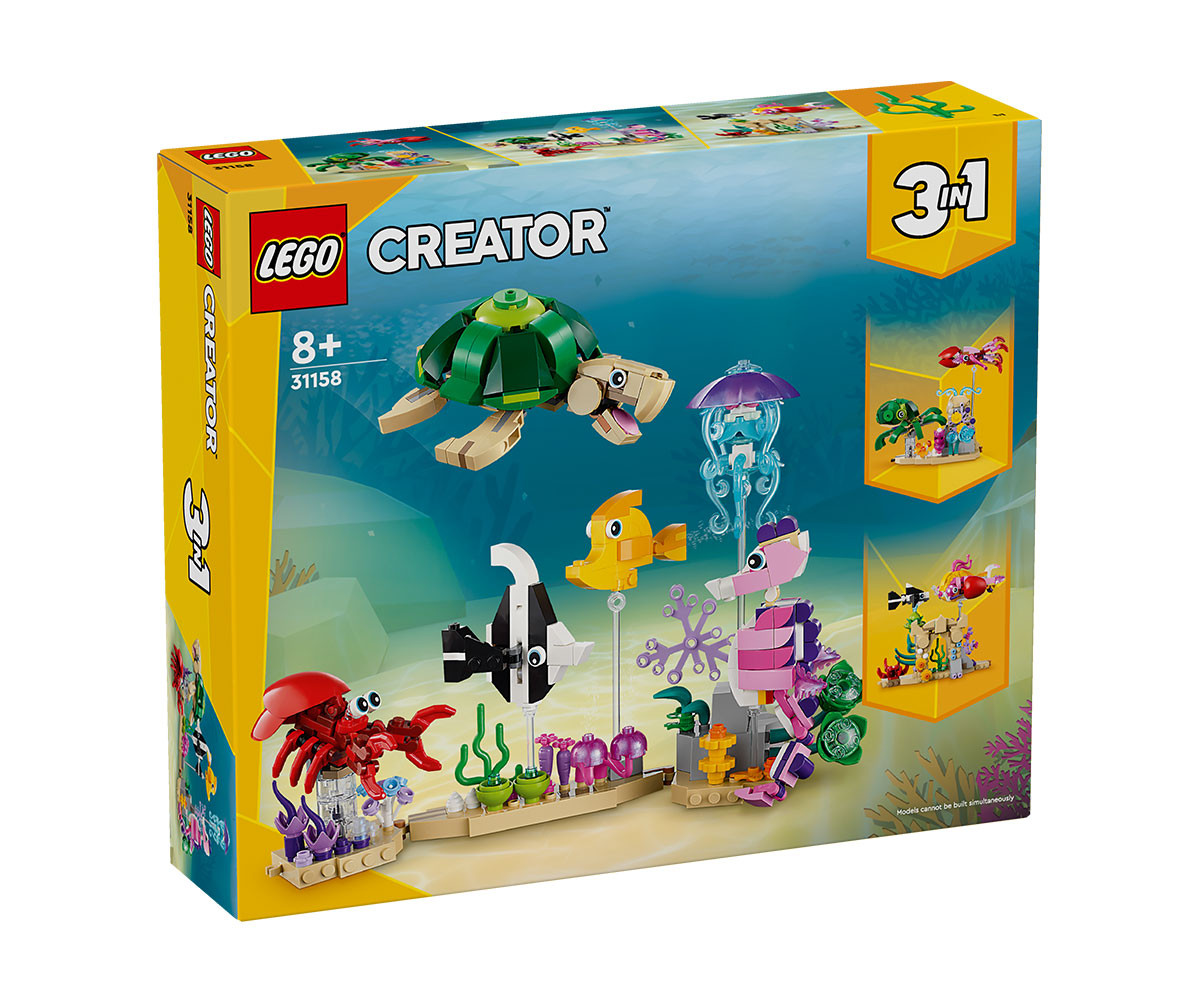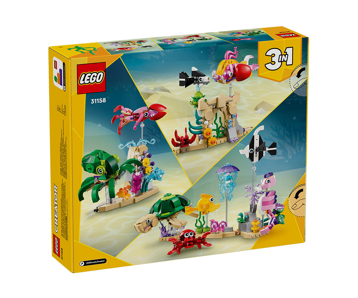 Момчета и момичета на възраст над 8 години могат да строят, играят и излагат на показ пъстрия строителен комплект LEGO® Creator Морски животни „3 в 1“ (31158). Той включва 2 риби, костенурка, медуза и морско конче, изложени на прозрачни пръчки като част от стойка с морското дъно, украсена с морски растения, плюс фигура на червен рак. Морските обитатели могат да разменят позициите си на стойката, която може да бъде поставена изправена или под ъгъл. Феновете на LEGO могат да избират от 3 различни подводни сцени за конструиране с комплекта за игра „3 в 1“. Те могат да построят колекция от 6 морски животни със стойка с морско дъно, да я променят в октопод и калмар до бълбукаща вулканична скала или в 2 риби, плъзгащи се около пъстри морски растения. Играчките LEGO Creator „3 в 1“ са страхотен подарък за деца с 3-те различни модела за създаване във всяка кутия. Децата с удоволствие ще строят и променят многократно. Един и същ комплект може да бъде закупен 3 пъти, за да могат децата да се насладят на по-големи приключения и да свързват и играят с всичките 3 модела едновременно.