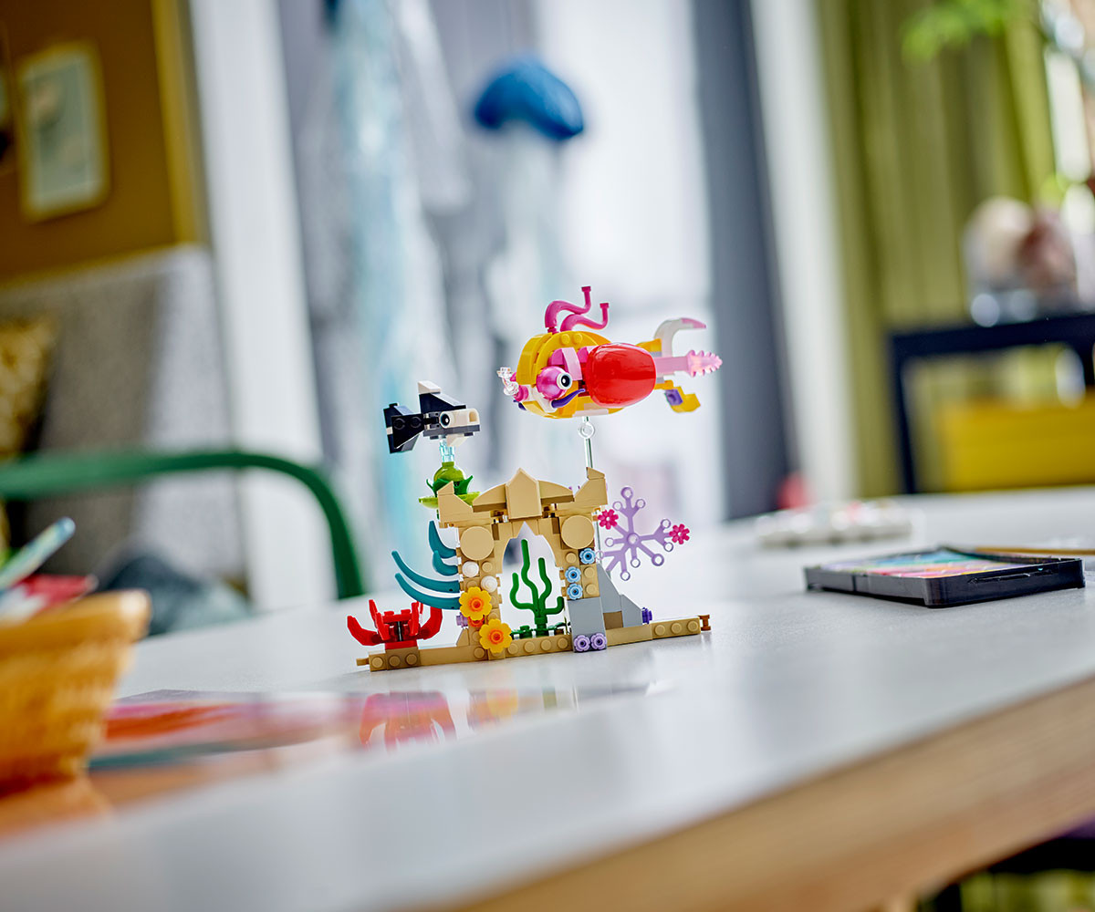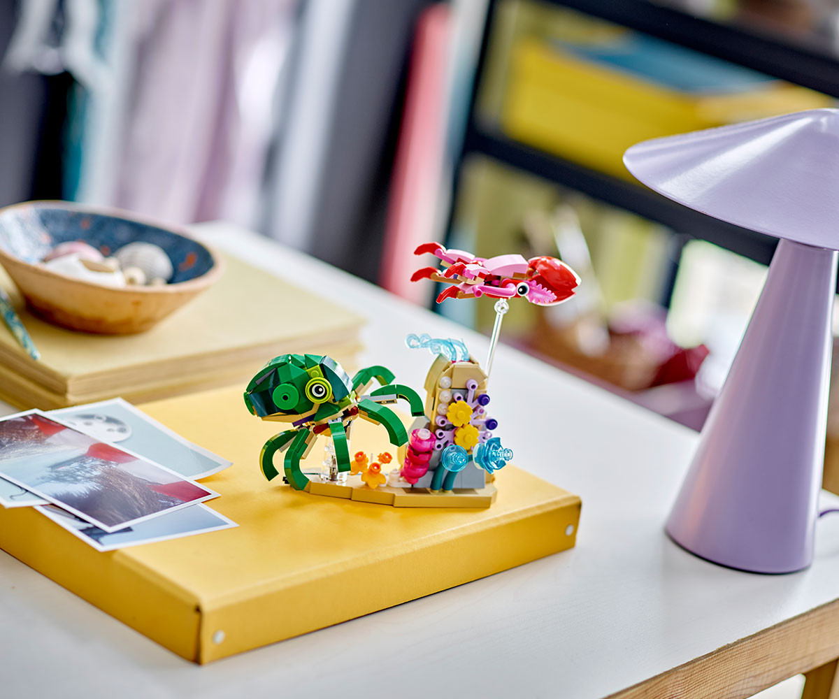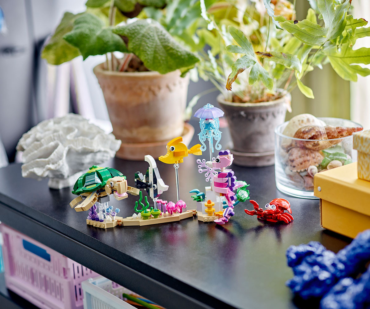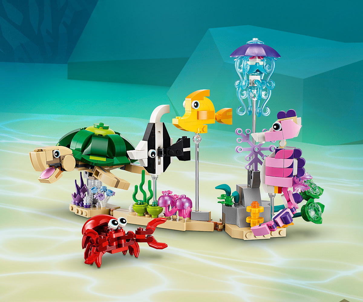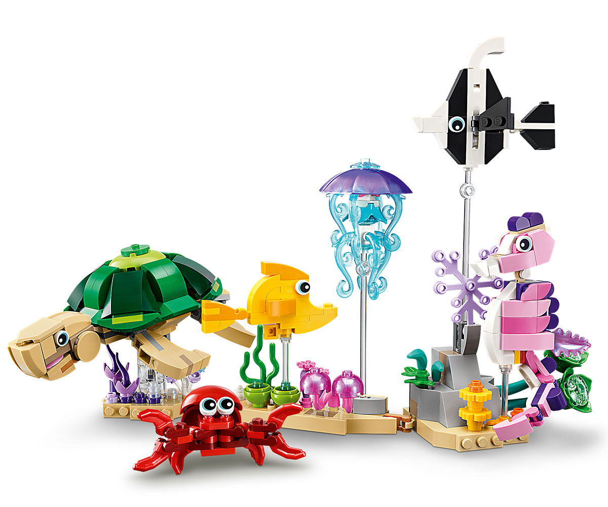 Момчета и момичета на възраст над 8 години могат да строят, играят и излагат на показ пъстрия строителен комплект LEGO® Creator Морски животни „3 в 1“ (31158). Той включва 2 риби, костенурка, медуза и морско конче, изложени на прозрачни пръчки като част от стойка с морското дъно, украсена с морски растения, плюс фигура на червен рак. Морските обитатели могат да разменят позициите си на стойката, която може да бъде поставена изправена или под ъгъл. Феновете на LEGO могат да избират от 3 различни подводни сцени за конструиране с комплекта за игра „3 в 1“. Те могат да построят колекция от 6 морски животни със стойка с морско дъно, да я променят в октопод и калмар до бълбукаща вулканична скала или в 2 риби, плъзгащи се около пъстри морски растения. Играчките LEGO Creator „3 в 1“ са страхотен подарък за деца с 3-те различни модела за създаване във всяка кутия. Децата с удоволствие ще строят и променят многократно. Един и същ комплект може да бъде закупен 3 пъти, за да могат децата да се насладят на по-големи приключения и да свързват и играят с всичките 3 модела едновременно.