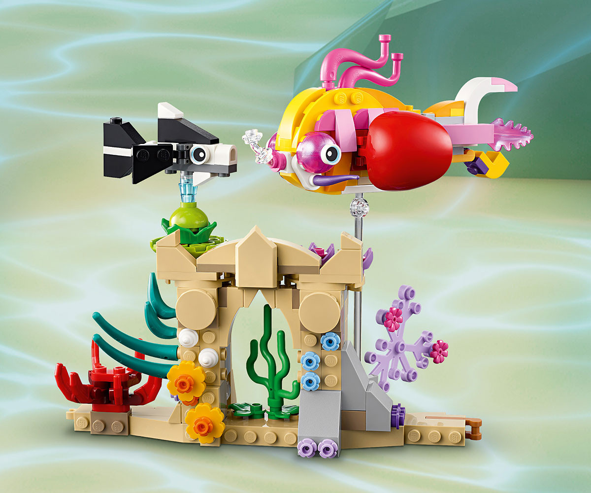 - Създайте сцена с риби от LEGO® – децата могат да проявят креативност и да разменят местата на морските животни върху техните прозрачни пръчки и да променят позицията на стойката с морско дъно от изправена на под ъгъл;
