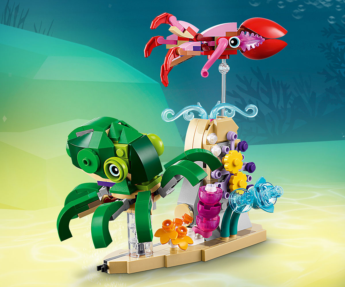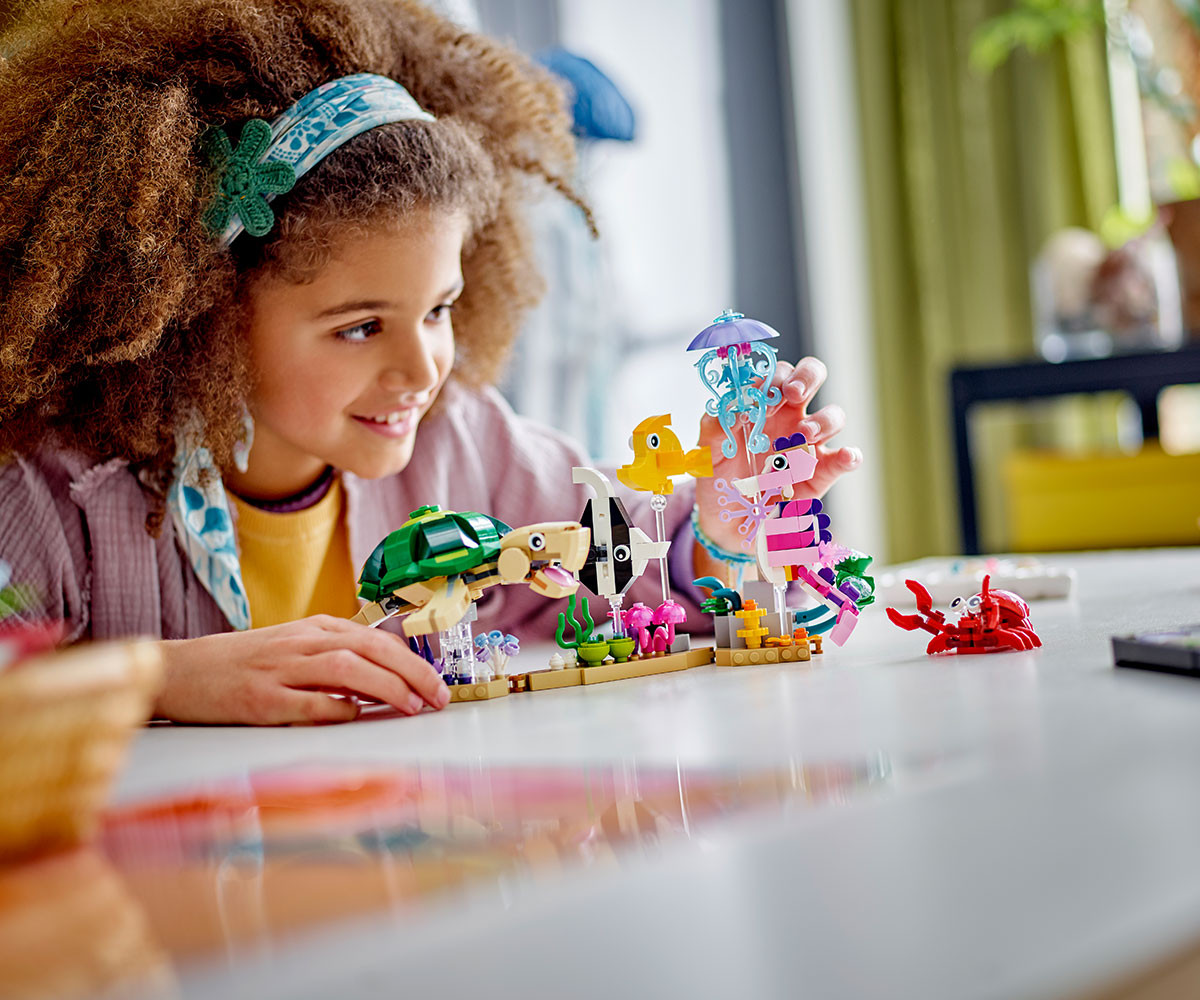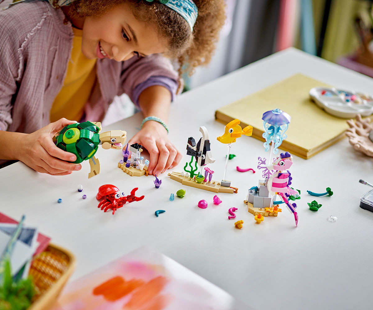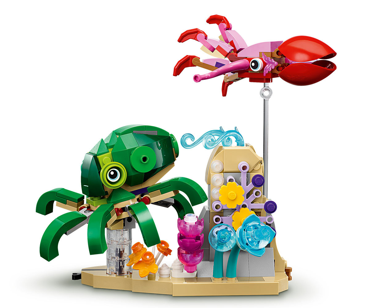 Децата могат да разиграват ролеви подводни истории със строителния комплект LEGO® Creator Морски животни „3 в 1“, включващ морско конче, костенурка и рак.