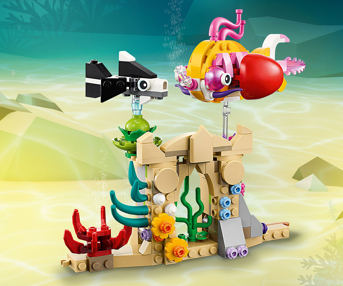 - Безкрайни възможности за игра – децата могат да се наслаждават на забавни истории с 3 различни комплекта за игра: първата конструкция включва 6 фигури на морски животни, които могат да бъдат променени в октопод и калмар или 2 цветни риби;