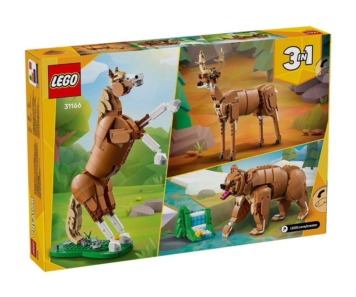 Отдайте се на забавни приключения с три различни невероятни животни. Вижте как красив кафяв кон със светла грива тича през тревата, преди да се изправи на задните си крака. За още занимания с животни го престройте в кафява мечка, която си играе домалък водопад, или в елегантен елен с величествени рога. Кое животно ще построите? Изборът е ваш с този невероятен комплект „3 в 1“.