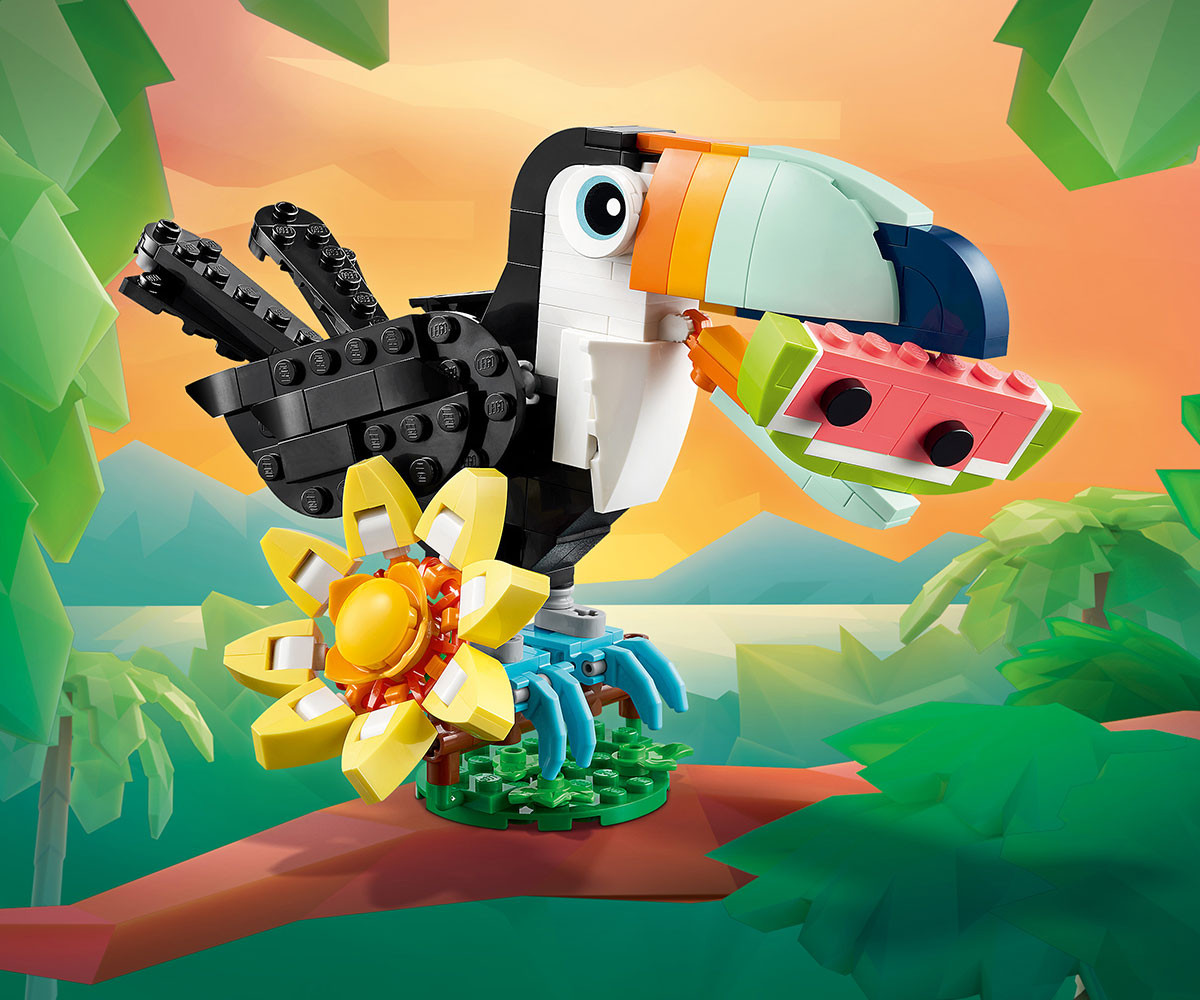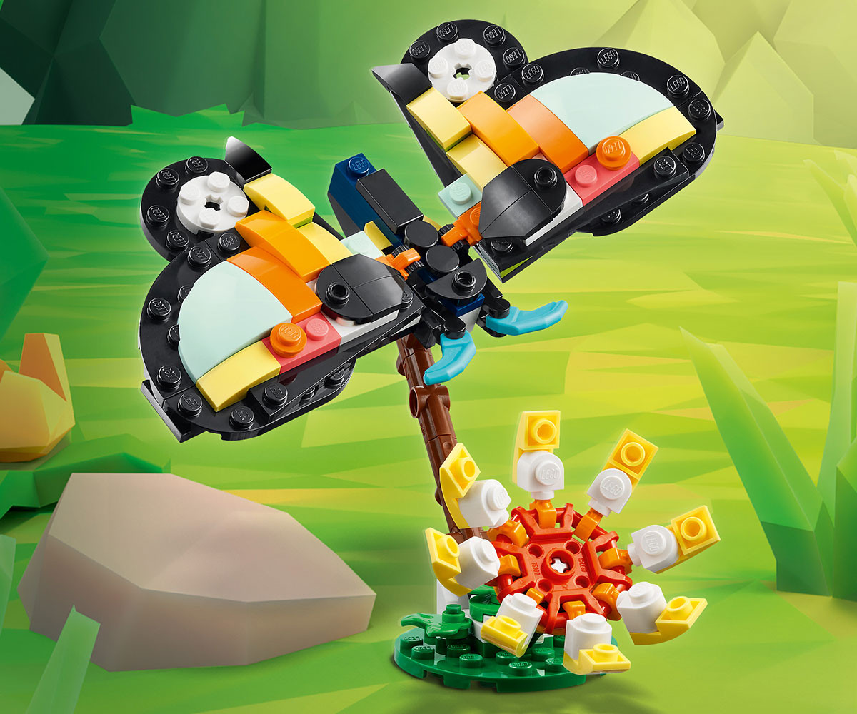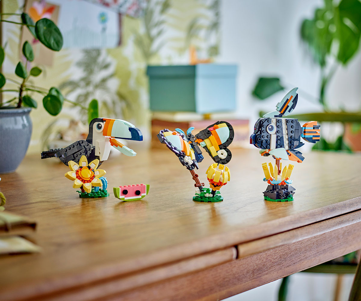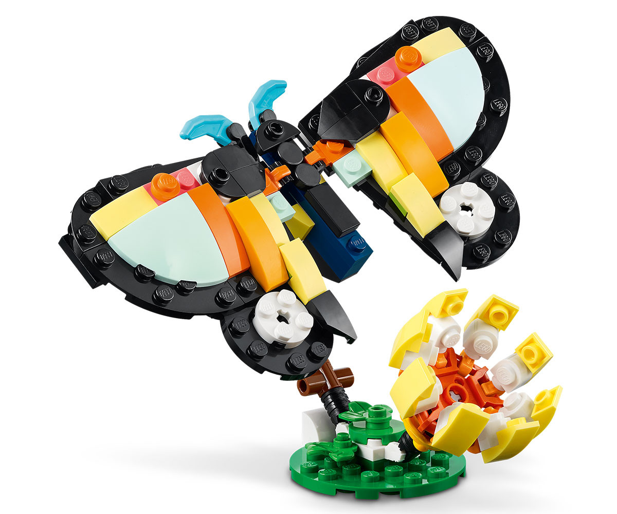 Децата могат да посетят тропиците с комплекта LEGO® Creator Диви животни: Тропически тукан „3 в 1“, а после да го променят в пеперуда или риба.